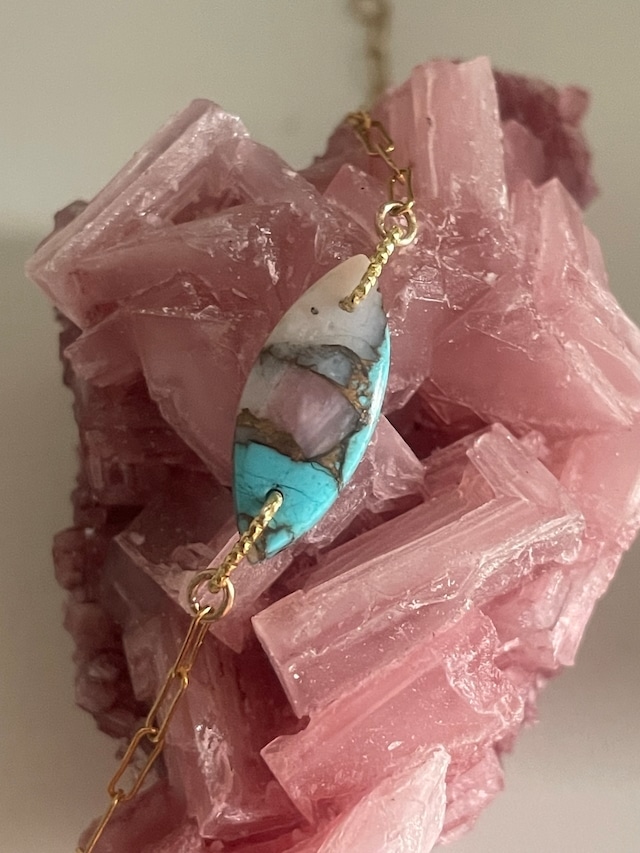 メディスンジュエリーに初のブレスレットが登場! ツーソンミネラルショーで買い付けたキングマンターコイズのルースは、キングマンターコイズ、スピ二オイスター、コッパー(銅)を組み合わせ、ハンドメイドで作られています。 大地と空のエネルギーを繋ぐ、キングマンターコイズのブレスレット✨️ 鮮やかなターコイズブルーにピンクパープルやホワイトのスピにオイスターの差し色が織りなす美しい一粒。大地と空が交わる瞬間を切り取ったかのような、キングマンターコイズのブレスレットです。 アメリカ・アリゾナ州のキングマン鉱山で採掘されるこのターコイズは、古くから「旅人の守護石」として大切にされてきました。行動力と勇気を高め、持ち主の進む道を明るく照らすといわれています。 「揺るぎない自分を確立し、新たな冒険へ。」 大地の安定感と自由な魂のエネルギーをもたらし、未来へと前進するあなたを力強くサポートするジュエリーです。心の羅針盤となり、内なる声に耳を傾けながら進むための守護石に♡ ✦キングマンターコイズ アメリカのアリゾナ州キングマン鉱山で採掘される高品質のターコイズ。キングマン鉱山は世界でも最も古いターコイズ鉱山の一つとして知られ、その美しい青色のターコイズは世界中で高く評価されています。古代の戦士や旅人によってお守りとして用いられ、悪霊やネガティブなエネルギーから守るとされていました。 ✦スピニオイスター カラフルで美しい貝殻を持つ貝の一種で、ジュエリーや装飾品として用いられる。特にネイティブアメリカンの伝統的なジュエリーでよく見られ、ターコイズと組み合わせたデザインが人気。何世紀にもわたり、ネイティブアメリカンの文化では、スピニオイスターは装飾やお守りとして使用されてきました。活力、情熱、自己表現を象徴し、その明るい色はエネルギーを高め、持ち主の創造力や直感を刺激すると信じられています。 長さ:全体で18cmです。チェーンのお好きな場所に引き輪をつけられます。 ✦こんな方におすすめ✦ 新しいことに挑戦したい方 旅や移動が多い方の守護として 自信を持って自己表現したい方 直感を研ぎ澄ませ、正しい道を選びたい方 ✦クリスタルメッセージ✦ ターコイズ「意識の大冒険」 ✦対応星座✦ 獅子座、蠍座、射手座、山羊座、魚座 ✦ストーンを選ぶポイント✦ 感覚で一番ピンとくるクリスタルが、今の自分と共鳴するもの。対応星座やクリスタルの意味などにはこだわらなくてOK。直感で選んだクリスタルが持つ要素が、今のあなたに必要なものです。 ✦ストーンのサイズ感✦ 写真でチャームをセットしてあるカードが名刺サイズです。チャームのサイズ感としてご参考ください。 ーーーーーーー 【メディスンジュエリーfor SELF LOVE】 オーナーが、世界中からひとつひとつ厳選して買い付けたクリスタルを使って、ハンドメイドで作る一点物。店頭人気NOアイテム!インスタストーリーズ投稿でも予約が殺到。 セルフラブのおまもりに♡ ーーーーーーー 【素材】 ターコイズ(アメリカ) スピニオイスター コッパー チェーン&金具:14Kゴールドフィルド 【お手入れについて】 ・チャームの金具部分に水分や汚れがつくと、黒ずみの原因になりますのでお気をつけください。 ・使用後は柔らかい布で拭いて保管してください。 ・メンテナンス(有料)も承りますので、店舗にてご相談ください。 ※店頭在庫と連動しているため、注文時に売り切れている可能性がございますのでご了承ください。