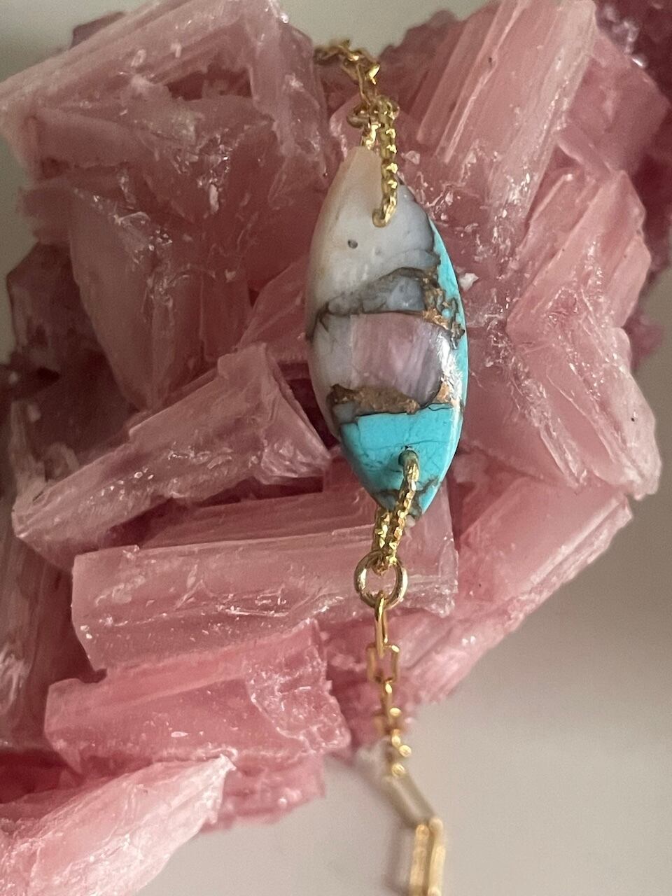 鮮やかなターコイズブルーにピンクパープルやホワイトのスピにオイスターの差し色が織りなす美しい一粒。大地と空が交わる瞬間を切り取ったかのような、キングマンターコイズのブレスレットです。