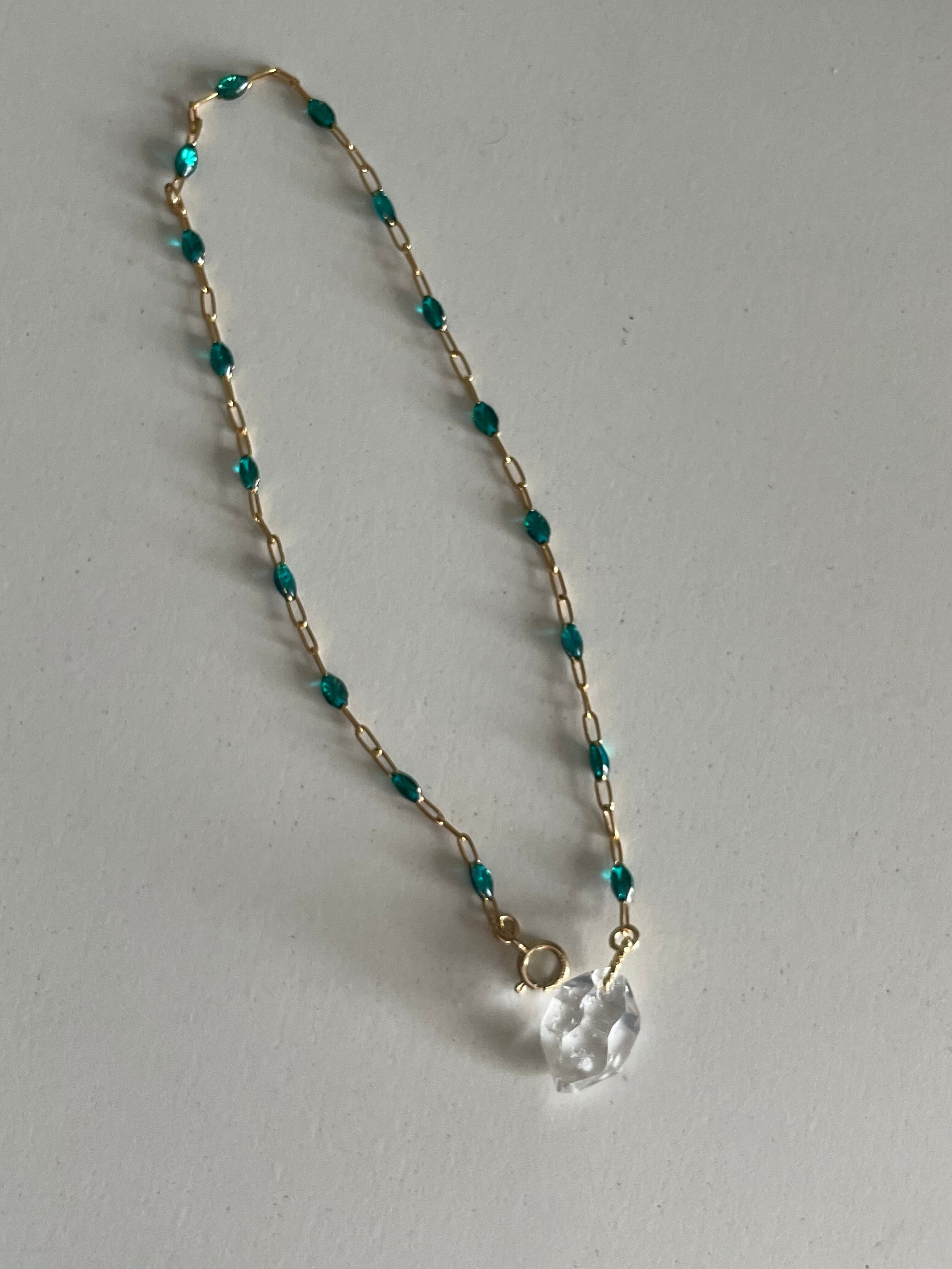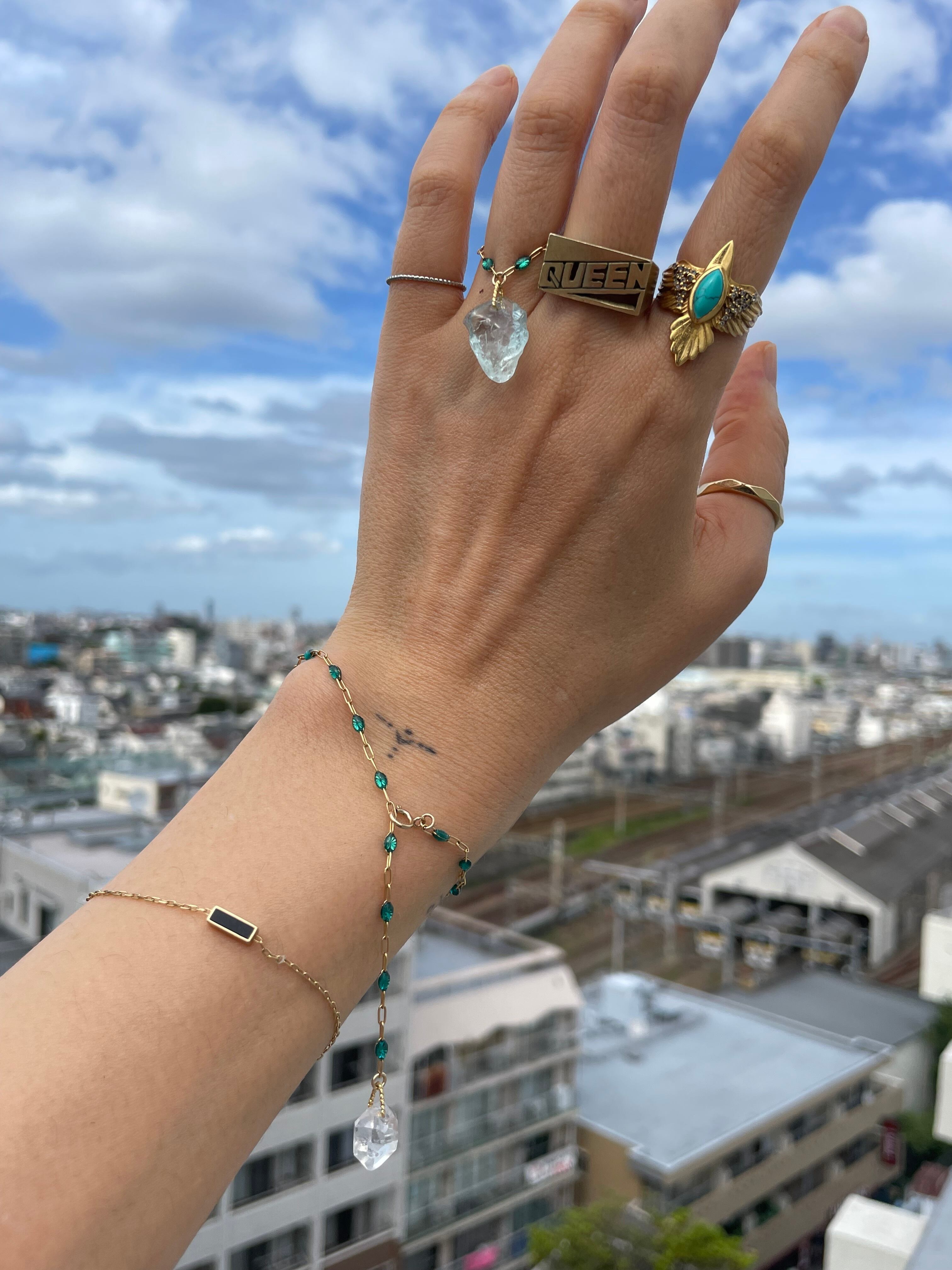 エメラルドビーズがあしらわれた個性的なチェーンはLAのチャームファクトリーから買い付けた限定アイテム。手元をさらに美しく彩ります。