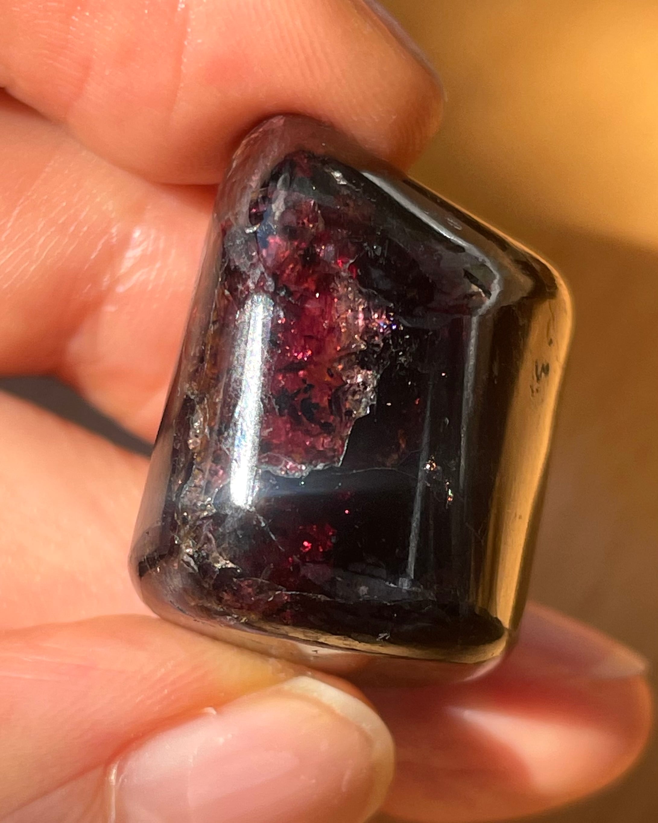 深みのあるワインレッドが印象的な、なめらかでつややかなガーネットのタンブル。