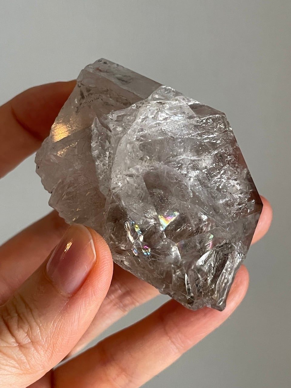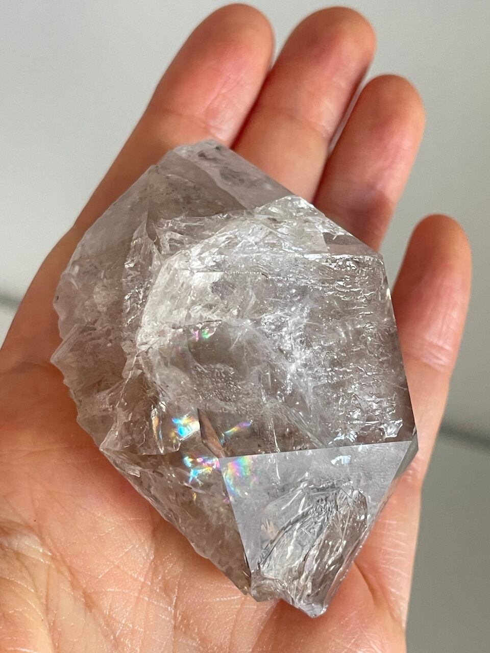 虹が見える、大ぶりのハーキマーダイヤモンド。厳かで、力強い。