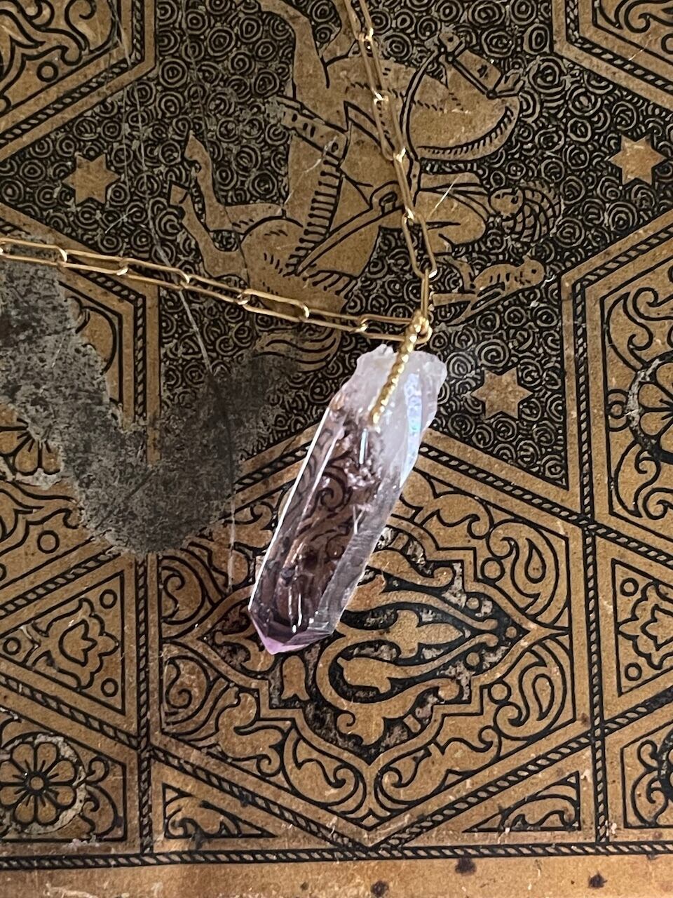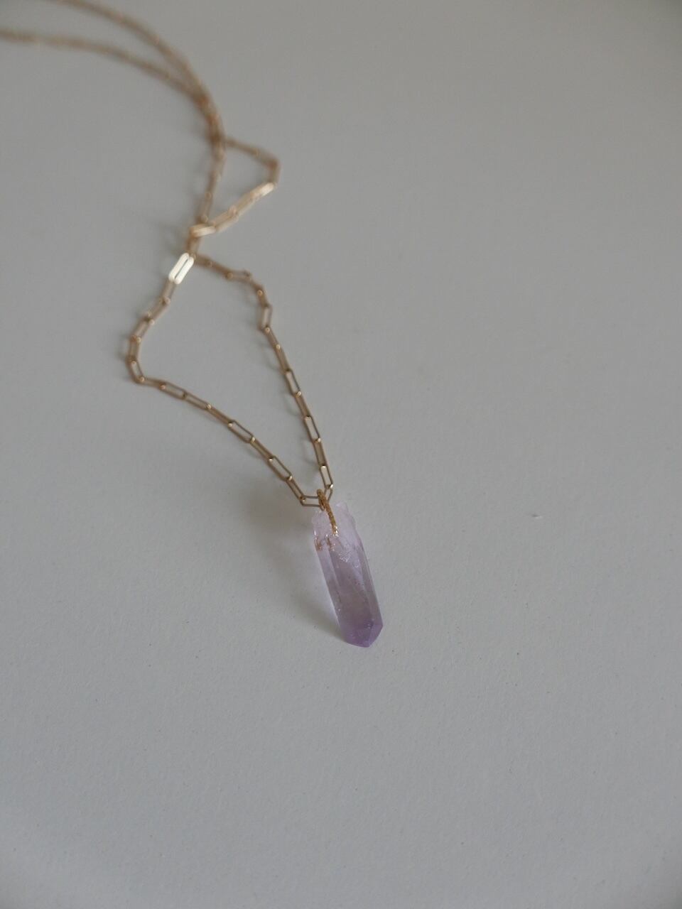 透明感のあるラベンダーカラーが美しい、アメジストクリスタルのポイントをペンダントチャームに。アメジストでも、とても軽やかなバイブレーション。ツーソンミネラルショーで買い付けた一粒です。