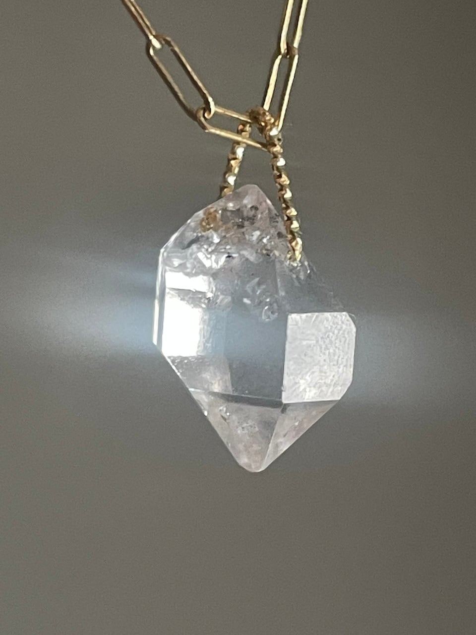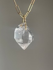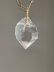 クリアに磨かれた氷片のような透明感。両端が尖るの結晶が、面の切り替えごとに光を鋭く返すヒマラヤ産のハーキマー型クォーツです。内部にはごく細かなヴェールが揺れ、角度によって表情を変化させます。存在感たっぷりの大振りな一粒を贅沢なペンダントチャームに。