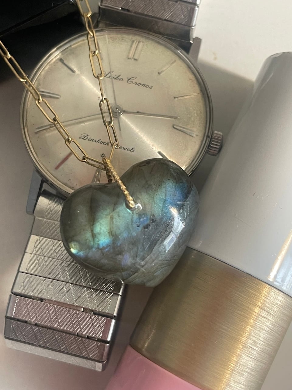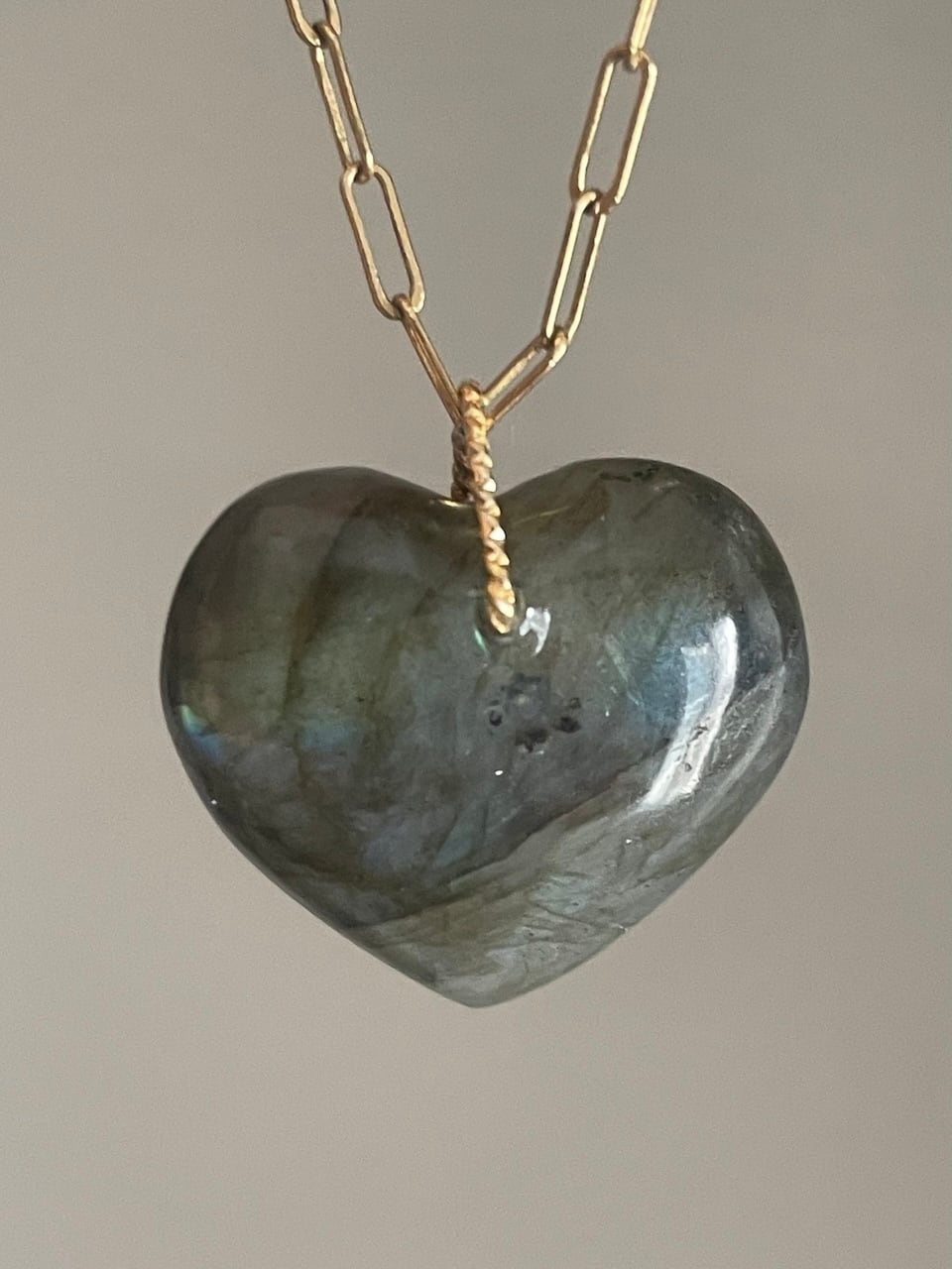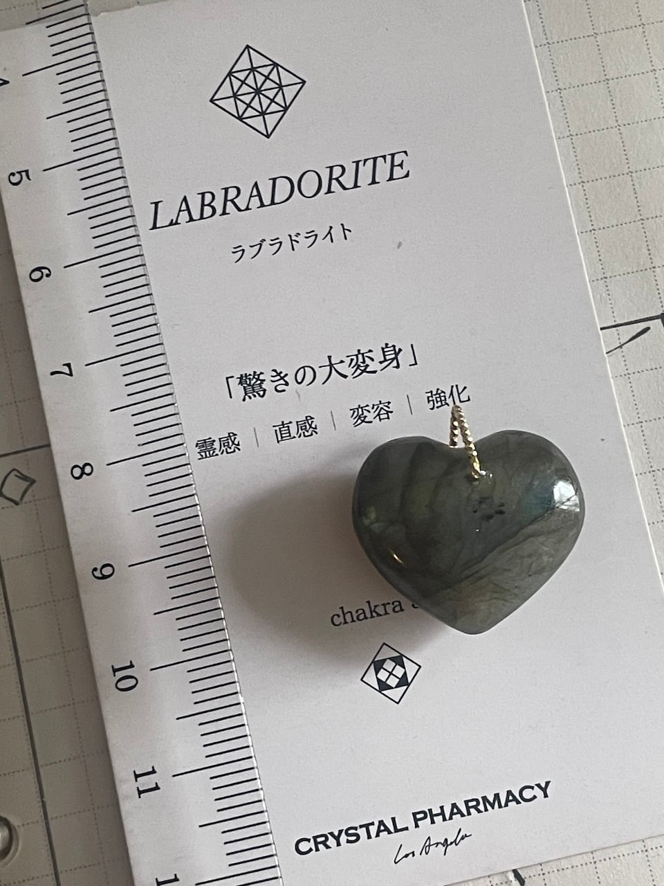 つややかでしっとりとした質感のラブラドライトのハート型をペンダントチャームに。