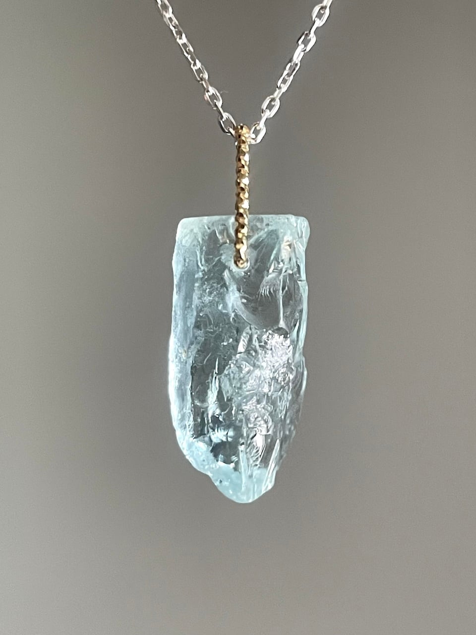 氷の彫刻のように清らかな透明感を湛えた、エンブレムフォルムのアクアマリン原石チャーム。繊細な内包物が光を受けると、静かな波のような煌めきを放ちます。直線と曲線が美しく交わるフォルムに惹かれ、存在感のある一粒としてセレクトしました。