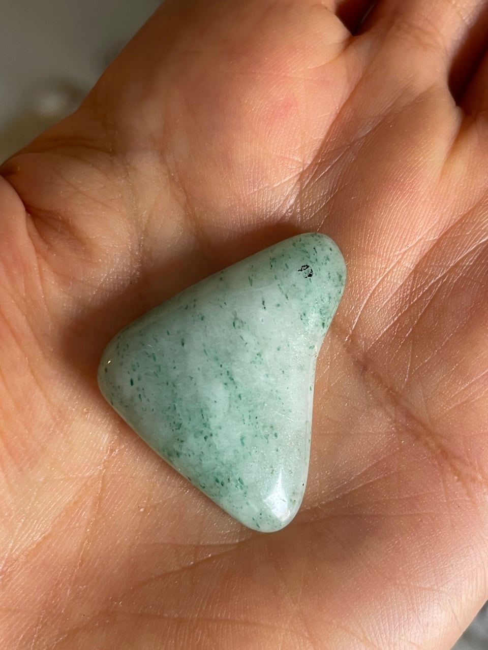 淡くにじむミントグリーンに、細かな内包物がやさしく舞うグリーンアベンチュリン。透明感のある若葉のようなトーンは、深呼吸をするたびに胸の奥に新しい風が流れ込むような印象です。ナチュラルな揺らぎの中に、穏やかで健やかなリズムが息づいています。