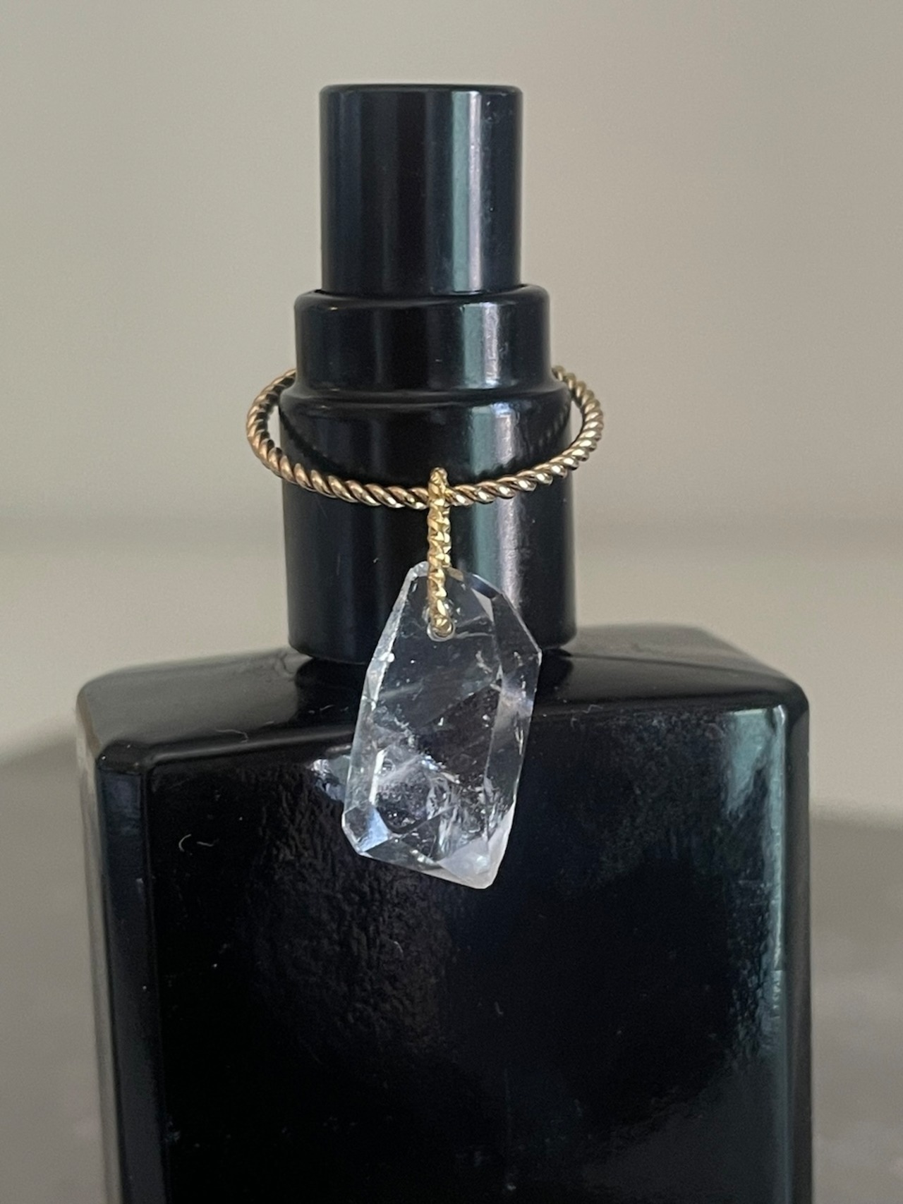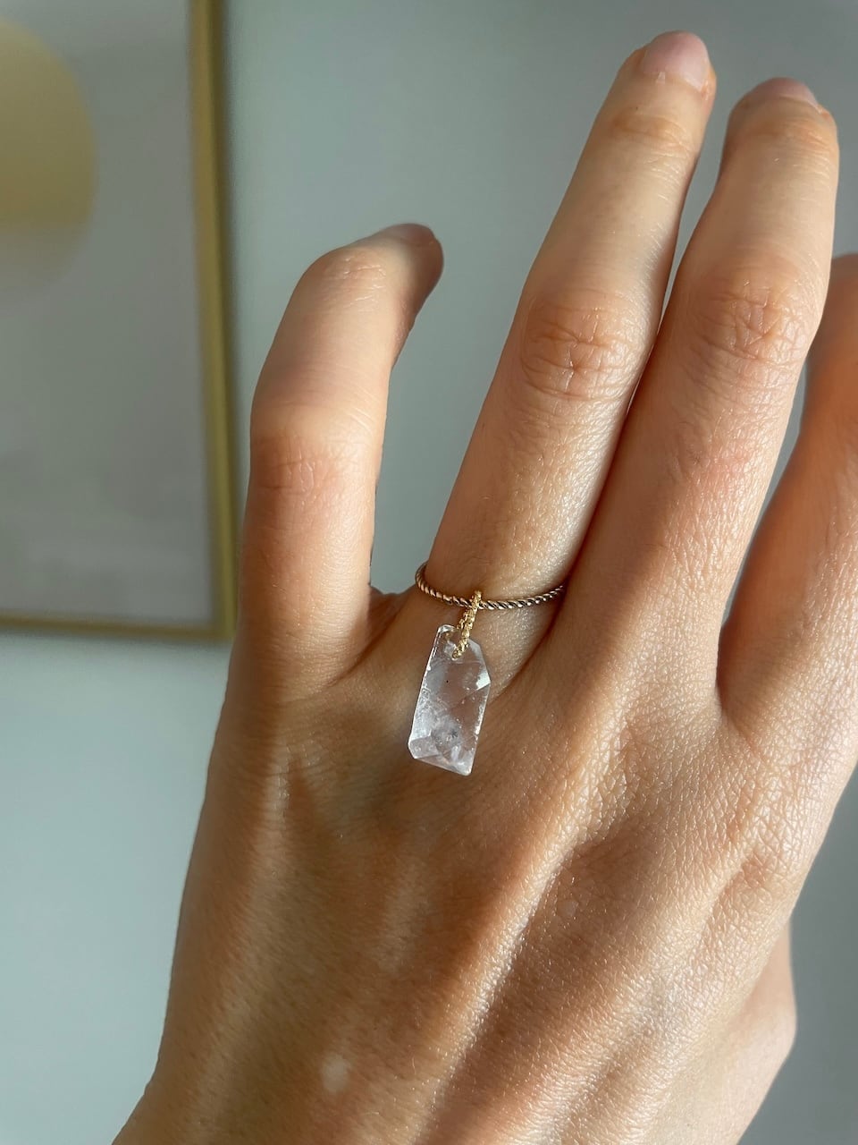 氷の欠片をそのまま指先に宿したような、ハーキマー型クォーツの原石リング。無垢な透明感と、ダイヤモンドのような強い輝きを兼ね備えたこの結晶は、原石とは思えないほどの完成された美しさを誇ります。自然が生み出したとは思えないシャープな結晶面に、静けさと凛とした意志が宿るような一粒です。