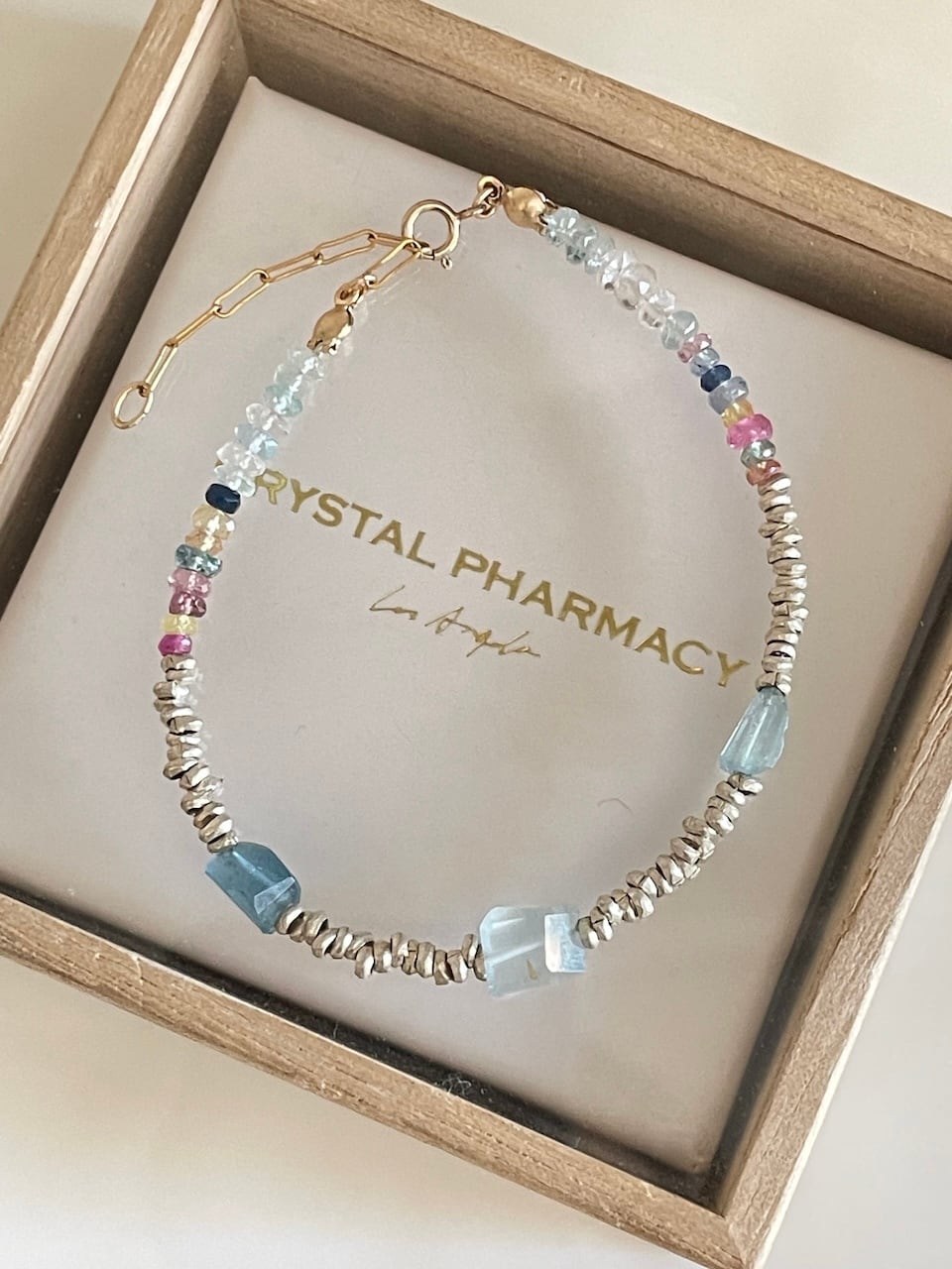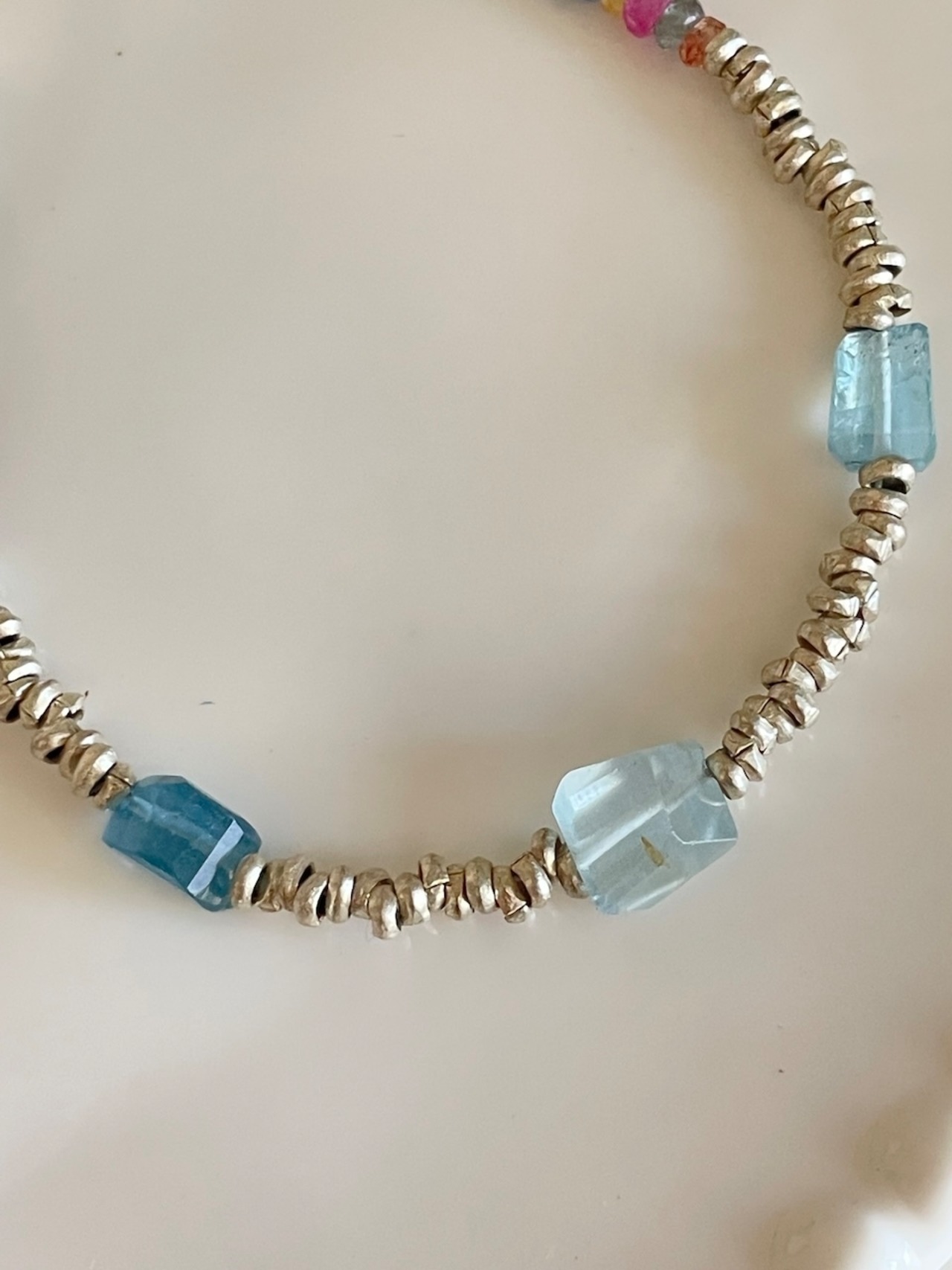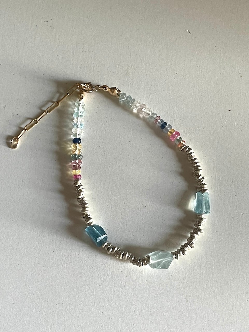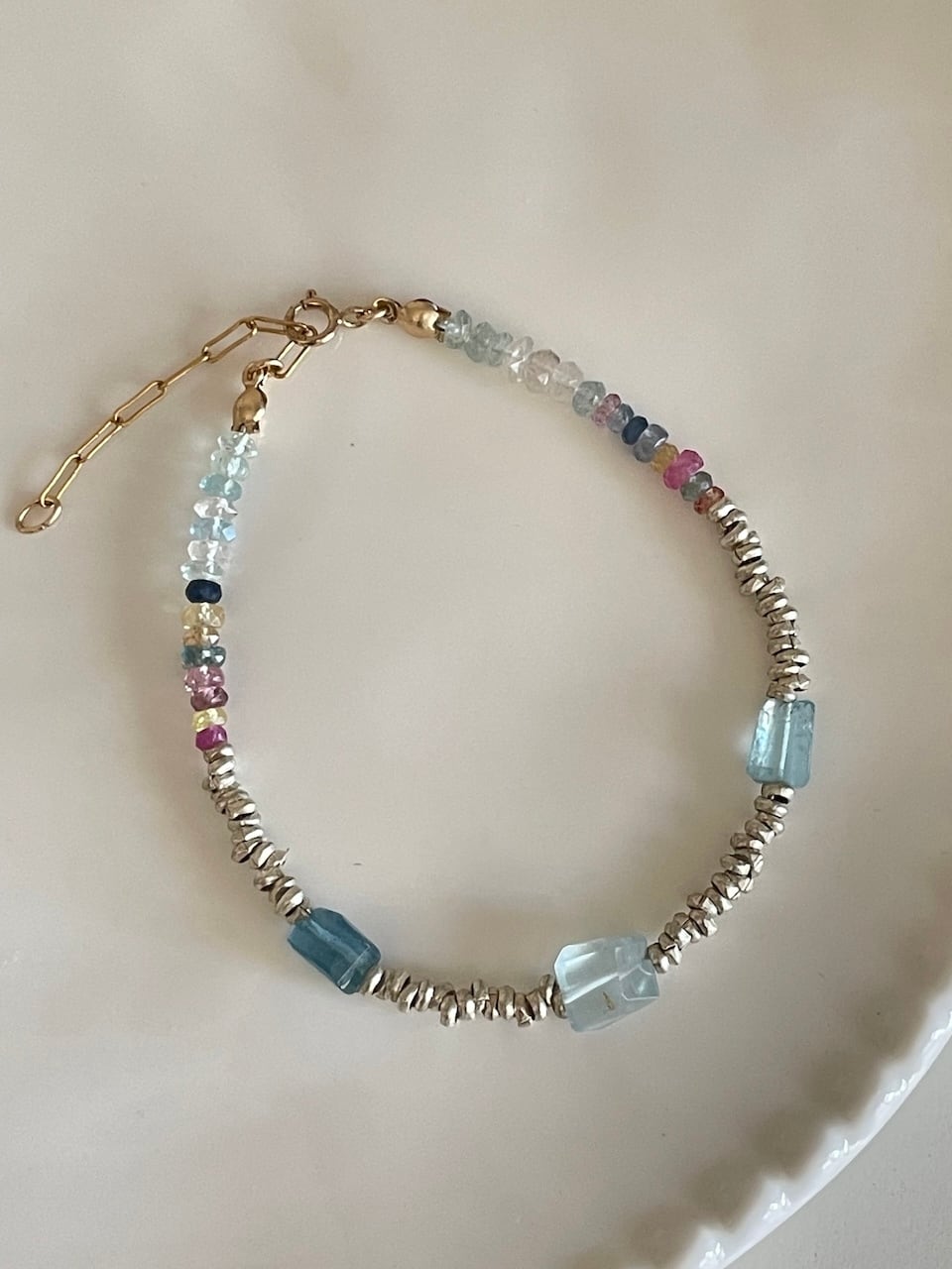 穏やかな海の色を思わせるアクアマリンの原石、深く知性的な輝きを放つサファイア、そして温かみとリズムを添えるアフリカンヴィンテージビーズ——。異なる時代と文化を感じさせる要素が一つに溶け合うブレスレットに仕上げました。
