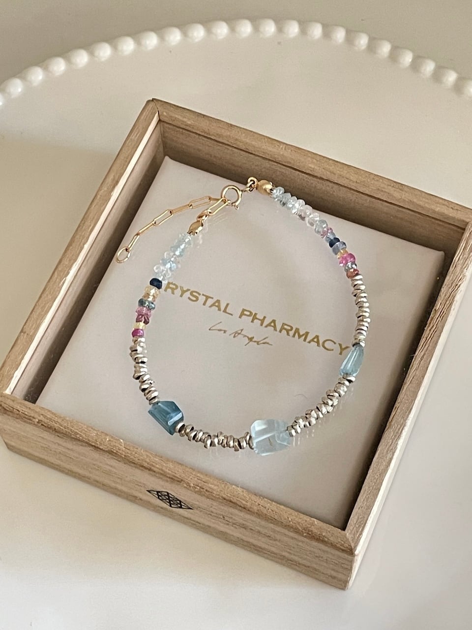 シャープで透明感のある石たちの中に、ぬくもりと軽やかさをもたらす絶妙なバランスのデザイン。日常の中で「整える」「深める」「開く」ための感性を、サポートしてくれるようなお守りブレスレット❤️