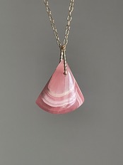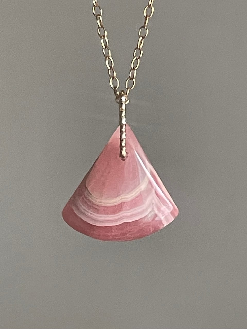 イチョウの葉のような優しい扇形のロードクロサイト(インカローズ)のルースをペンダントチャームに。透明感のあるローズピンクとミルキーピンクがレースのように重なり合い、ひとつとして同じ模様のない、一点ものの表情がたまりません。