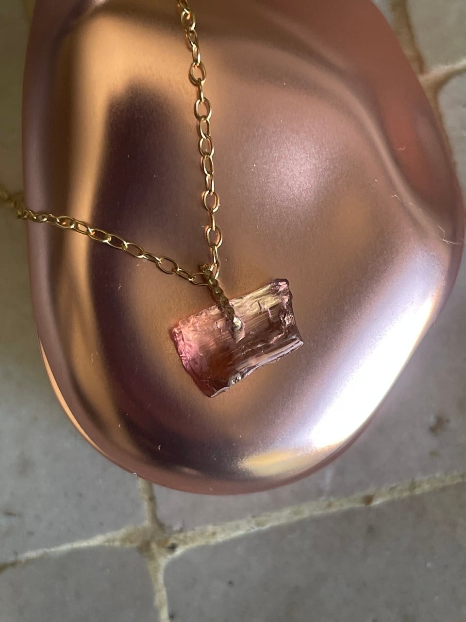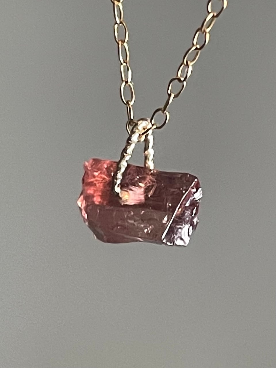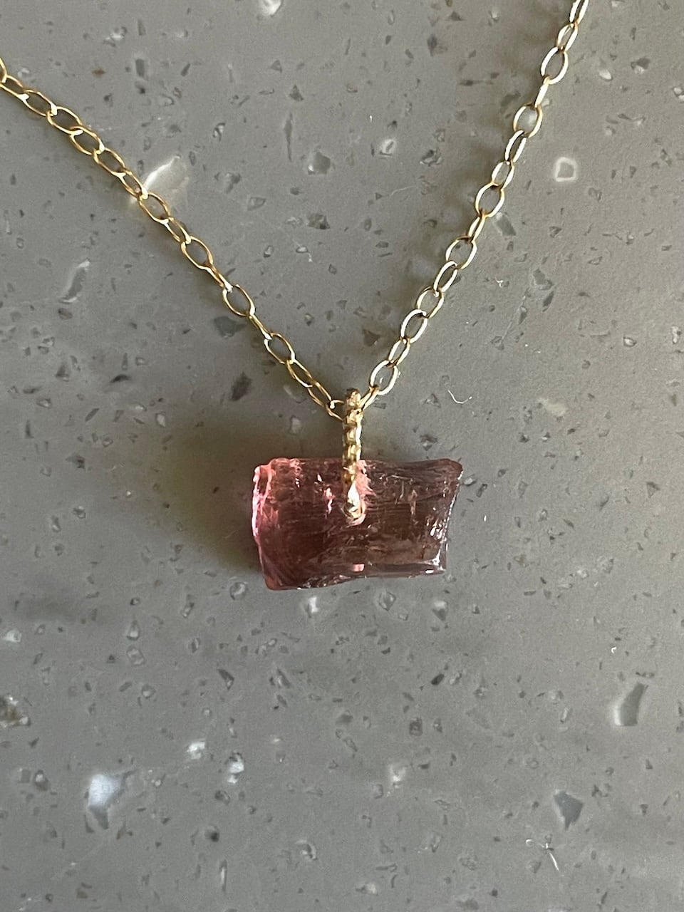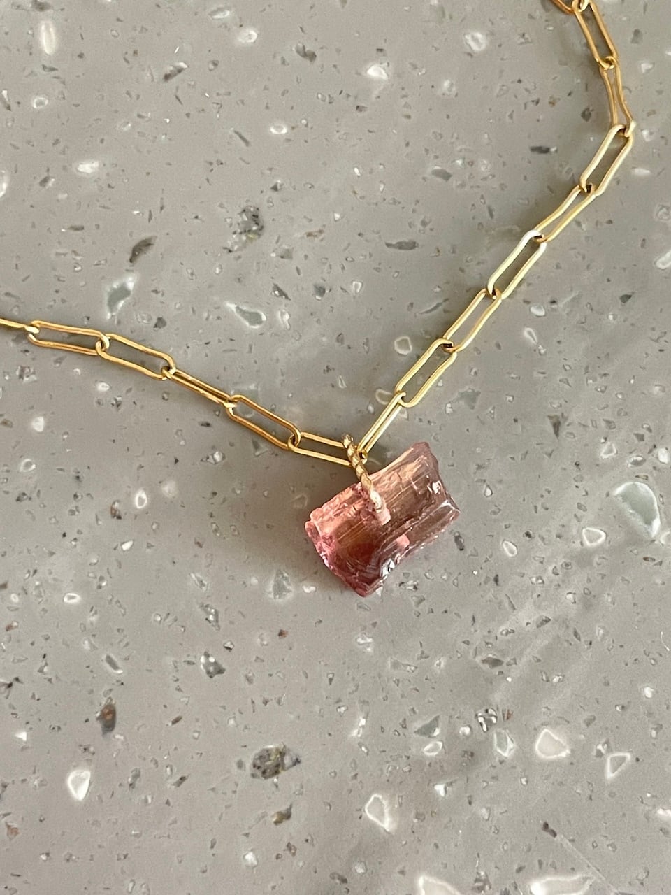 淡く透き通りながら、深く落ち着いたレッドピンクが印象的な、ピンクトルマリンの原石をチャームにしました。芯のある輝きは、優しさと強さがひとつになった光のよう。