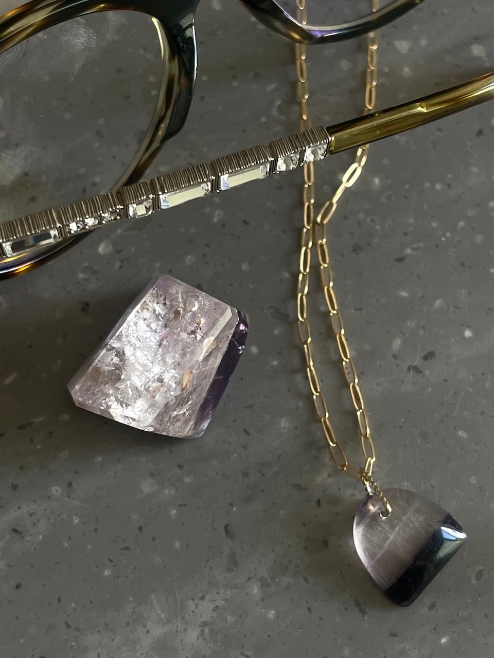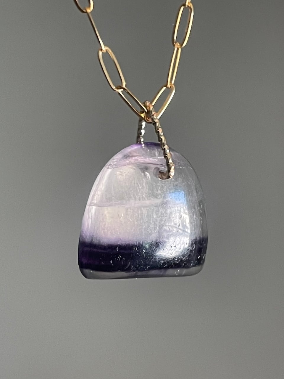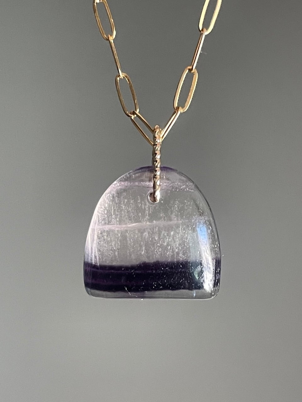 静かな夜明けの空を切り取ったような、紫のグラデーションが美しいフローライトをチャームにしました。