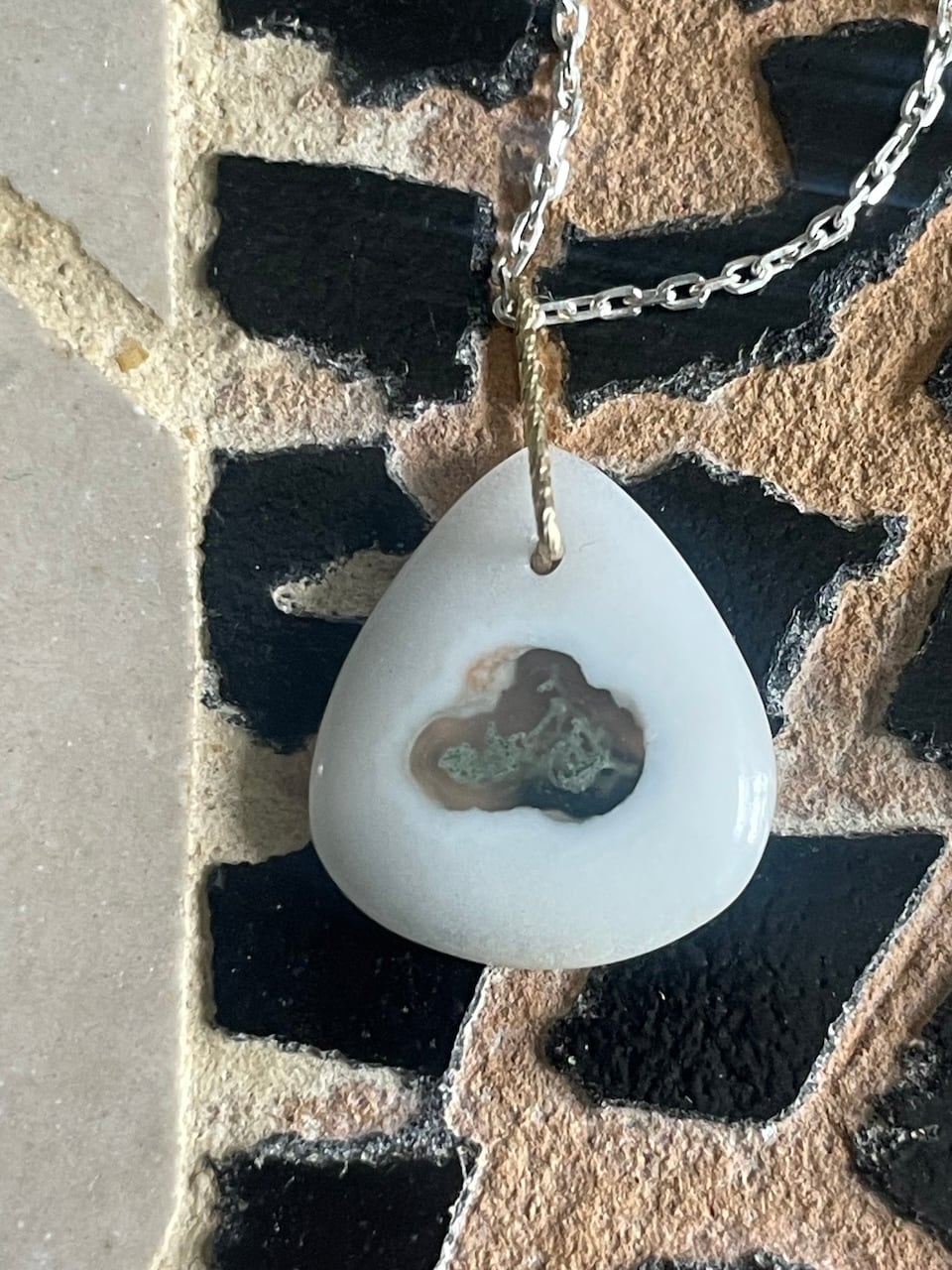 中心に広がるグリーングレーの結晶は、雲の切れ間からのぞく宇宙のようで、静かな輝きを放ちながら、見るたびに違う表情を見せてくれます。清らかで神秘的な佇まいが、心に穏やかな静寂をもたらす一粒です。