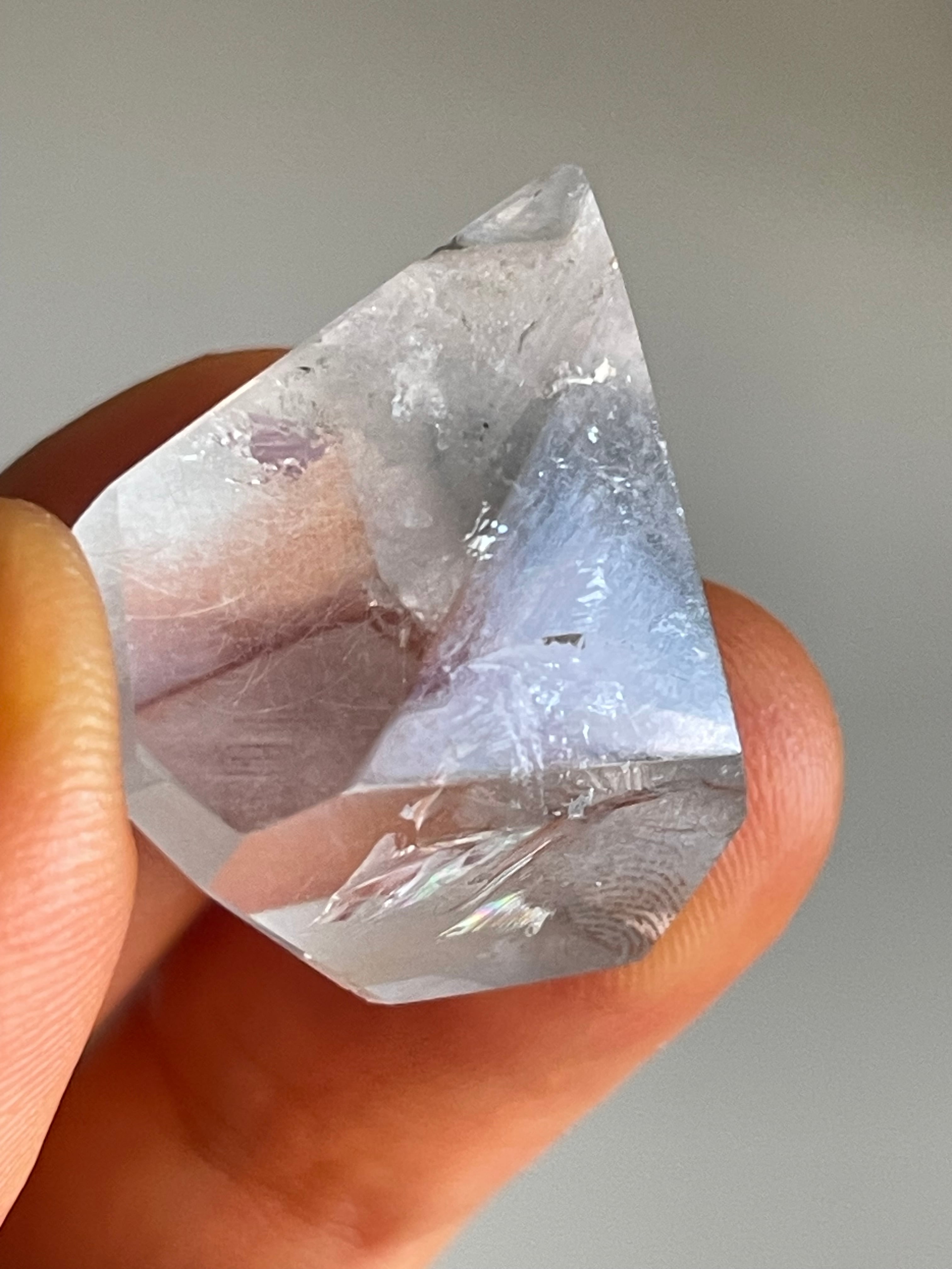 アメジストの高い波動と、スモーキーのグラウンディング力、そこに宿る淡い青のエネルギーが融合することで、心のざわめきを鎮め、深い洞察へと導いてくれる石。「混乱の中でも静けさを保ちたい人」や「高次の視点で物事を見たい人」に、穏やかな強さを授けてくれると言われています。
