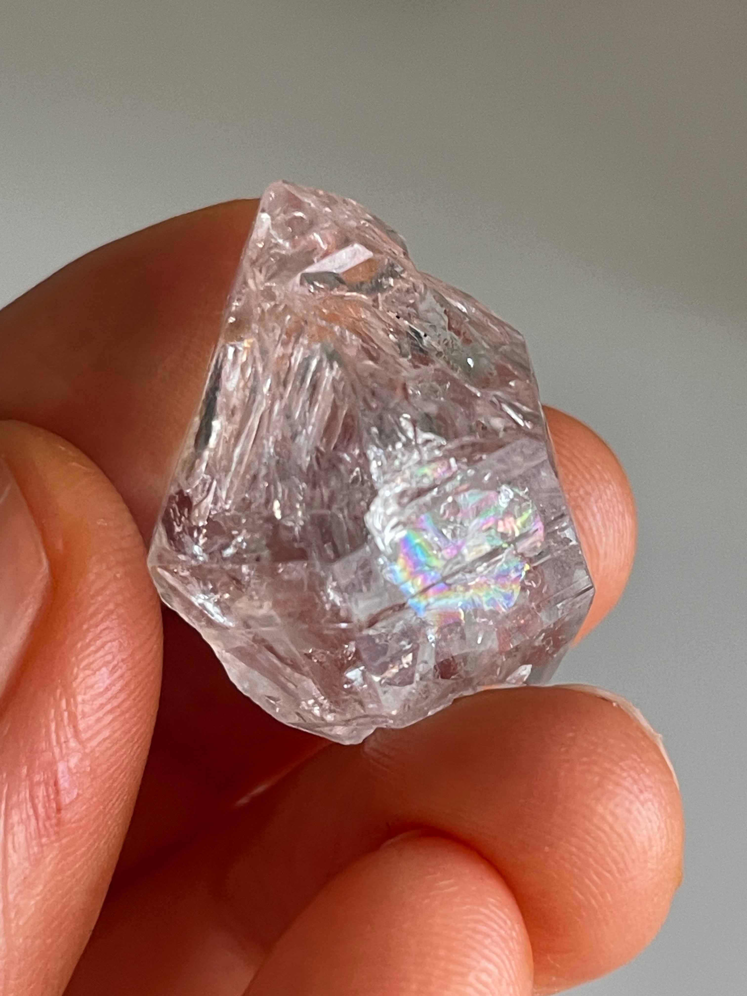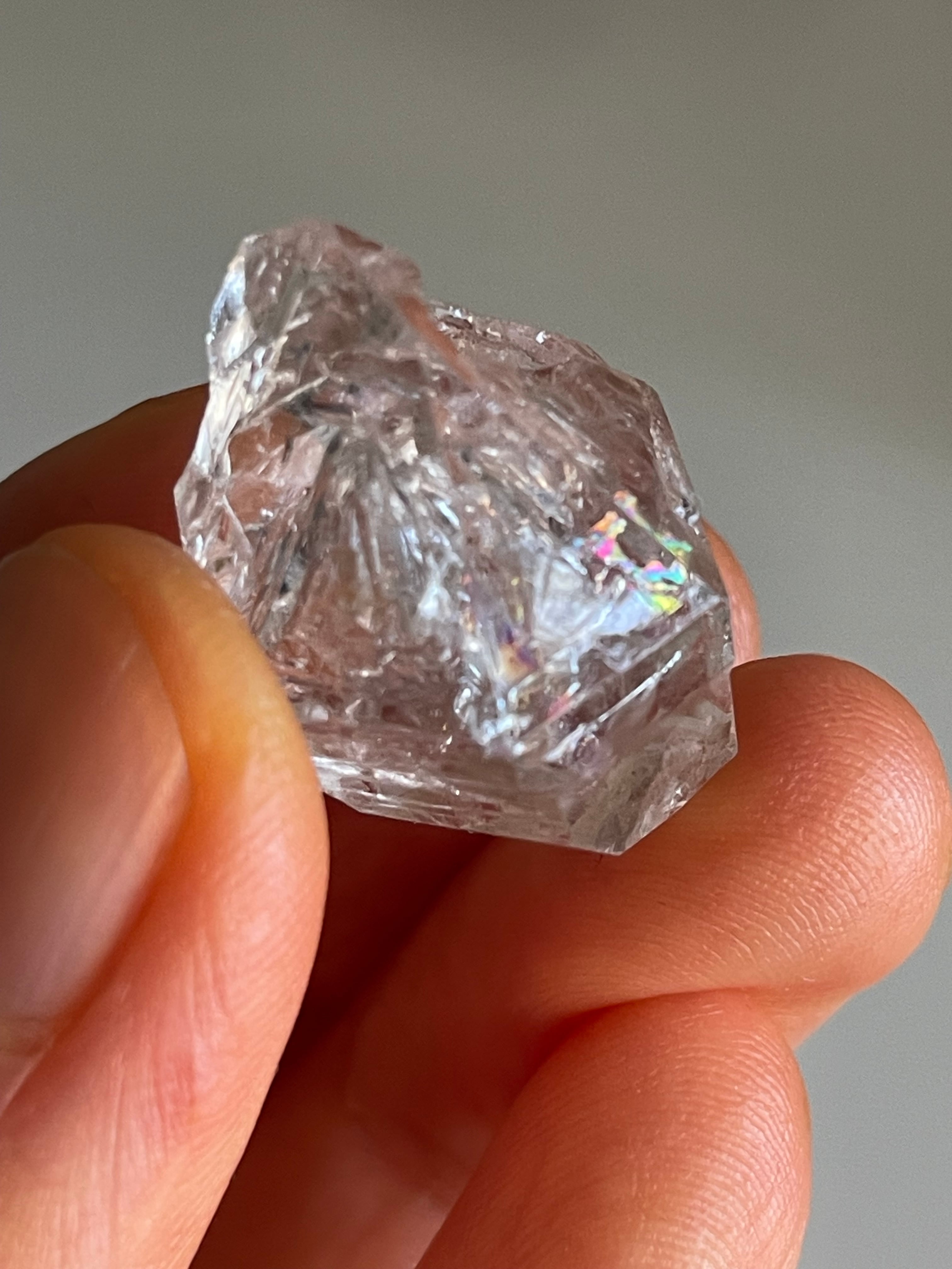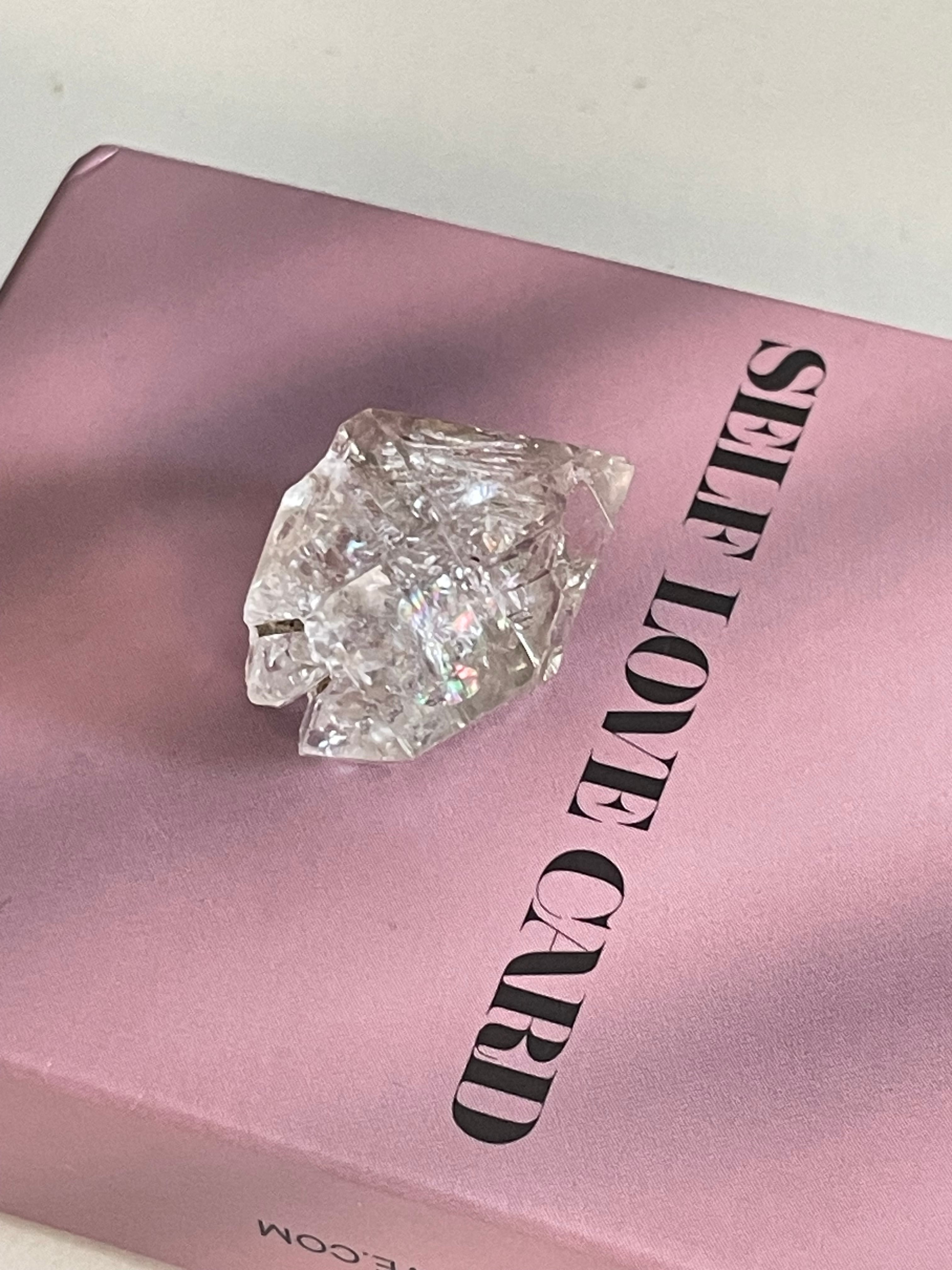 大地と天をつなぐヒマラヤで生まれたこの石は、重いエネルギーを解き放ち、心を高次の意識へと引き上げる力を持つと伝えられています。透明な中に浮かぶ虹は、「魂が覚醒へと還る瞬間」の象徴。それはまるで、静かな祈りの中に立ち上がる希望の光のようです。