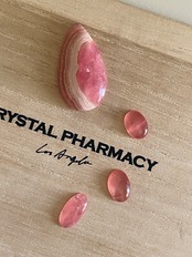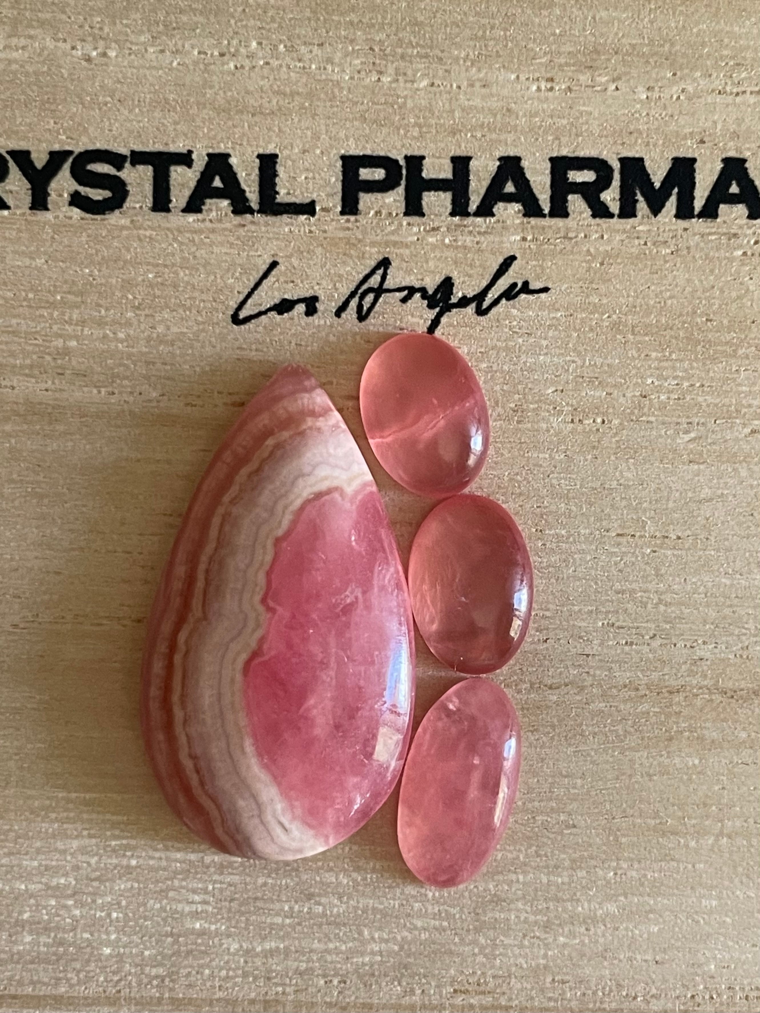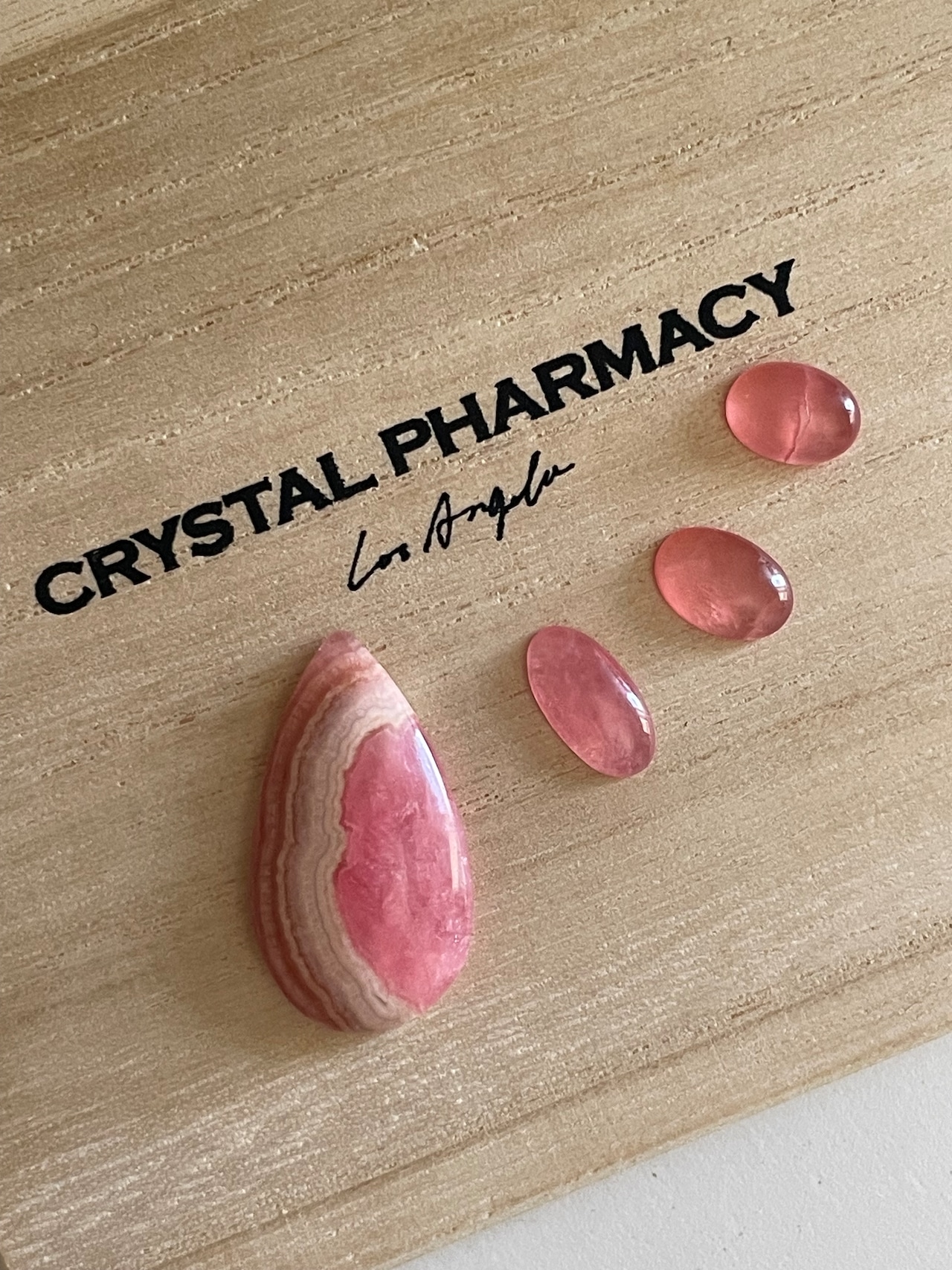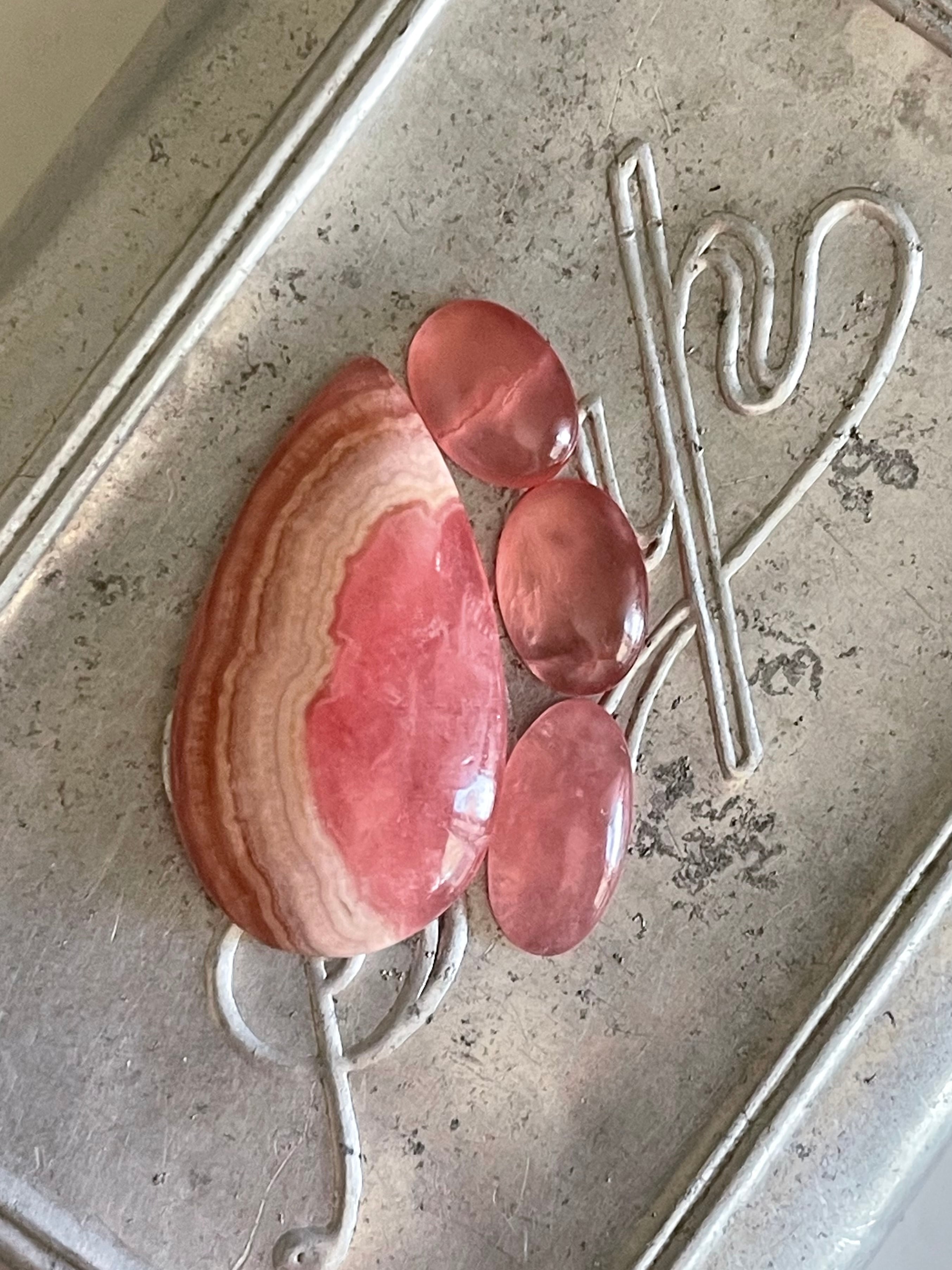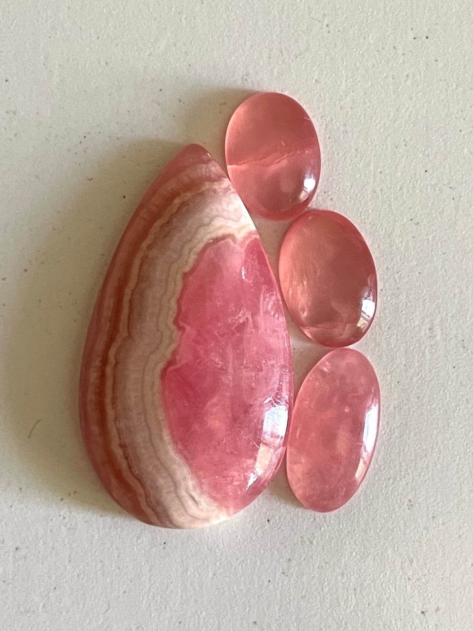 透きとおるようなピンクの濃淡が美しく揺らぐ、ロードクロサイトのルースセット。レース模様が美しいティアドロップと、艶やかなカボションたち。