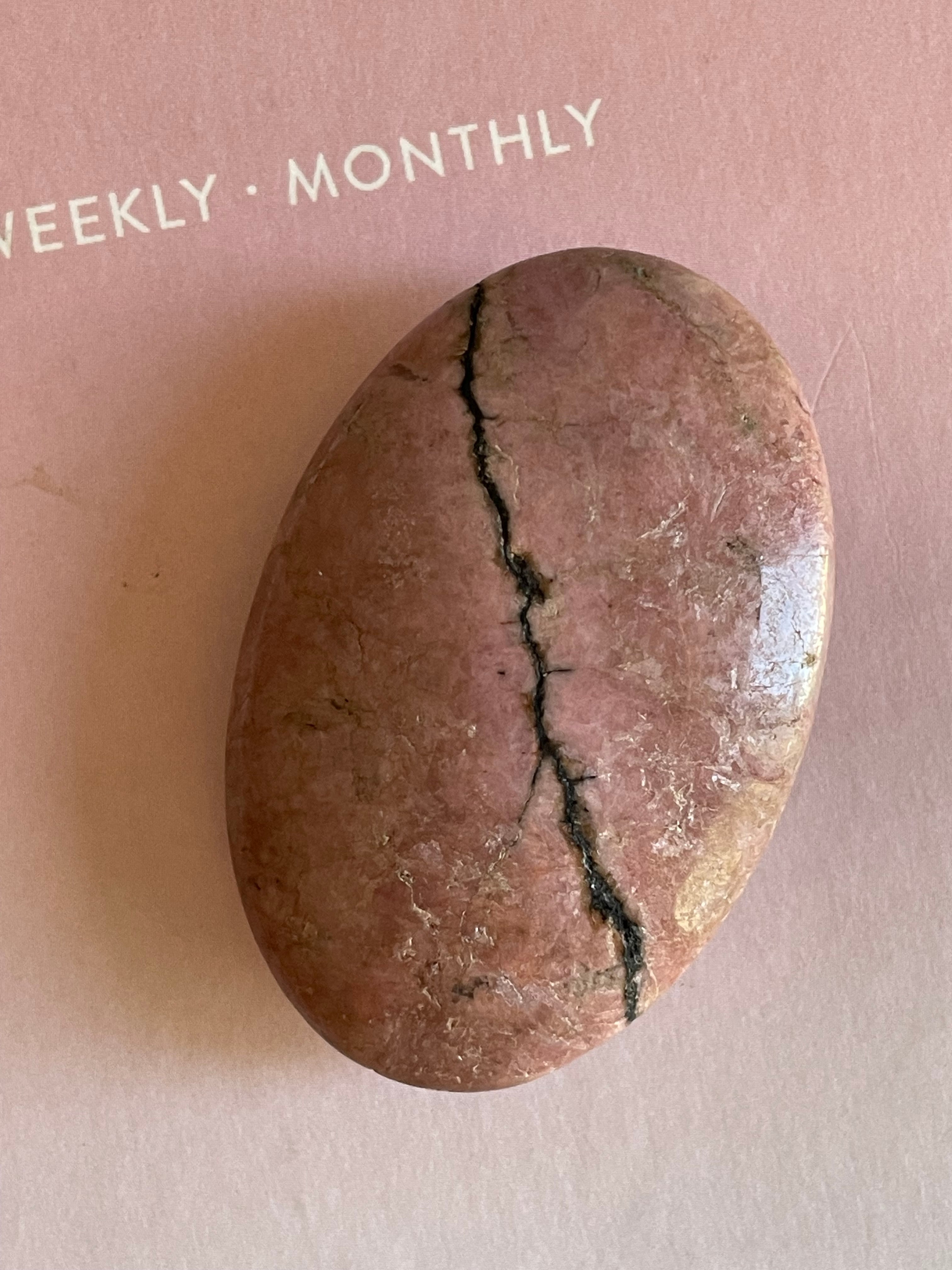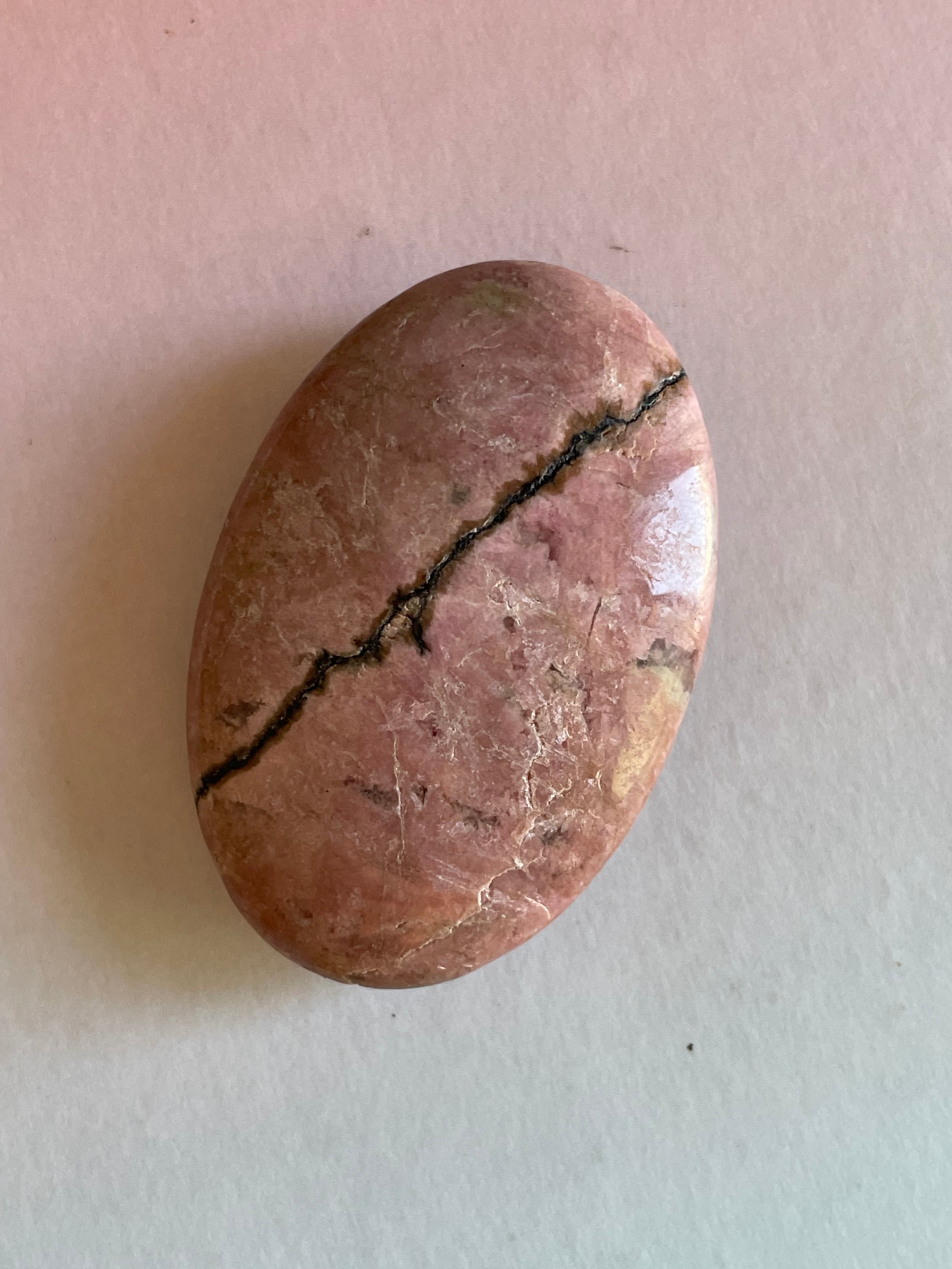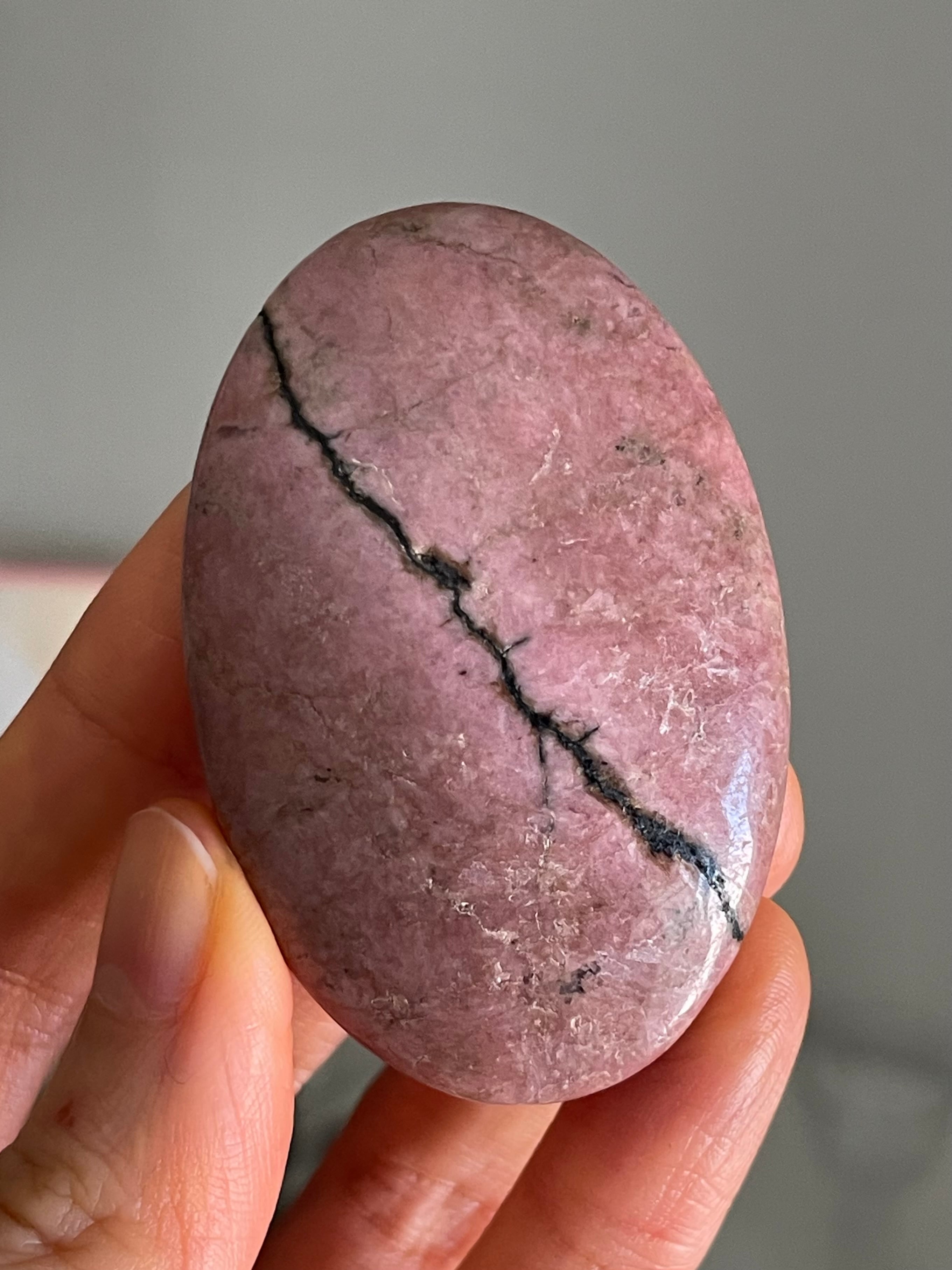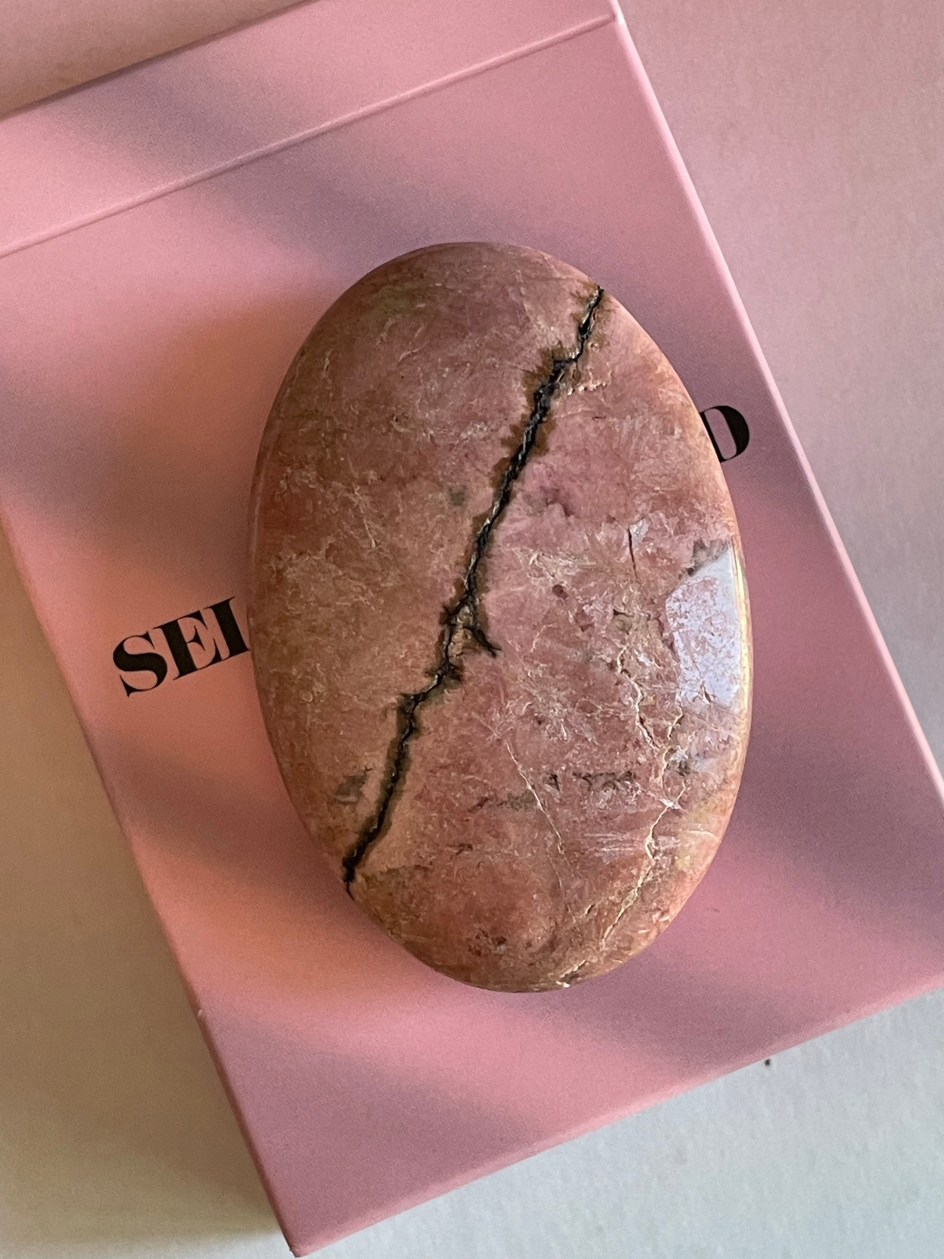 深みあるローズピンクに漆黒のラインが印象的な、ポップ&シックな愛のパームストーン。優しさの中に意思の強さを感じさせるピース。