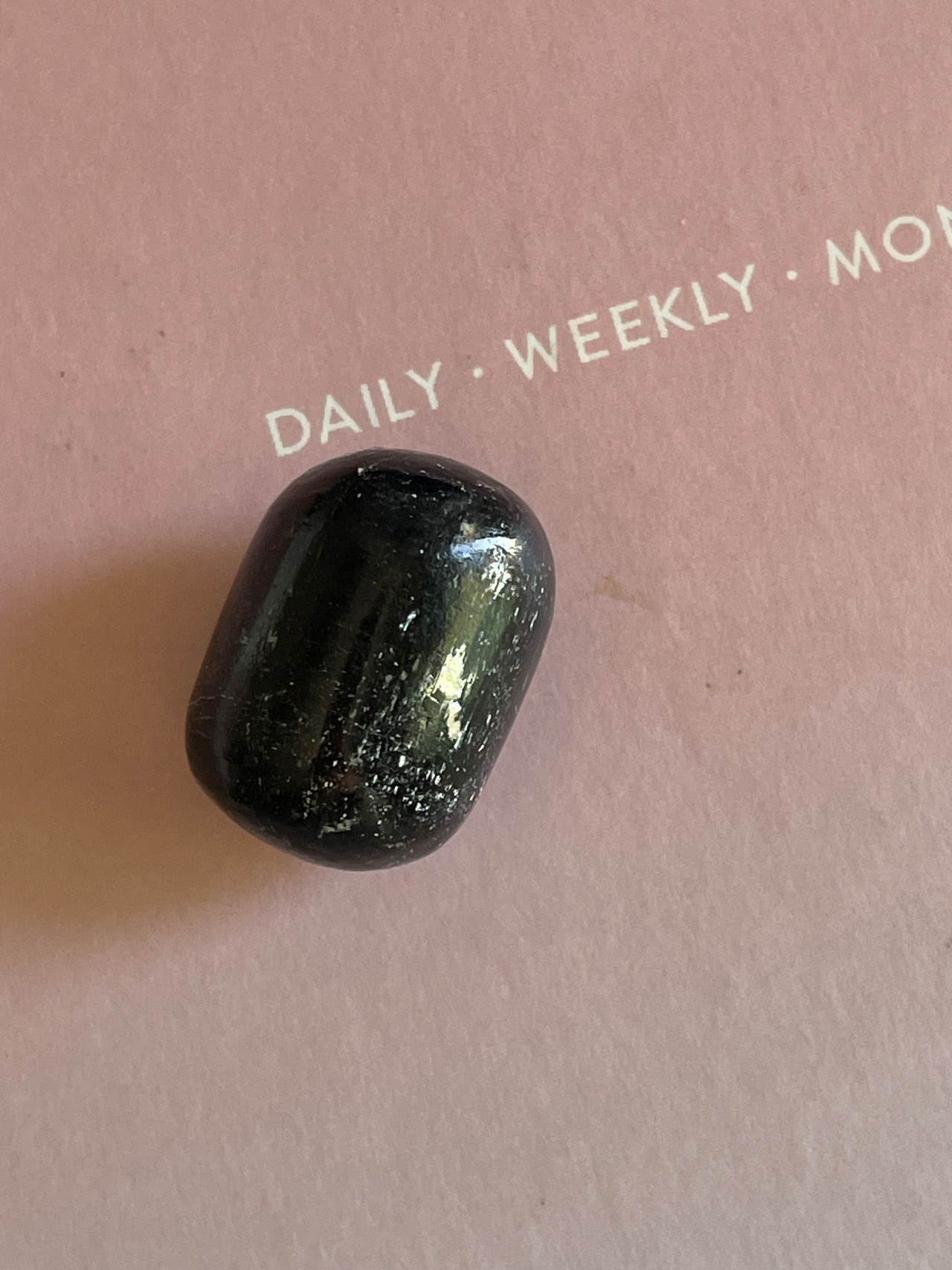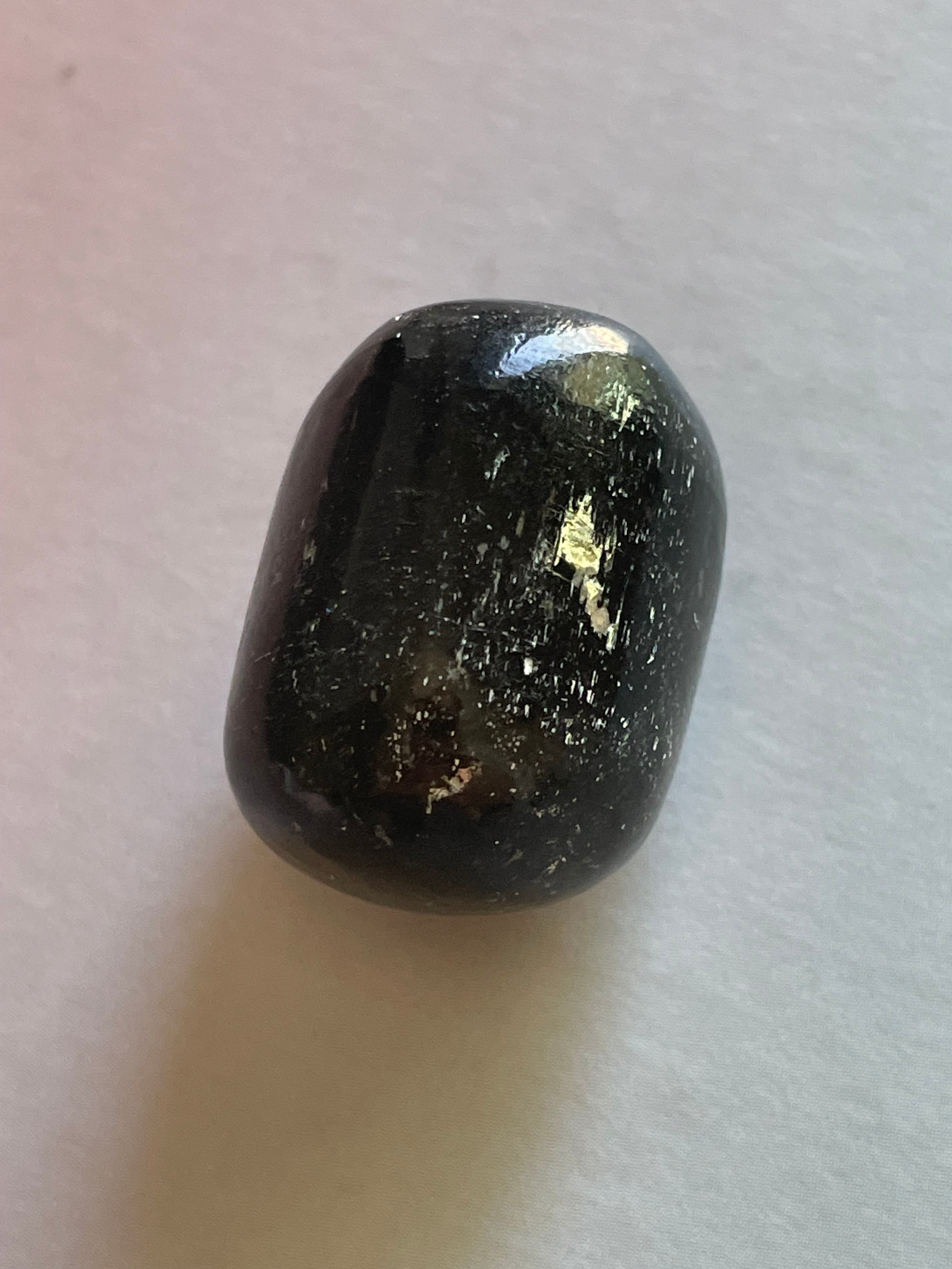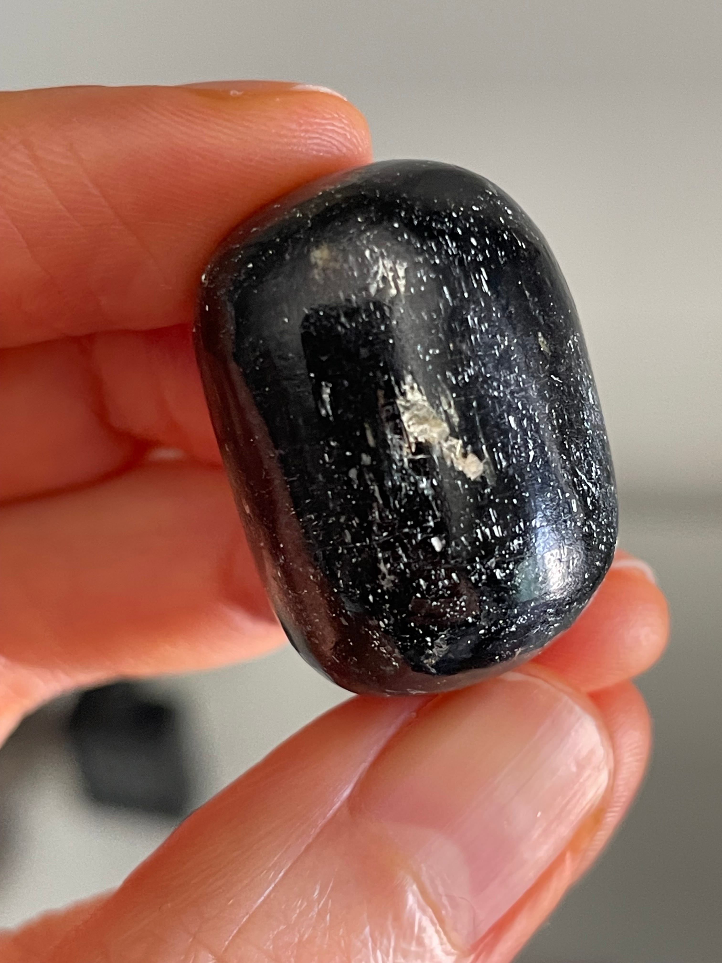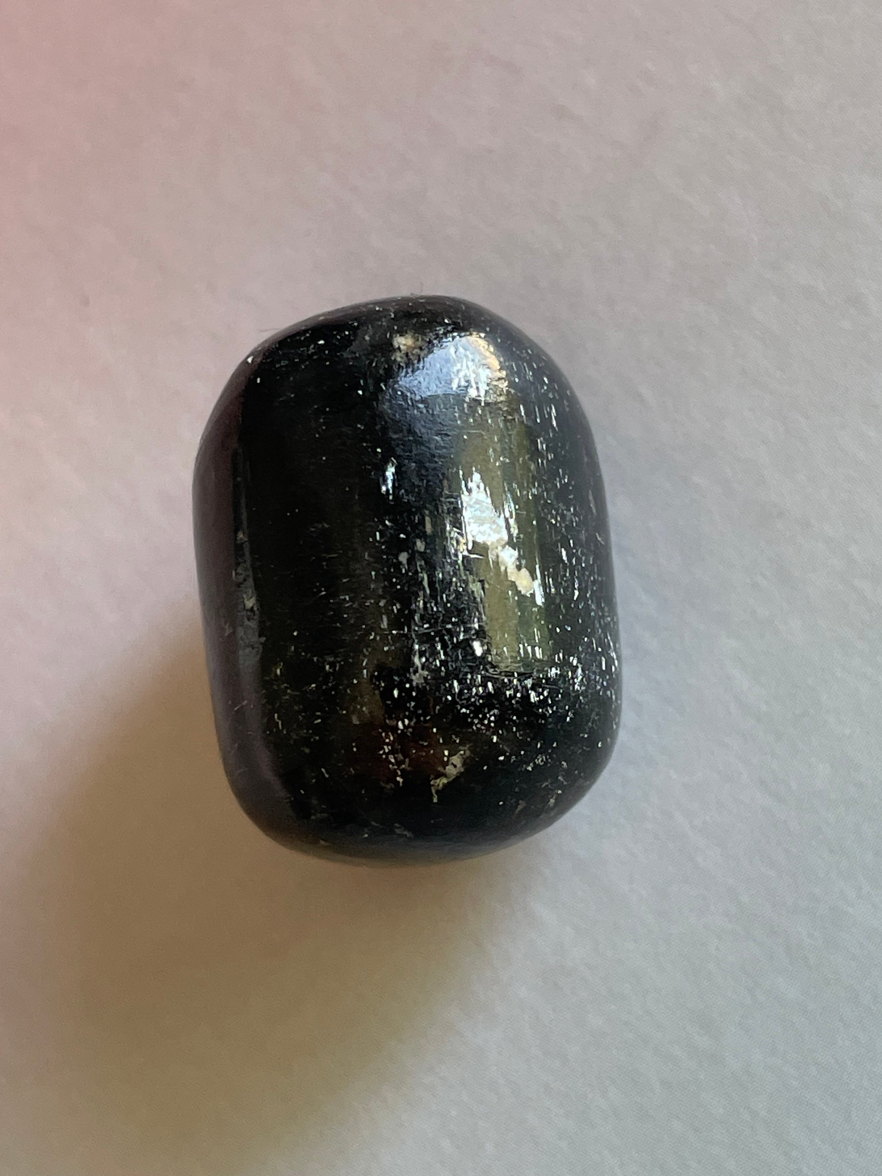 深い闇の中に、光を秘めたようなブラックトルマリンのタンブル。シルバーメタルのような輝きが、キラッと光る特別な一粒です。