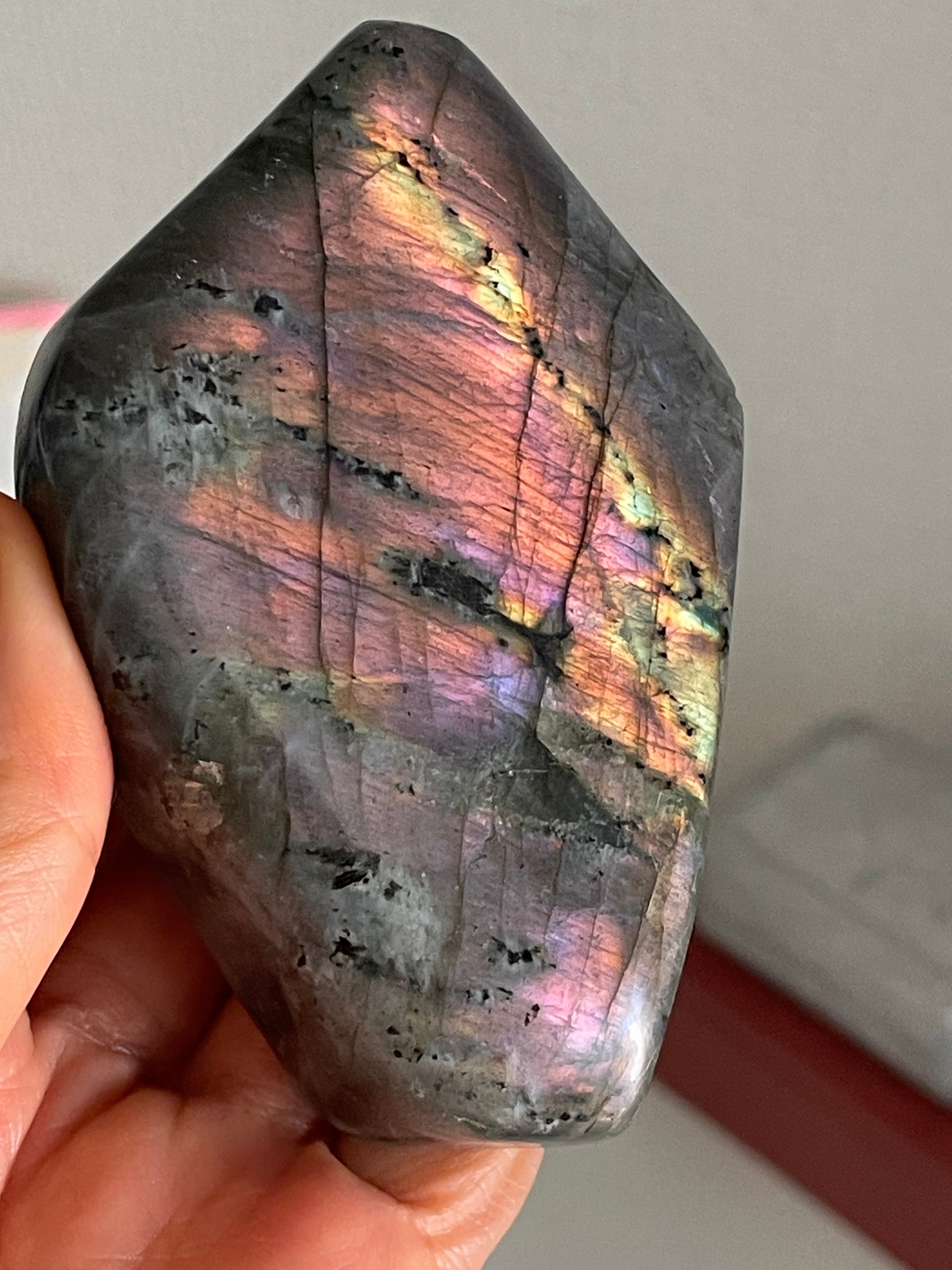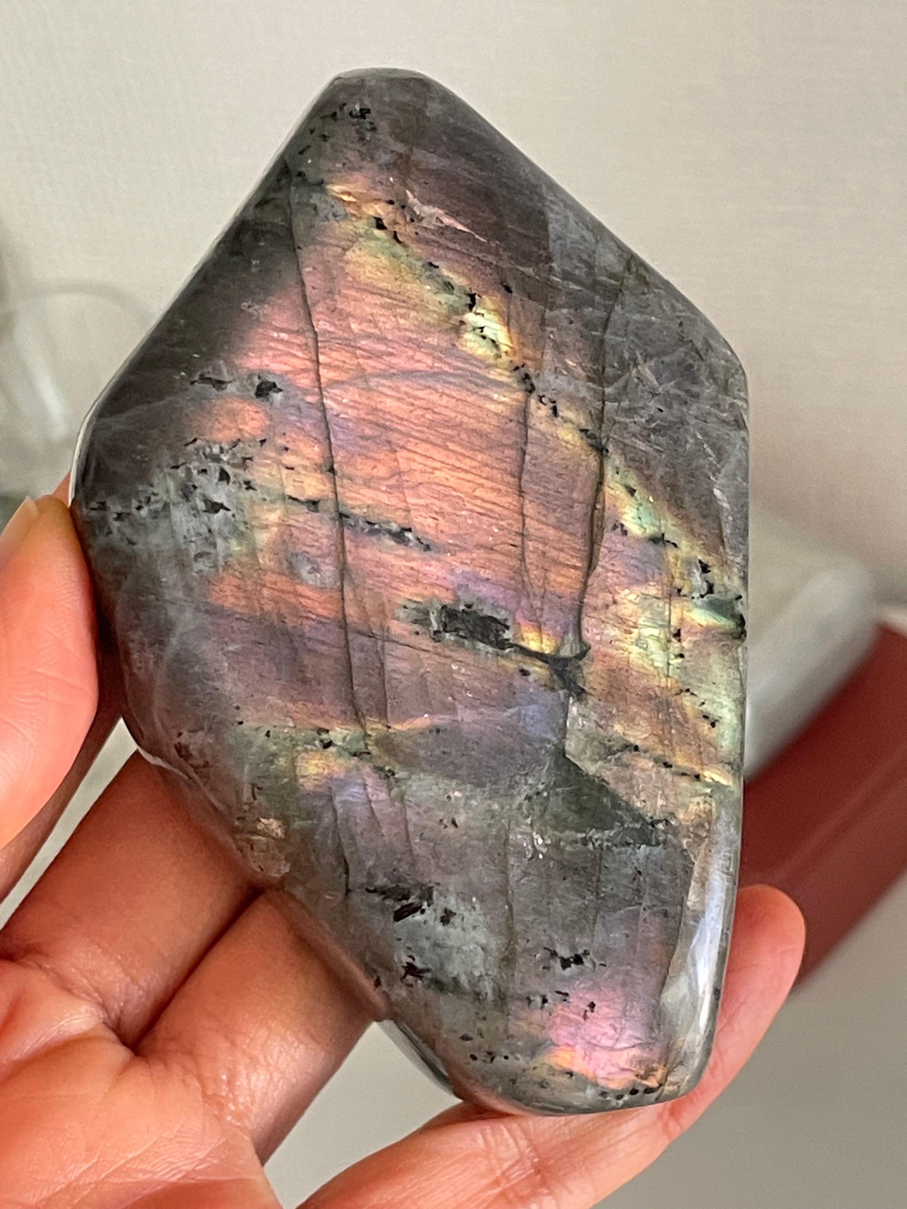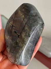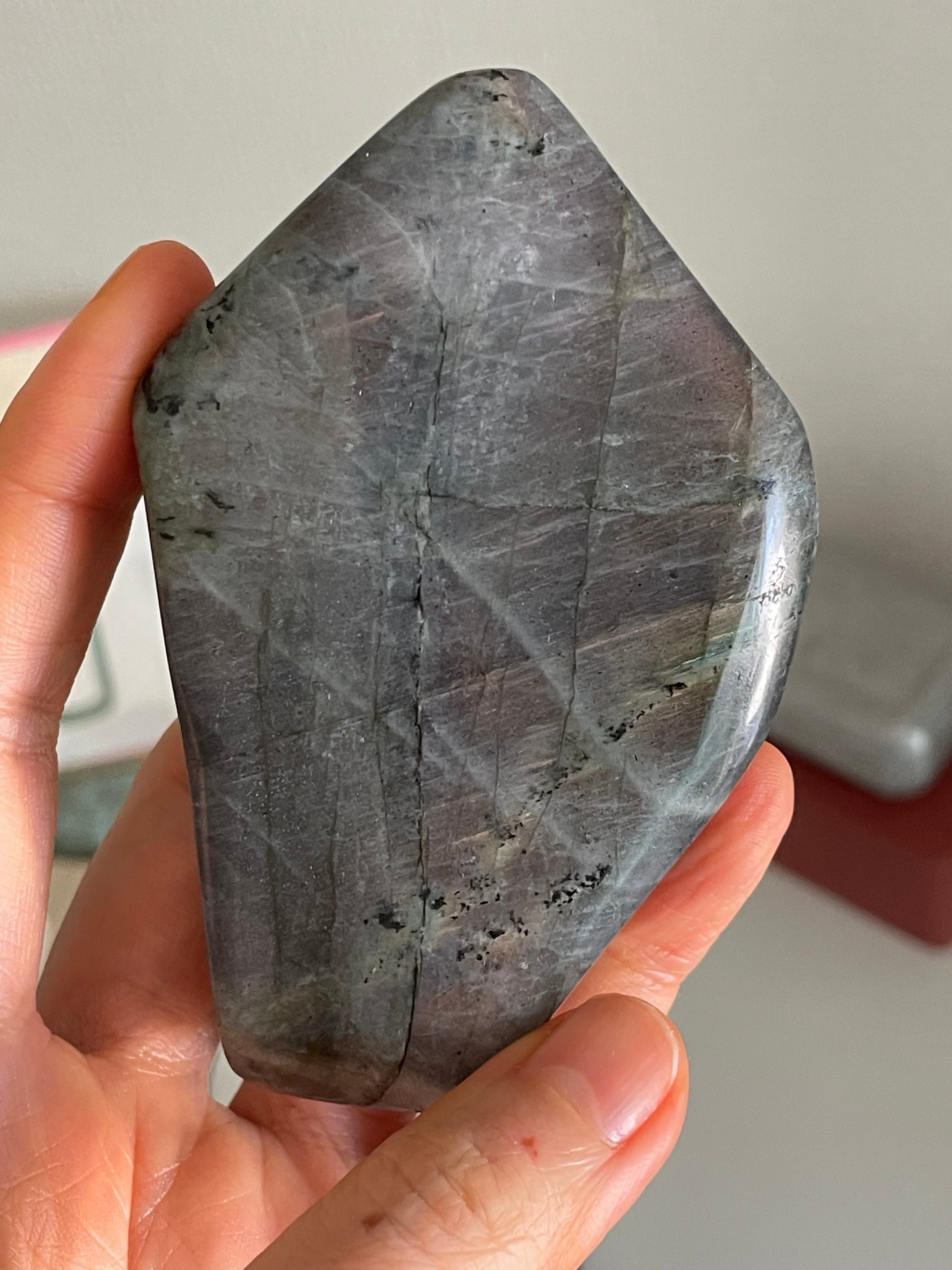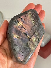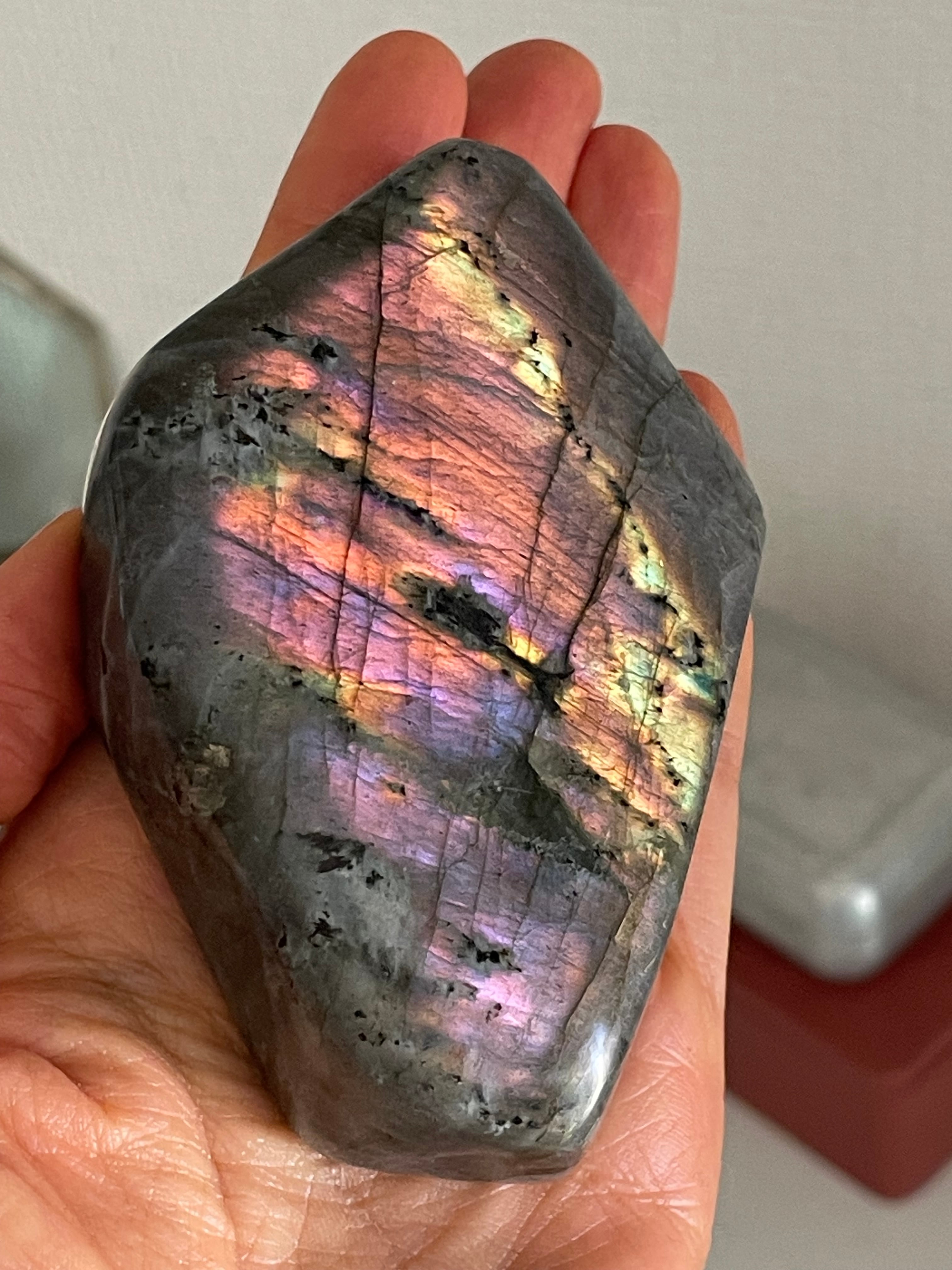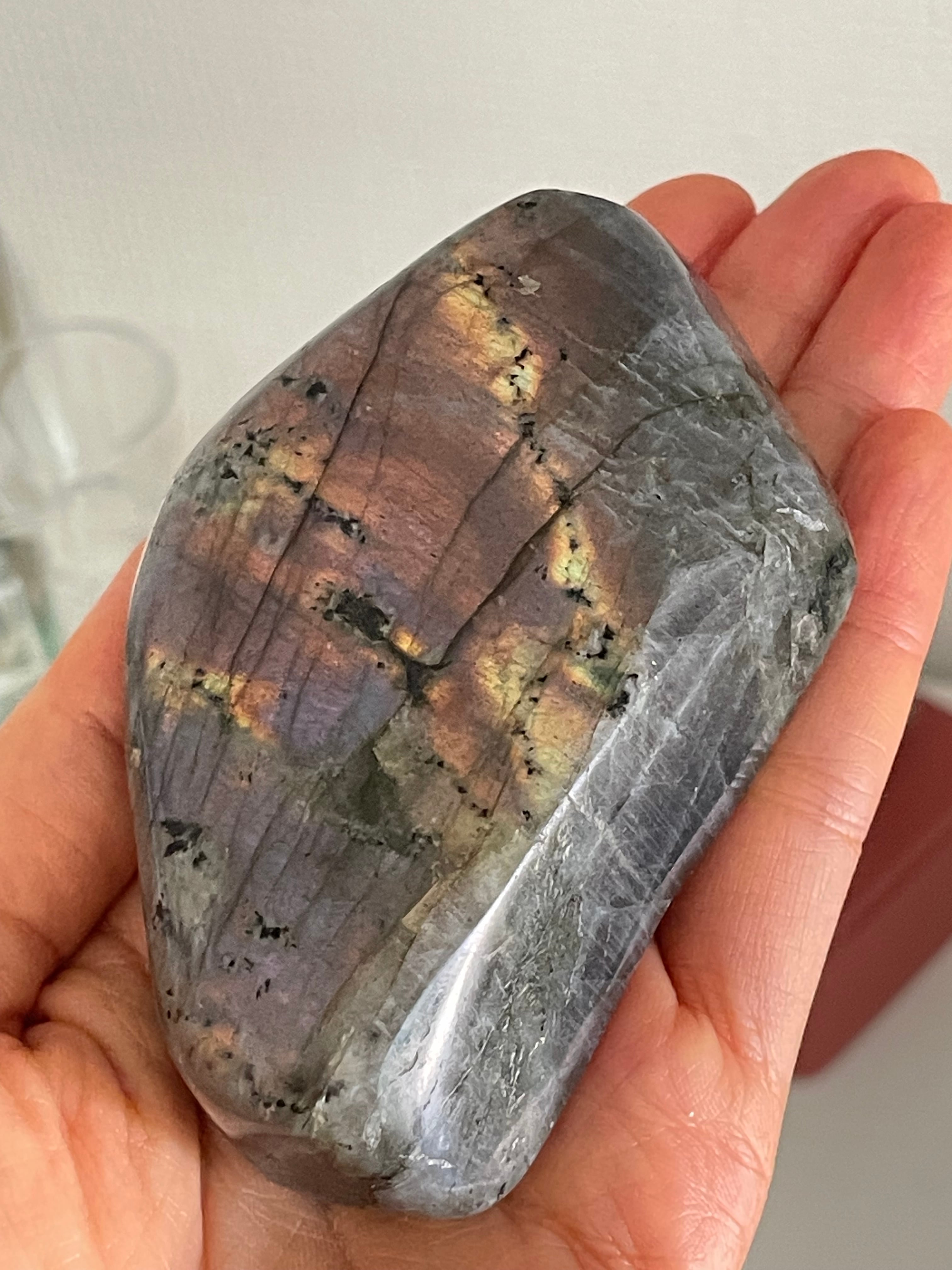 手のひらにすっぽりと収まるほどの存在感を放つ、大ぶりのラブラドライト。