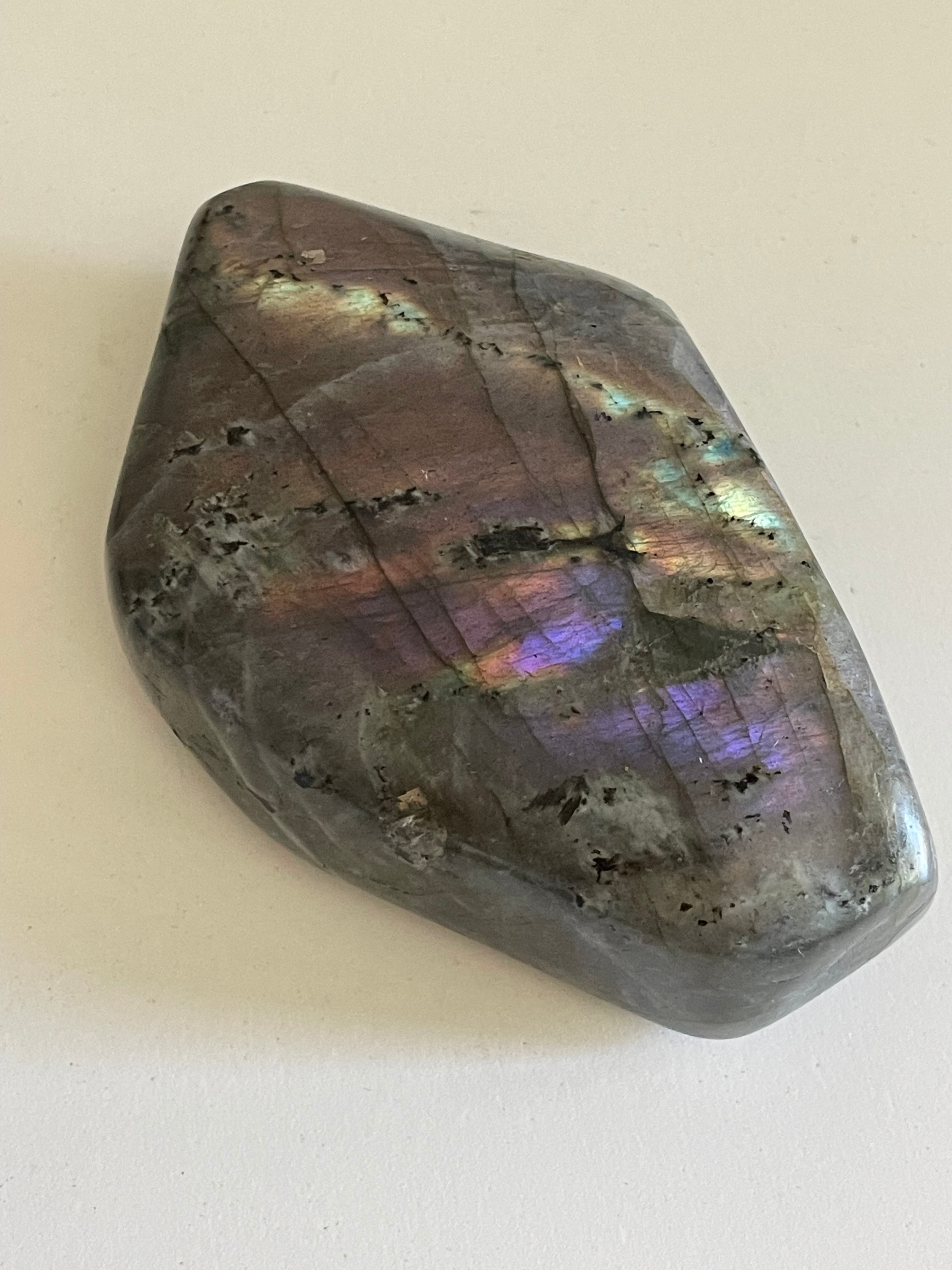 光の角度によって現れる、この神秘的な閃光は「ラブラドレッセンス」と呼ばれ、結晶内部の層状構造が光を反射・屈折させることで、ブルー、ゴールド、グリーン、そして希少なラベンダーピンクの閃光までもが現れます。