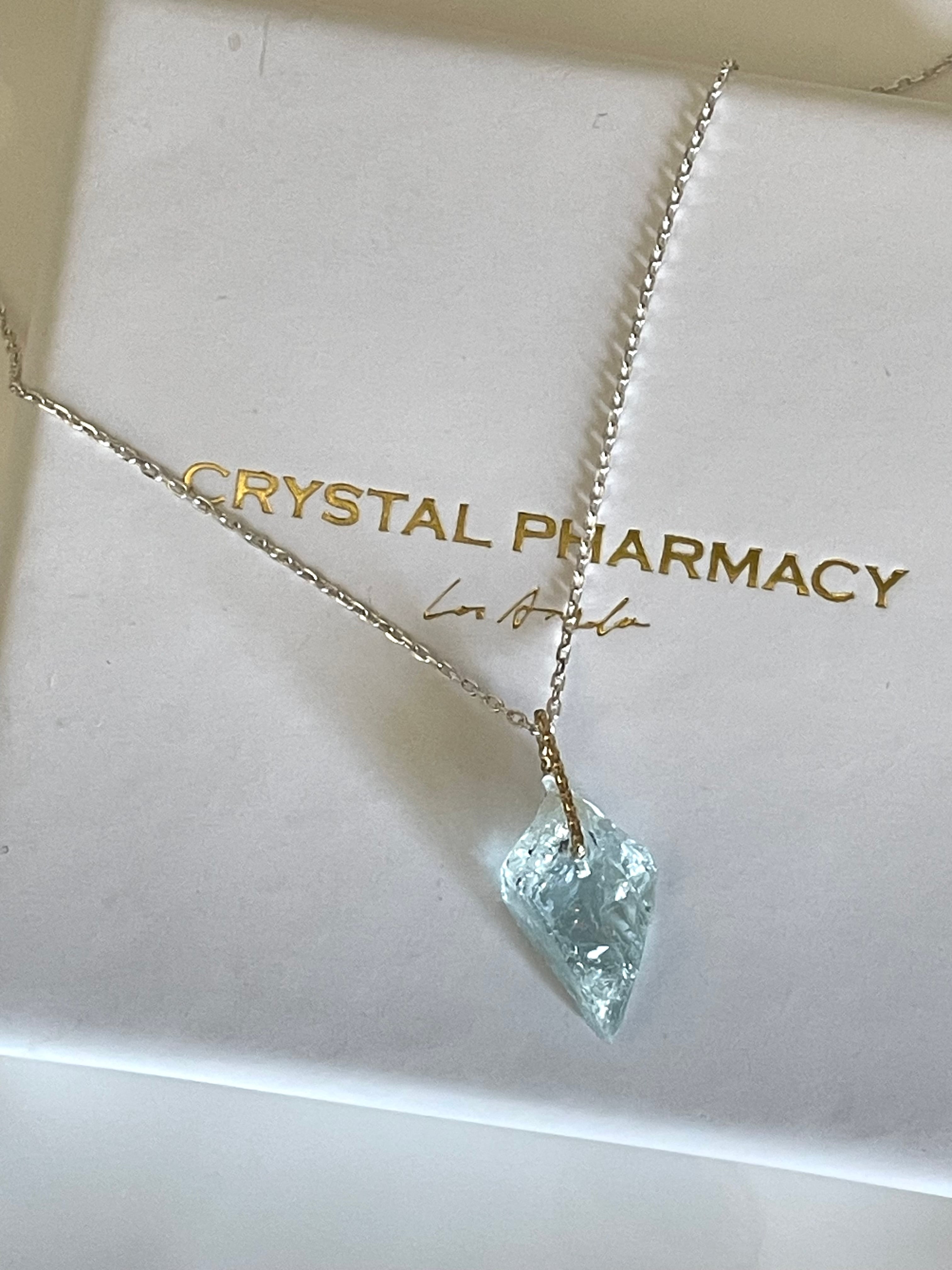 磨かれすぎていない原石の輪郭には、自然が刻んだ細やかな起伏が宿り、揺れるたびに清らかな反射を生み出します。ダイヤ型のミニマルなフォルムに秘めた存在感が、胸元にすっと馴染む一粒です。