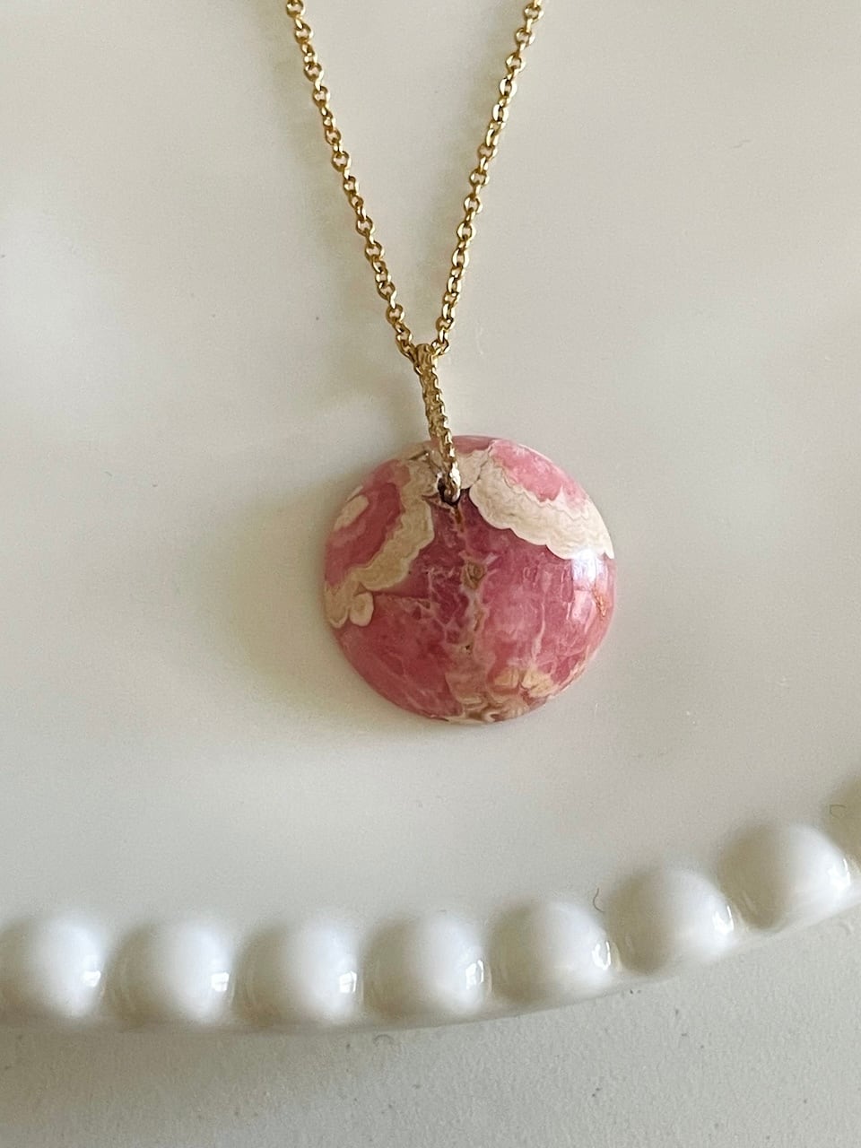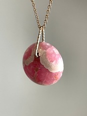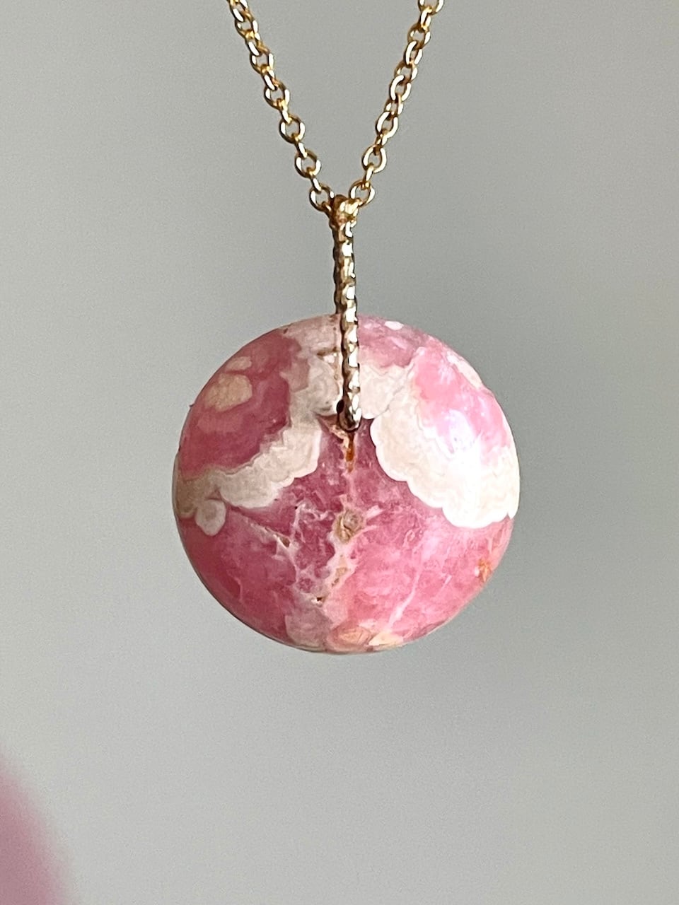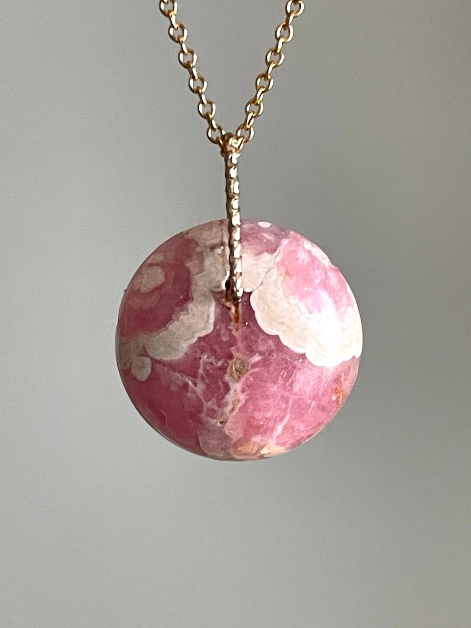 果実のように熟したピンクの色合いに、やわらかなクリーム色の模様が滲むロードクロサイトのチャーム。