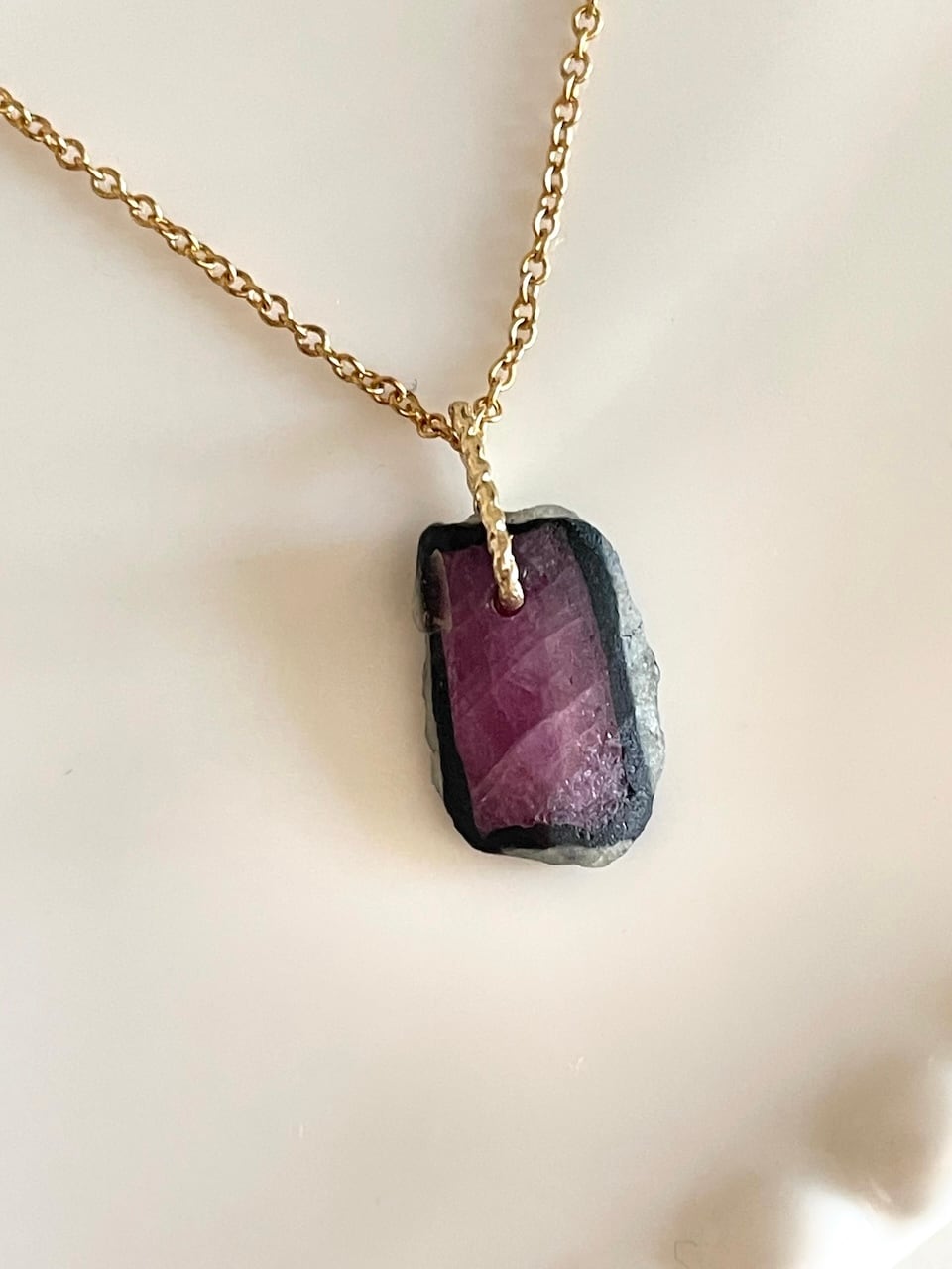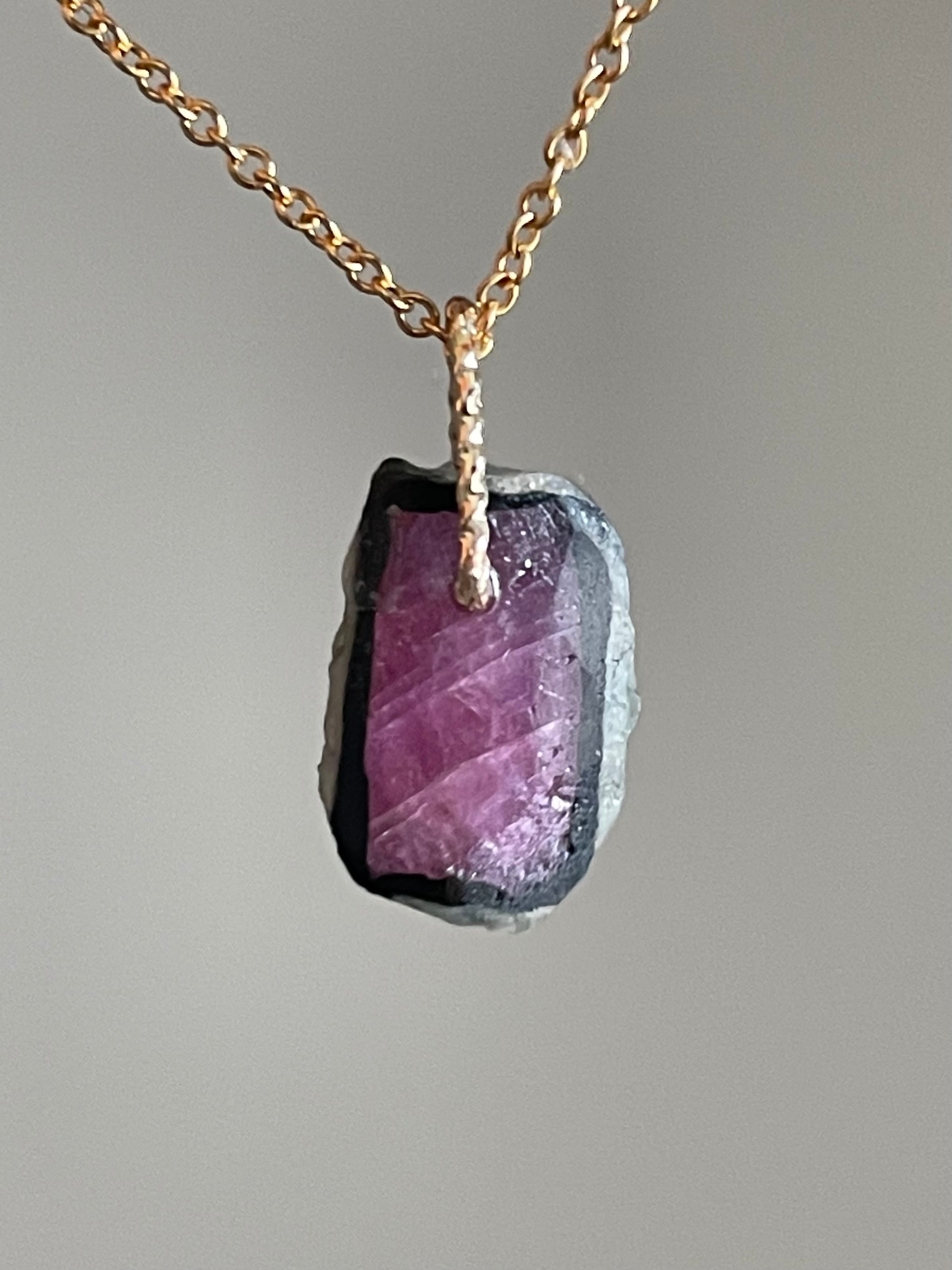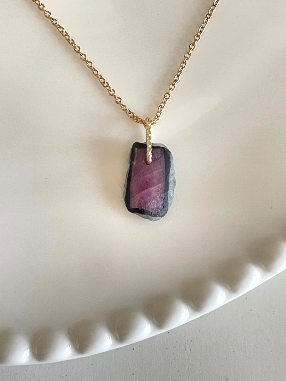 深いルビーピンクを芯に抱き、ミニマルな黒のフレームが静かな力強さを描くように浮かび上がる、ルビーの原石チャームです。