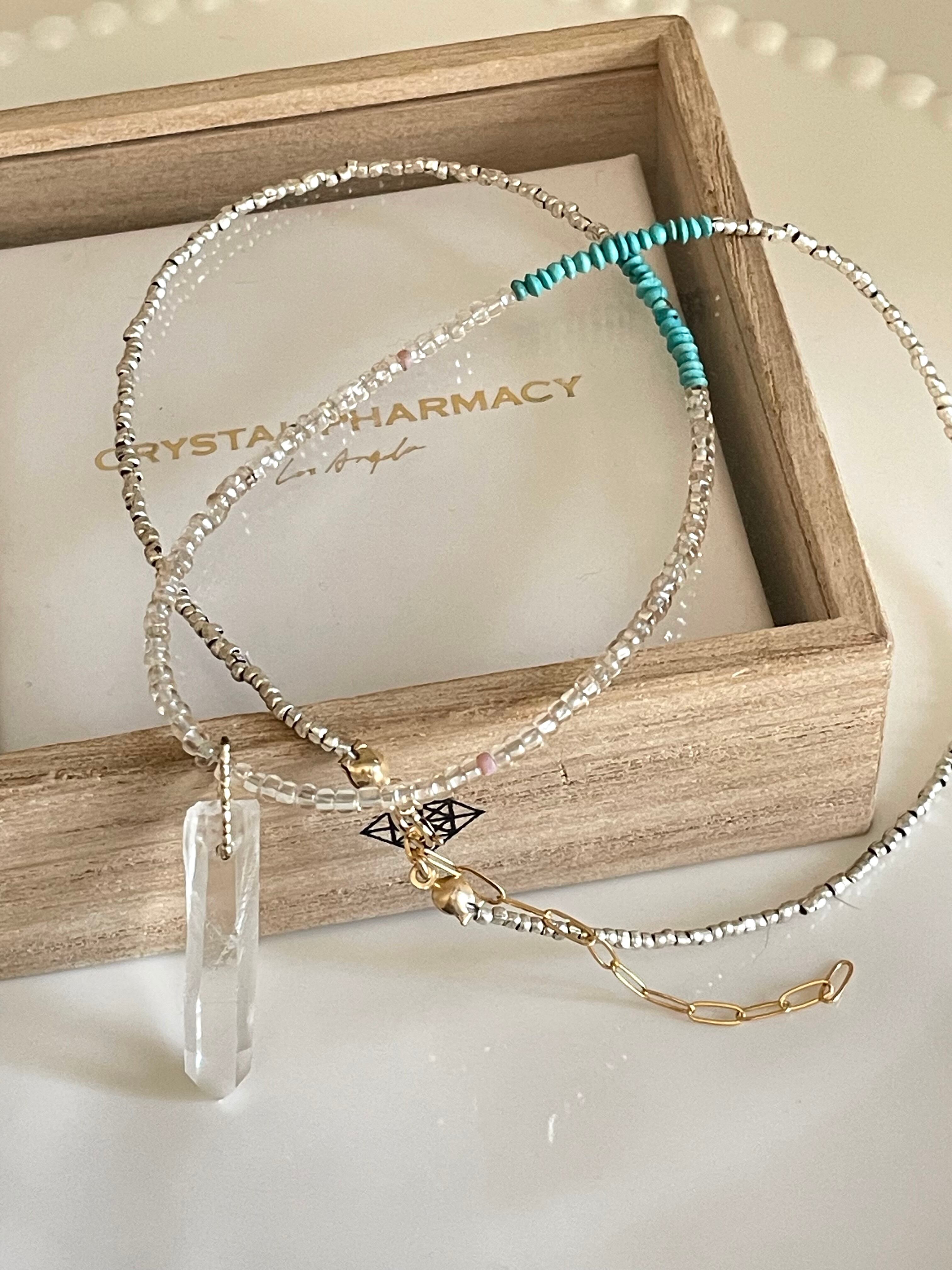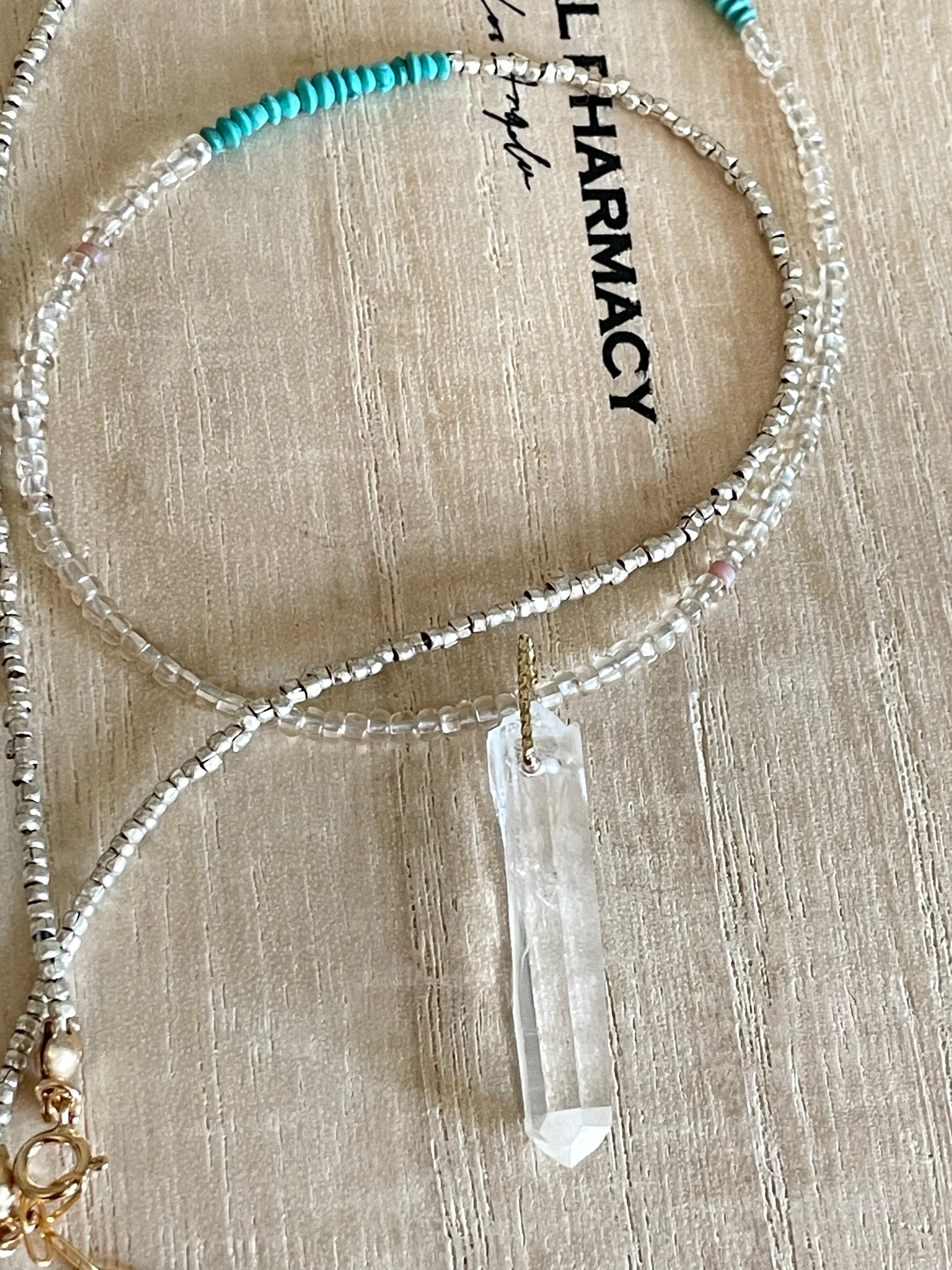 光を細かく弾くシルバービーズと、ドライな質感のターコイズ、クリアなガラスビーズ。そこにひときわ透明度の高いレムリアンシードが、静かに縦へ伸びる線を描くように揺れる、おまもりネックレス。