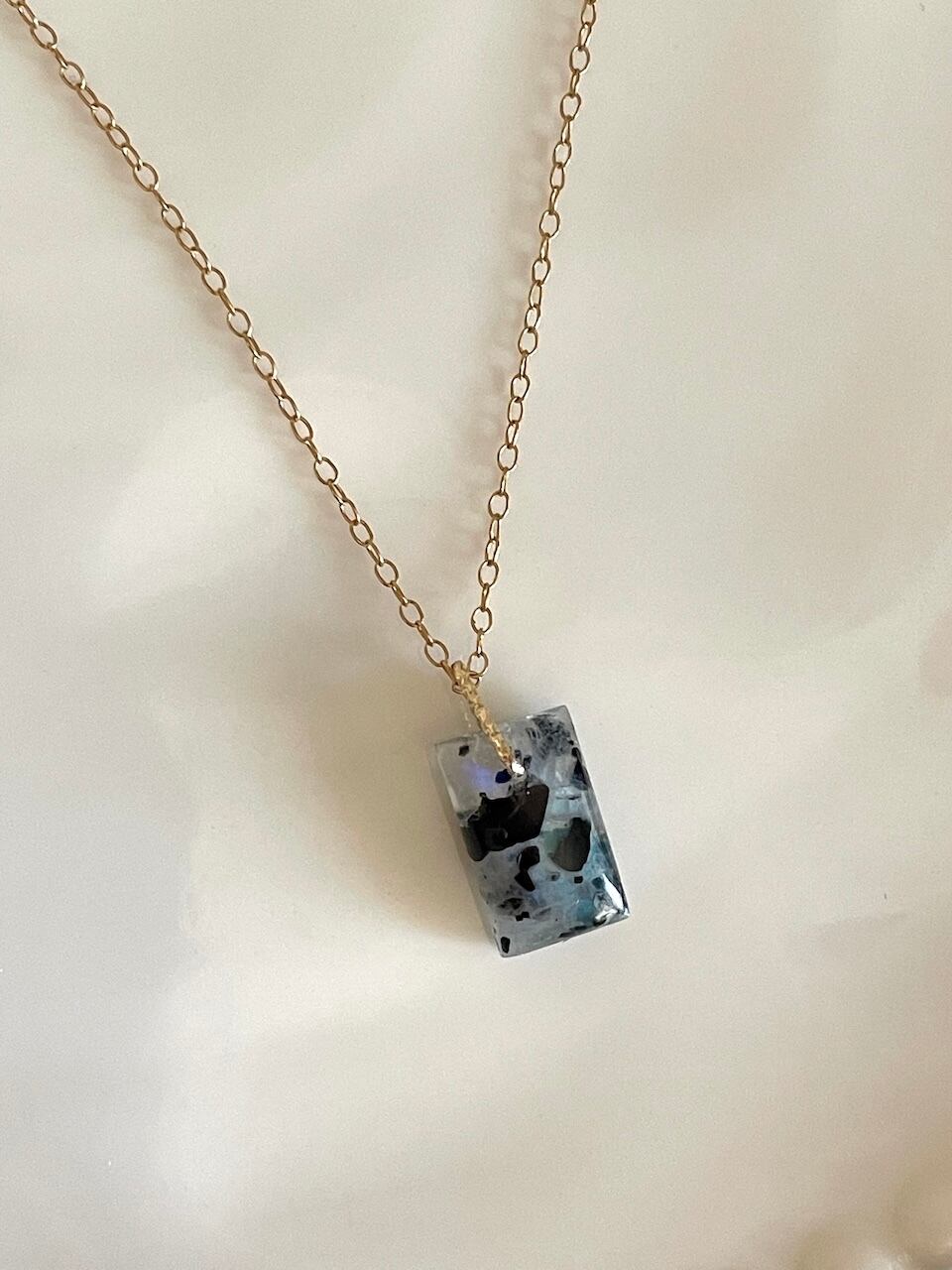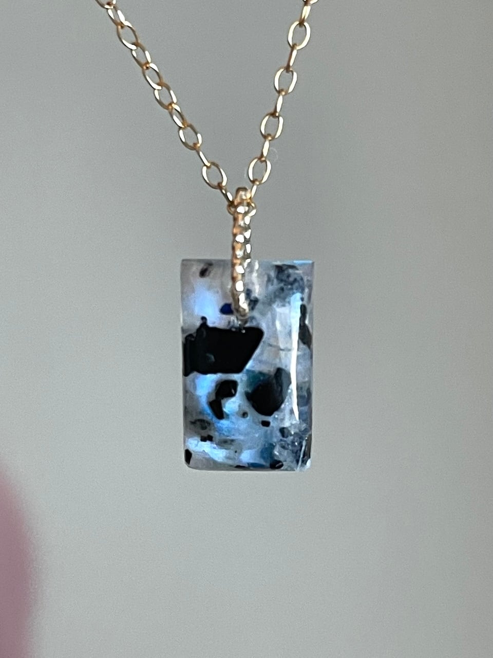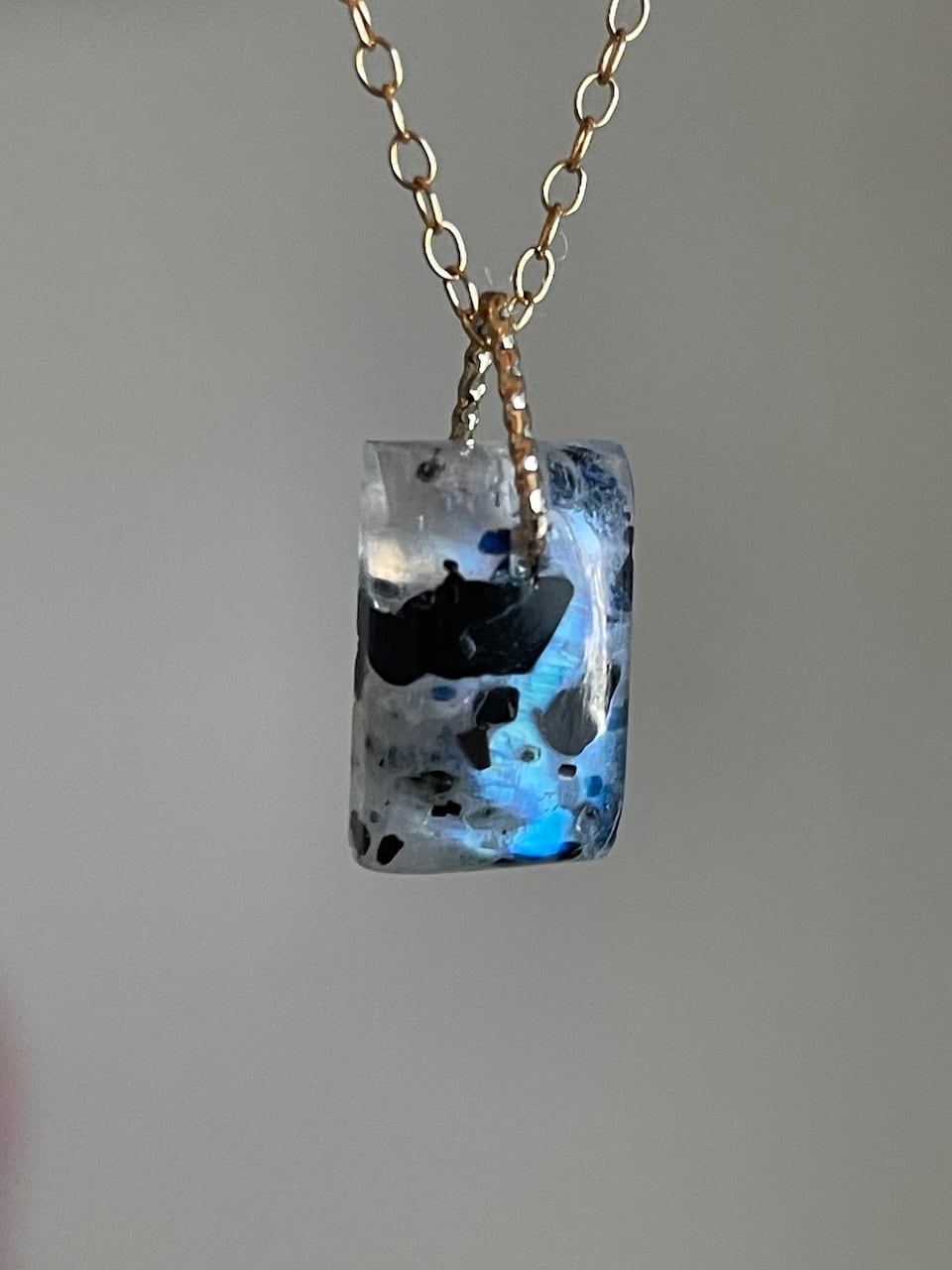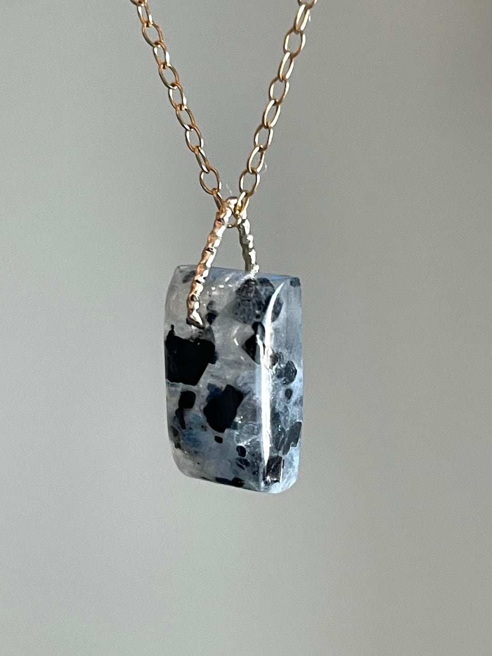 淡いミルクグレーの中に、月光がすべり込むようなブルーの閃きが漂うレインボームーンストーン。透明度の高いボディの奥に、黒いインクルージョンがモードなコントラストを描き、夜空に光のピースを散らしたような、静かでエッジのある存在感を放ちます。