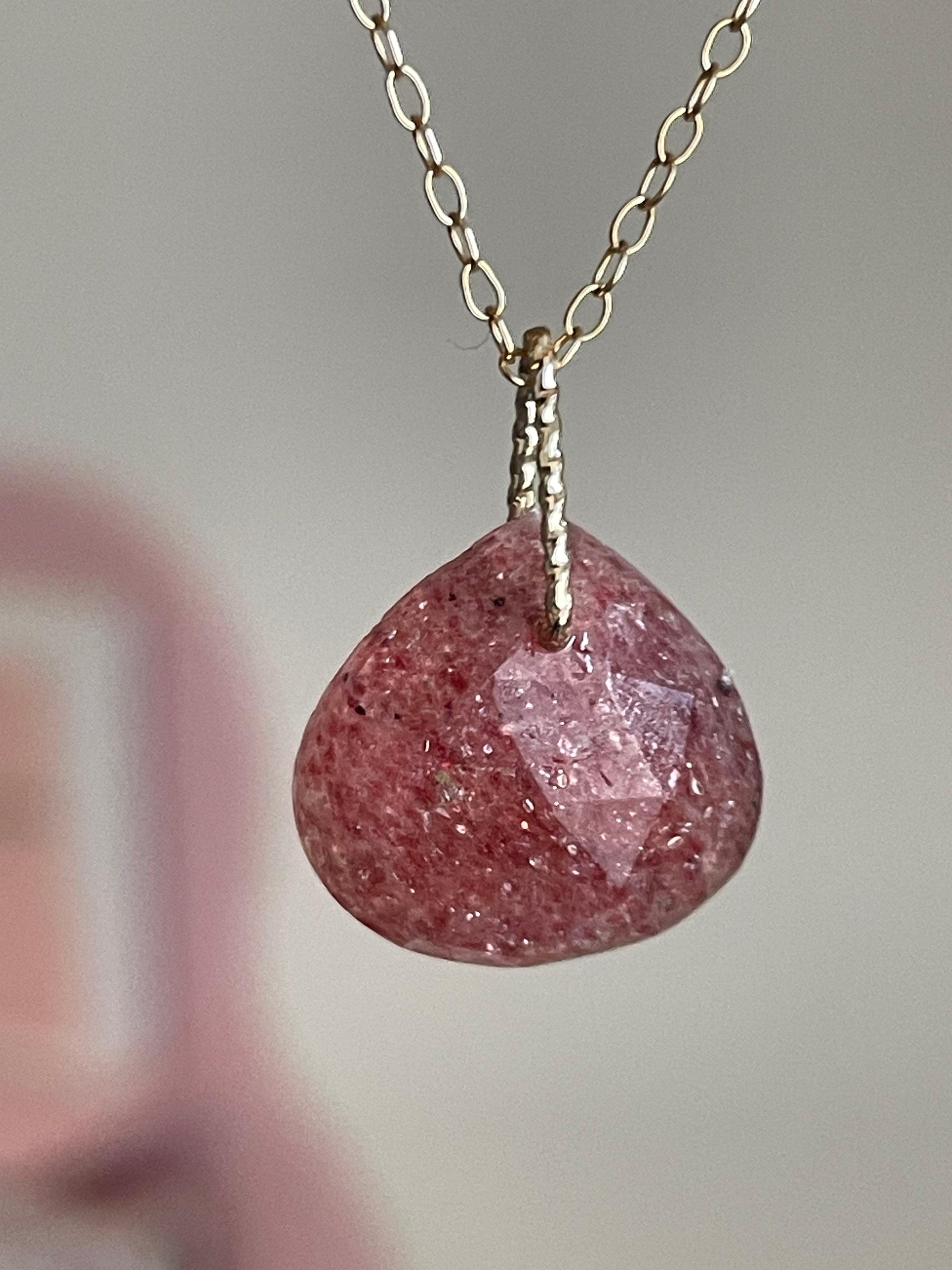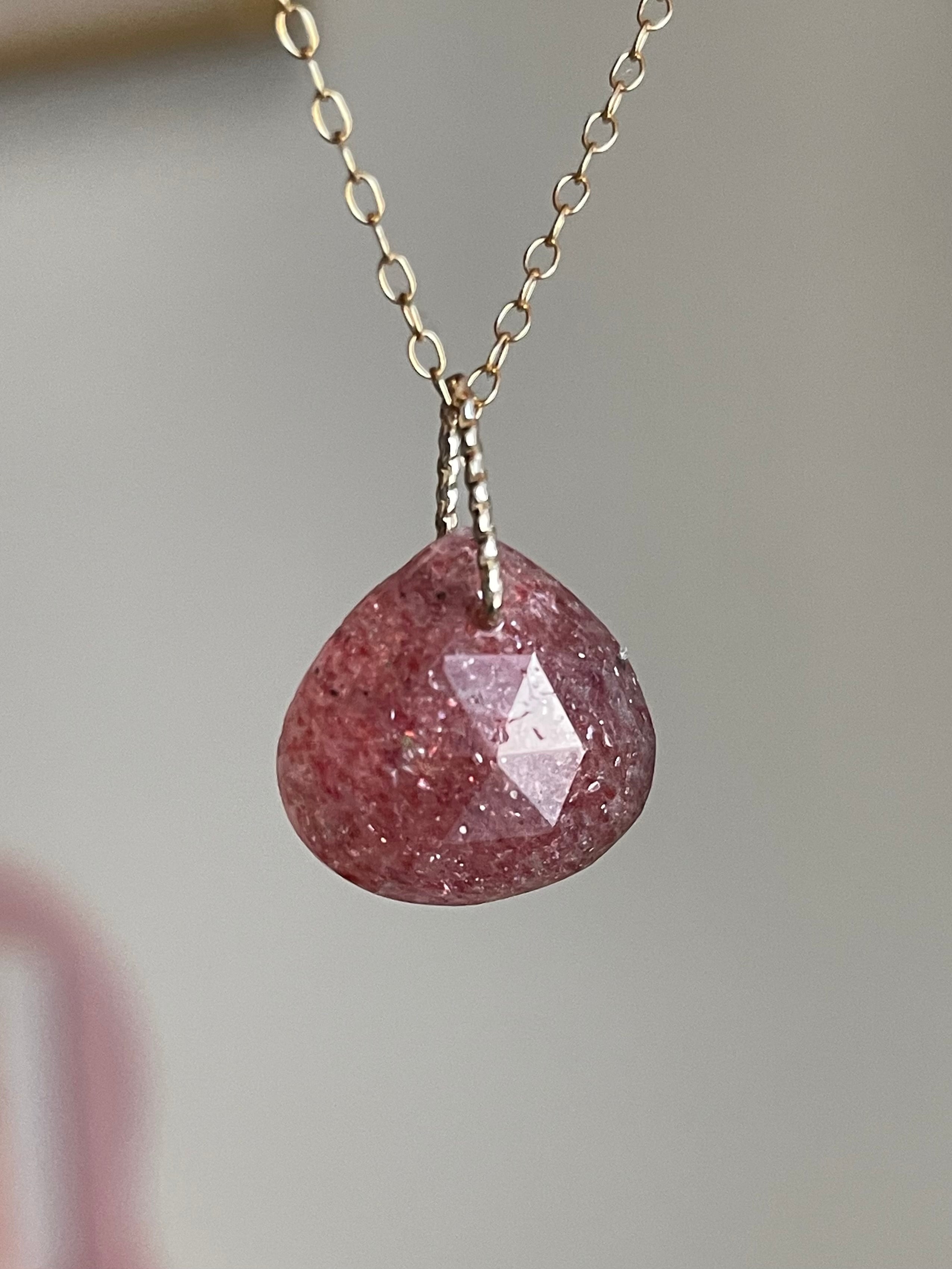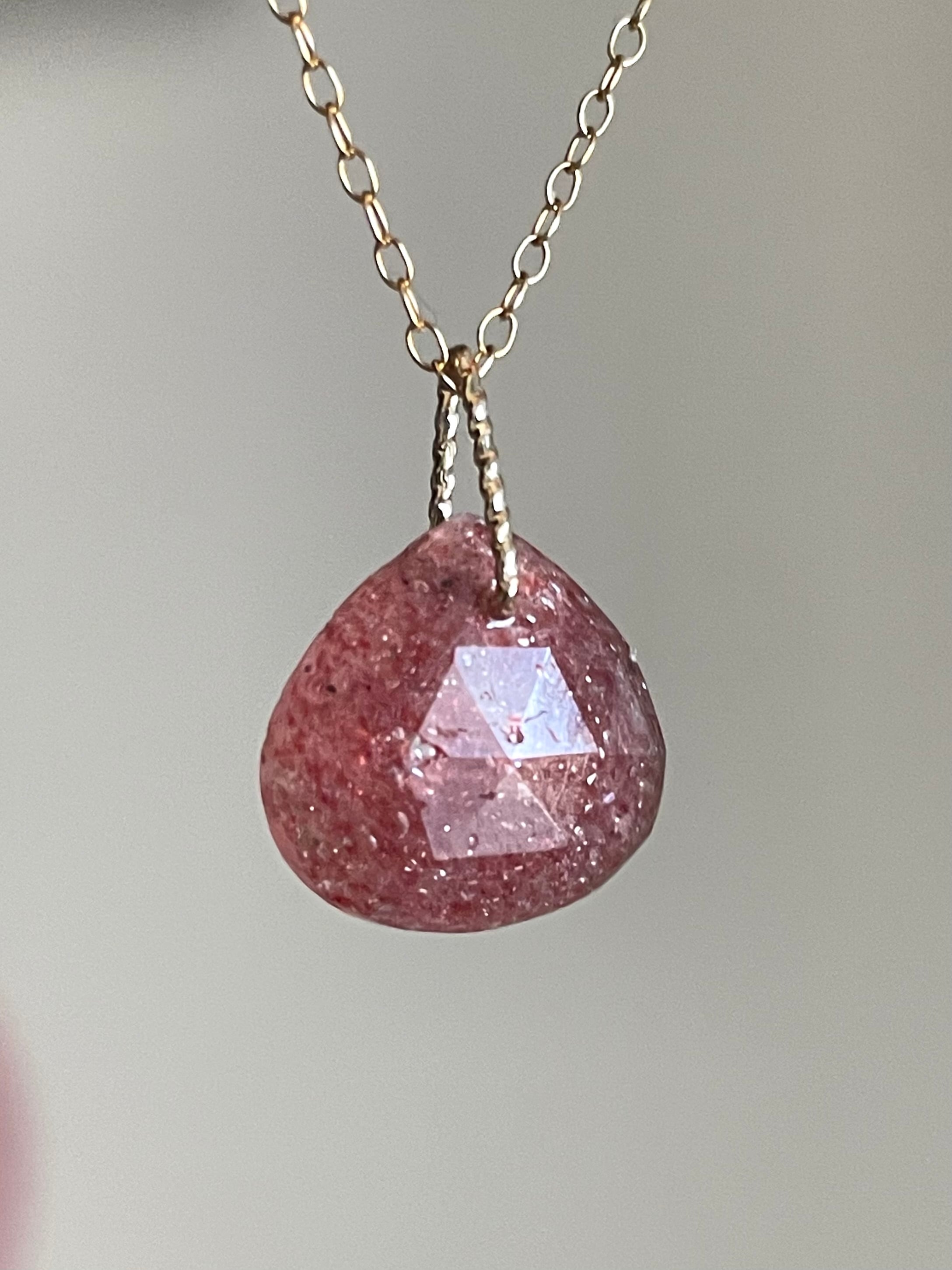 微細なレッドの内包物が光を受けてふわりと滲み、果実のような柔らかい艶をまとったストロベリークォーツ。ラフなカットと天然の表情が映し出すきらめきは、ときめきの温度を照らすように揺れる一粒です。