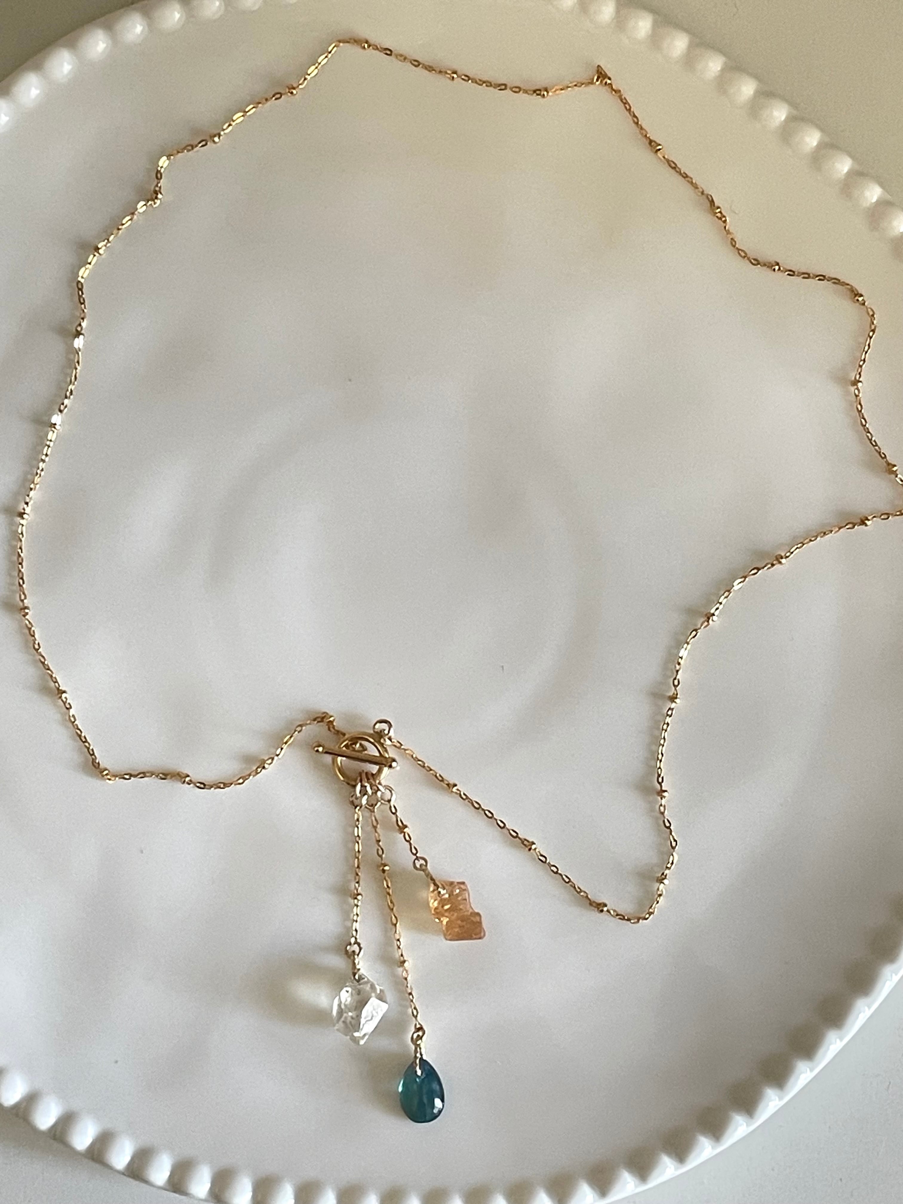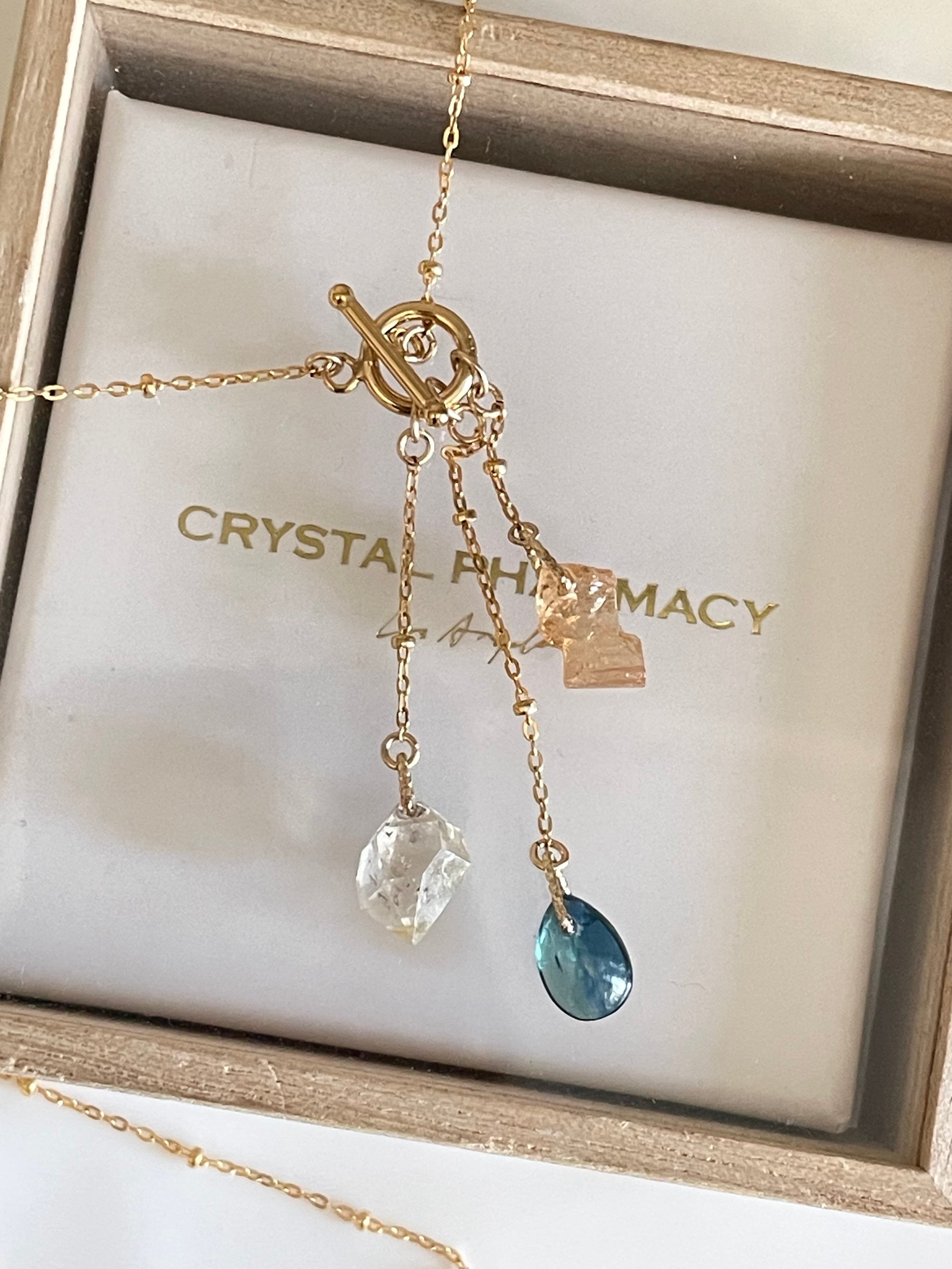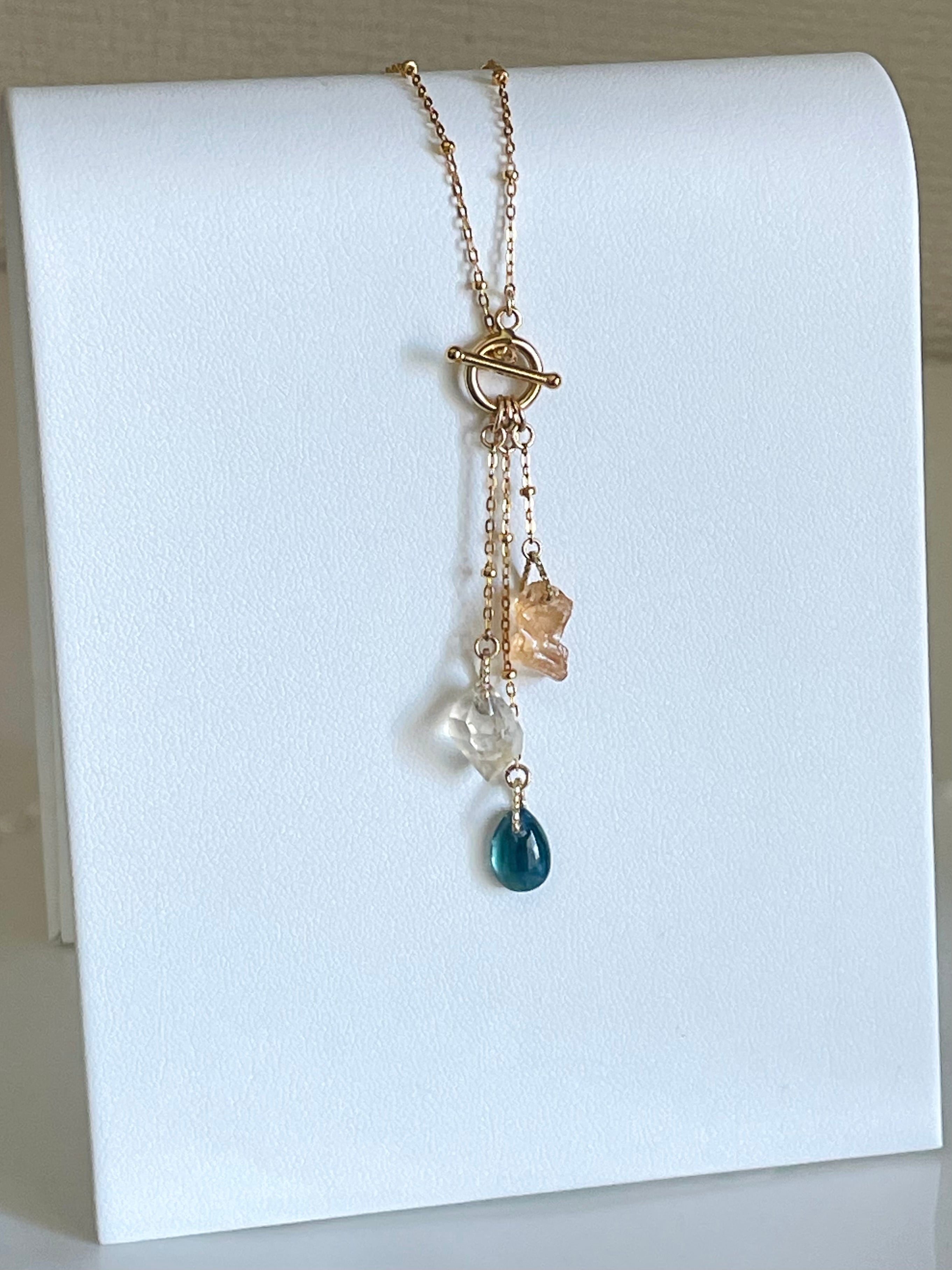 透明度の高いハーキマー型クォーツ、艶やかな蜂蜜色を宿すインペリアルトパーズ、そして深いブルーが光にとけるように滲むカイヤナイト。それぞれのストーンがまったく異なる“光の個性”を持ちながら、重なり合うことでひとつのハーモニーをつくり出します。