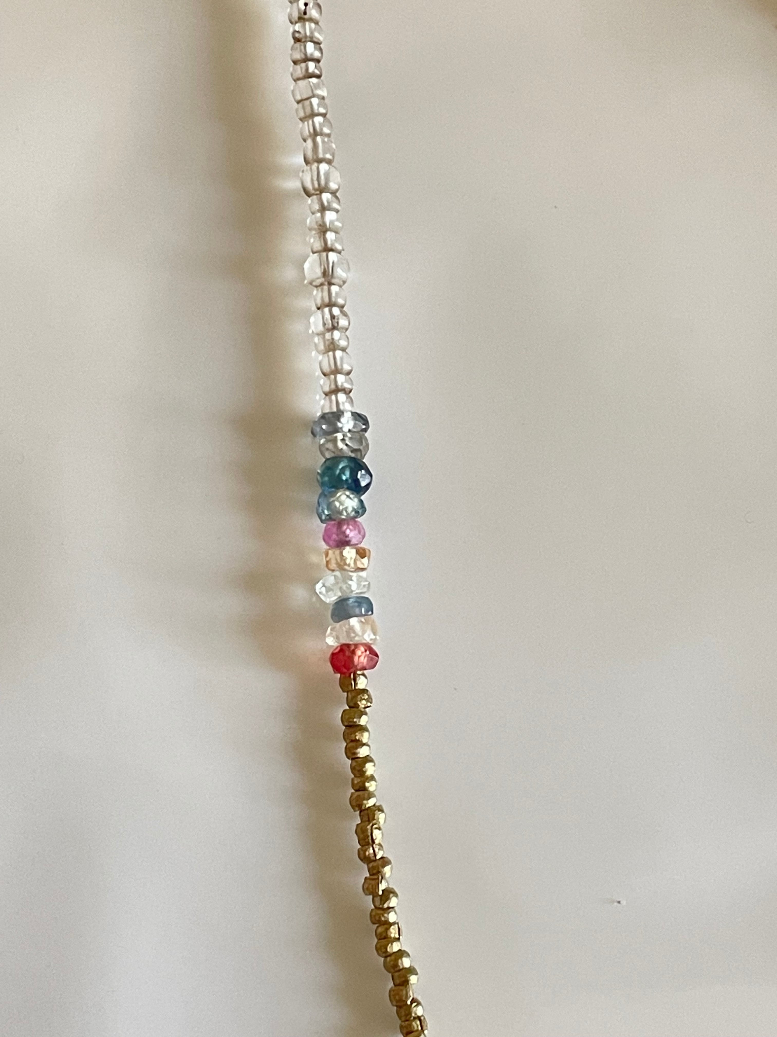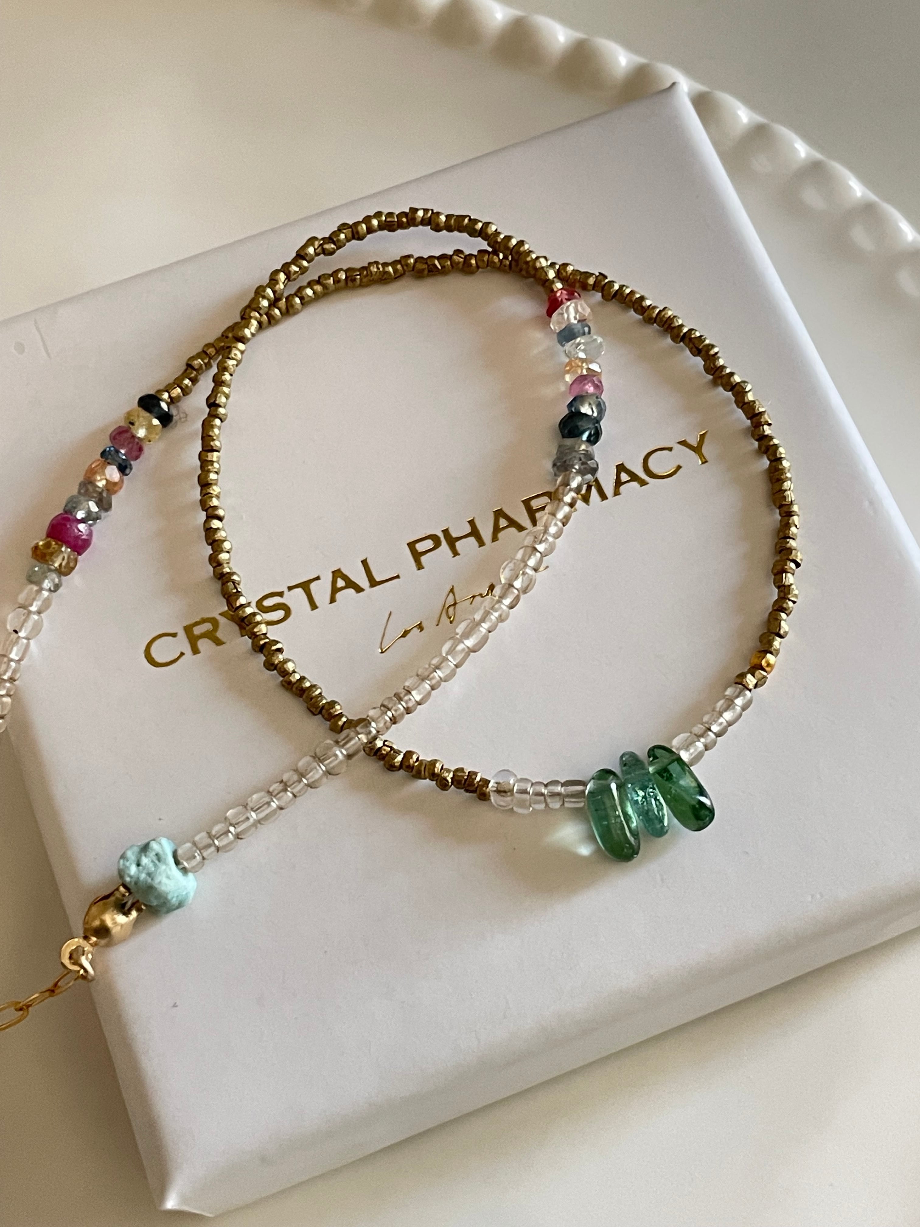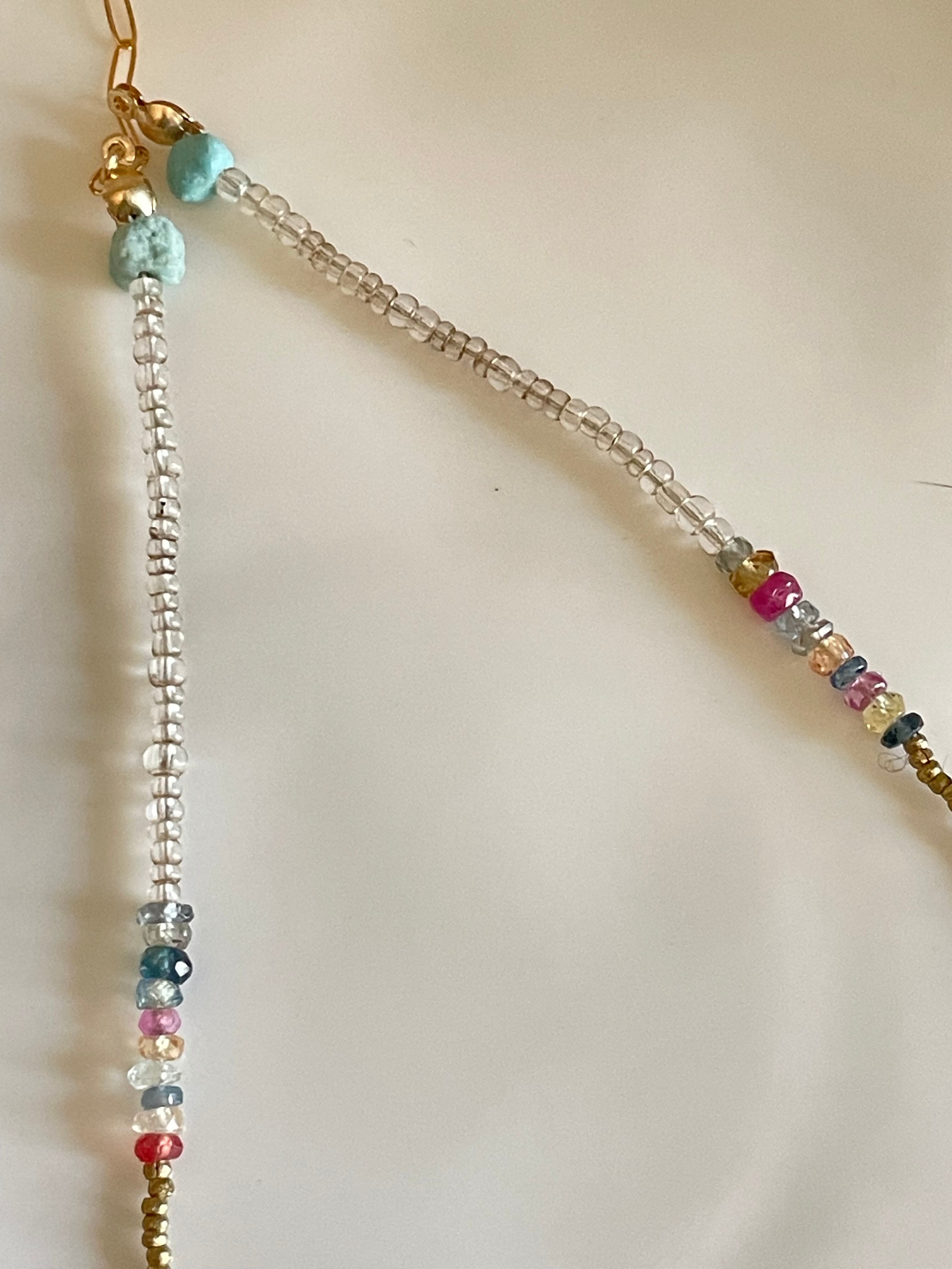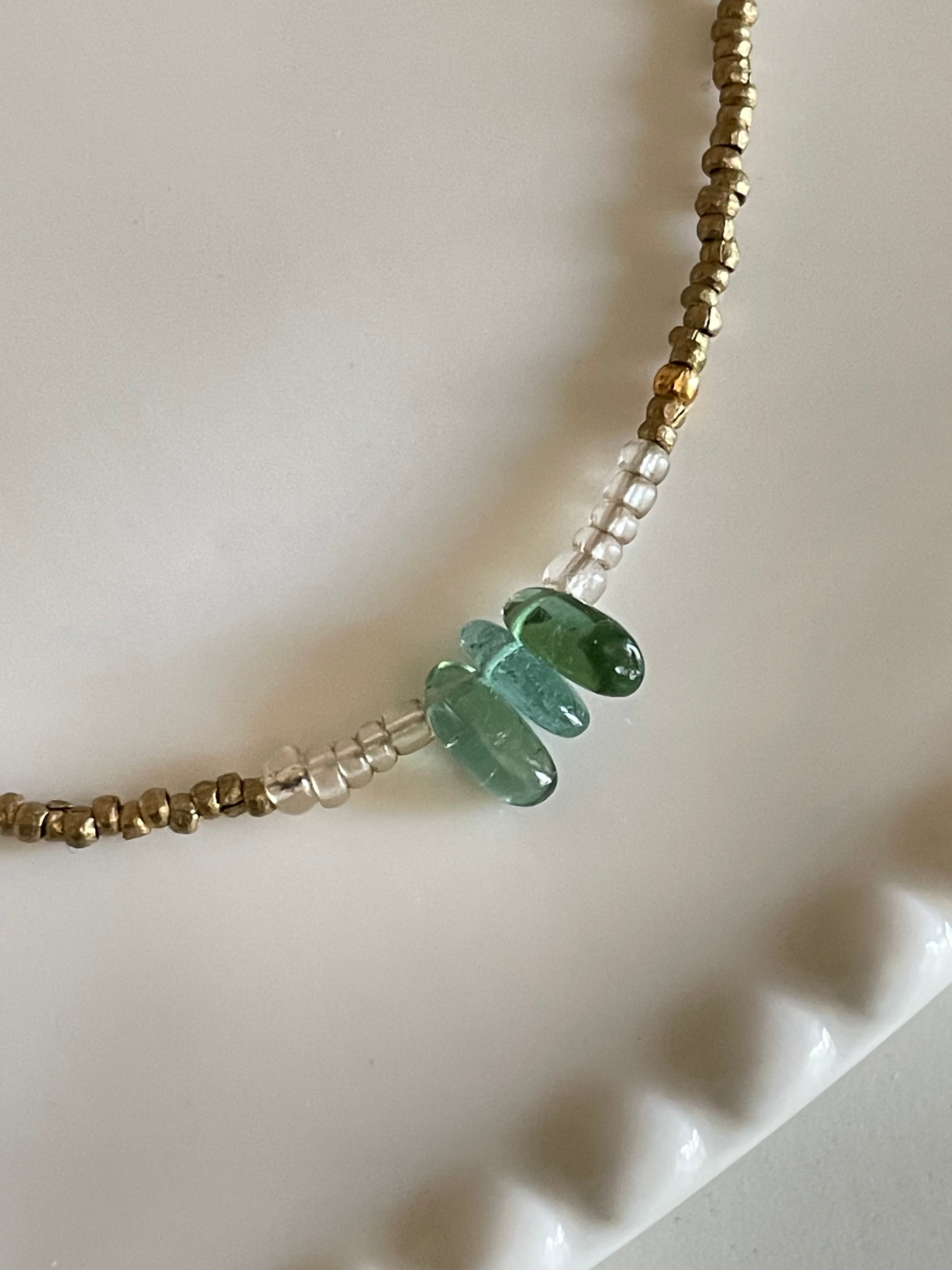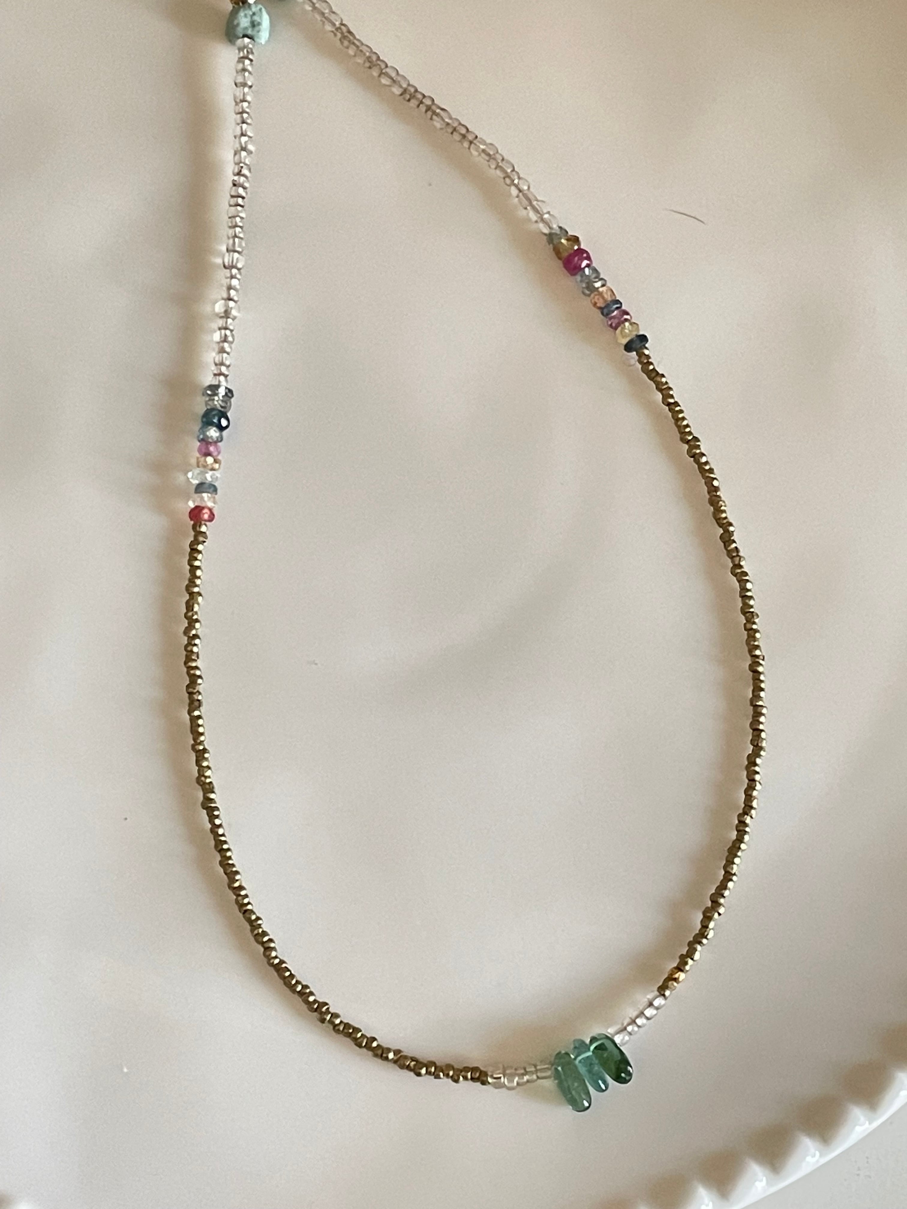 深い森の中に差し込む朝の光のように、クリアなグリーンがふっと浮かび上がるグリーントルマリンに、アフリカンヴィンテージメタルのビーズ、カラフルに輝くサファイヤ、100年以上前のガラスを使ったクリアなビーズ、ターコイズ原石をあしらった、奥行きのあるチョーカーネックレス。