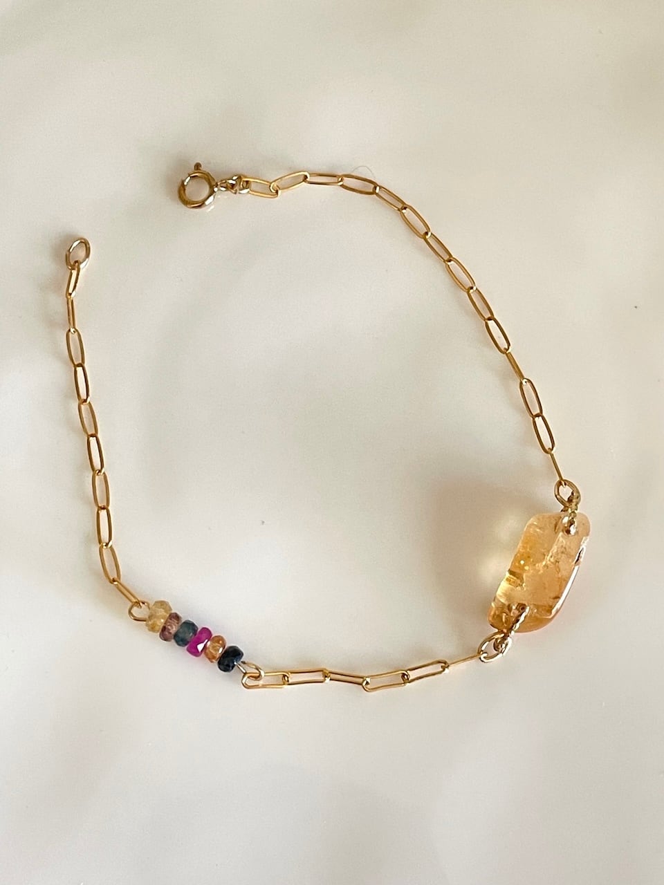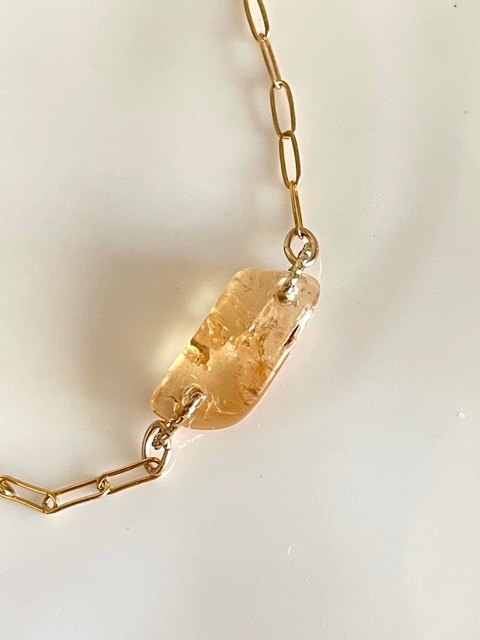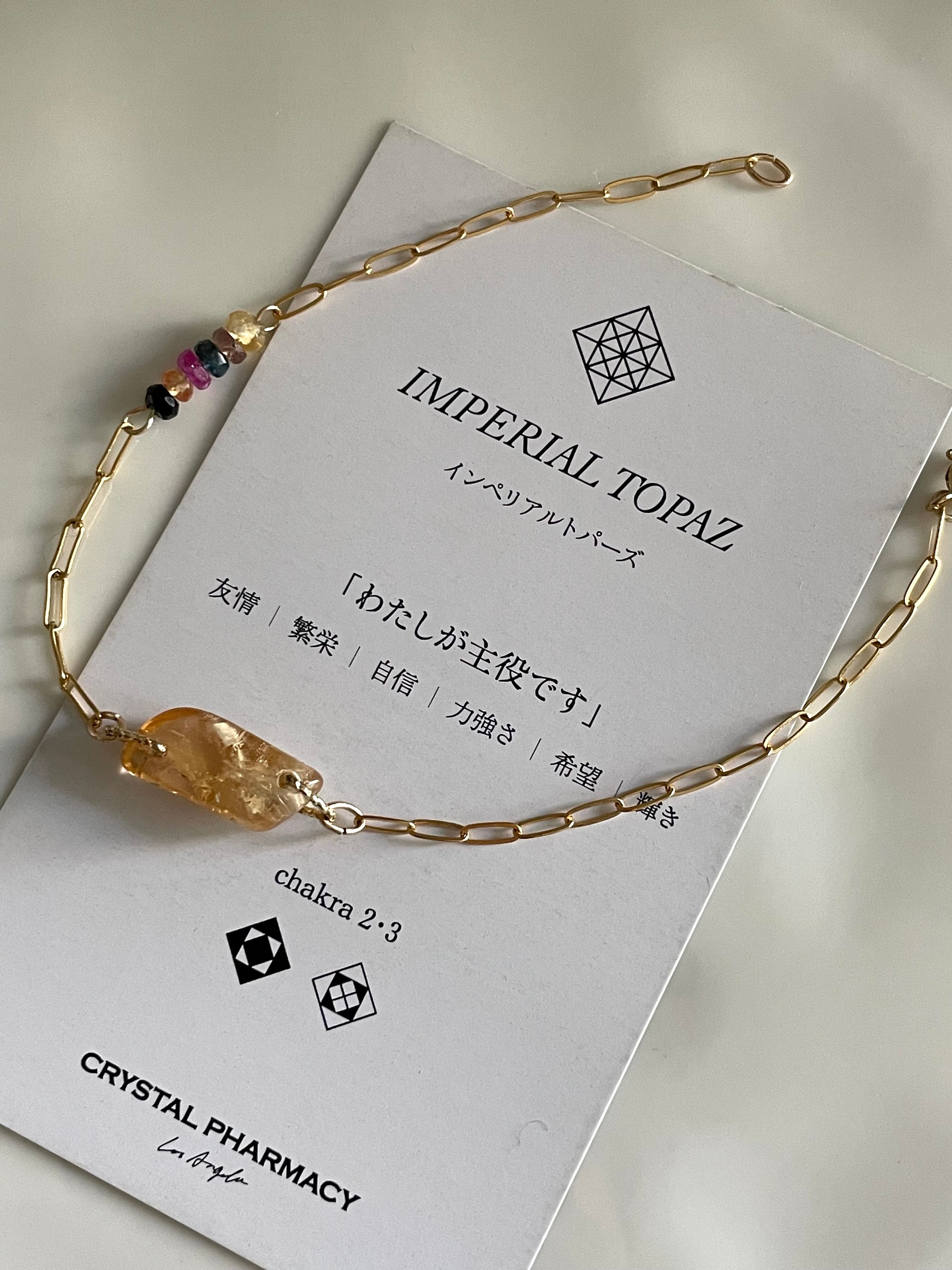 すりガラスのようなシルク感を帯びたインペリアルトパーズが、手元にそっと灯りをともすようなブレスレット。