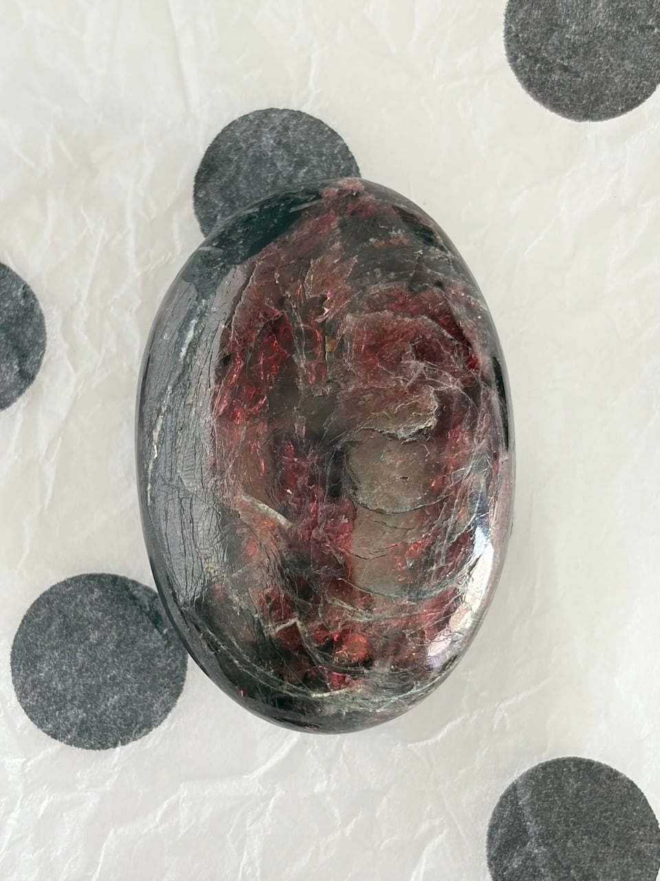 一見すると落ち着いたトーンでありながら、角度によって内包された美しいガーネットの結晶が輝きを見せてくれます。なめらかに磨き上げられたフォルムは手のひらに心地よく馴染み、触れるたびに石の温度と重みを感じられる、贅沢な宝石のパームストーンです。