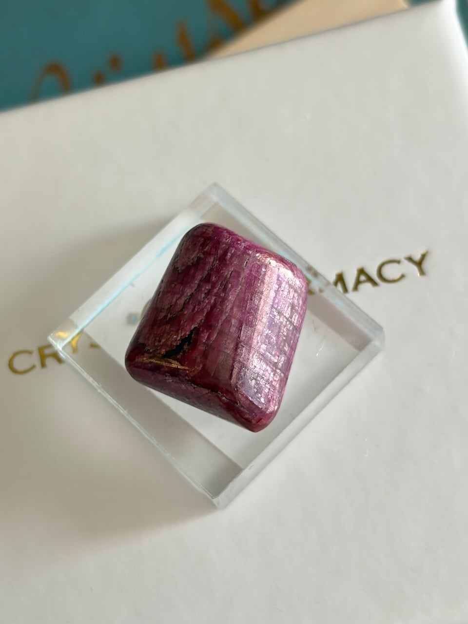 鮮やかなピンク〜レッドの発色と、結晶の層がそのまま残ったようなストライプ状のテクスチャが印象的なルビーのタンブル。