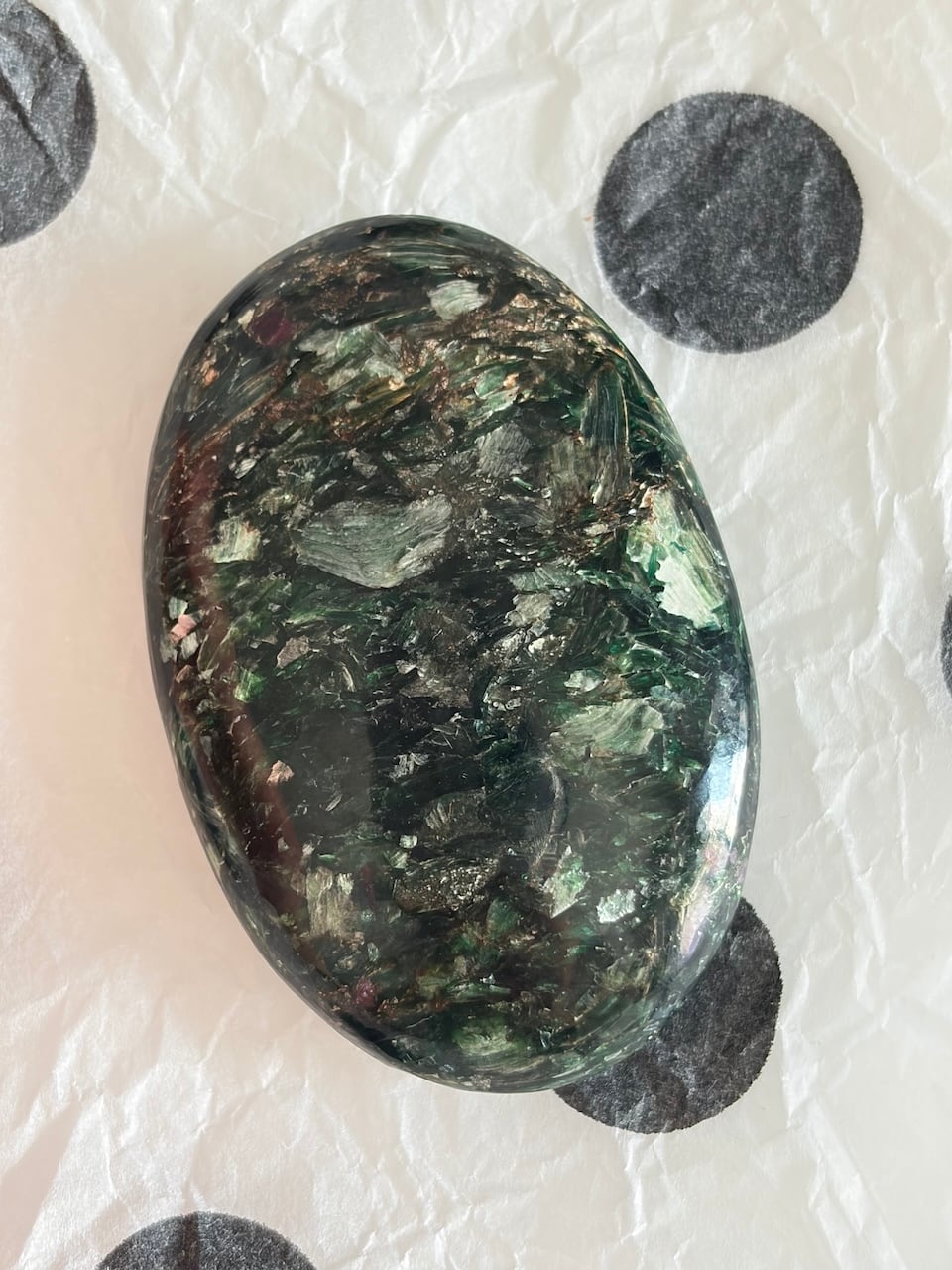 ルビー・イン・フッサイトは、癒しと情熱という相反するエネルギーを内包する石として知られ、内側のバランスを整えながら、自分らしい前進を後押しすると言われています。