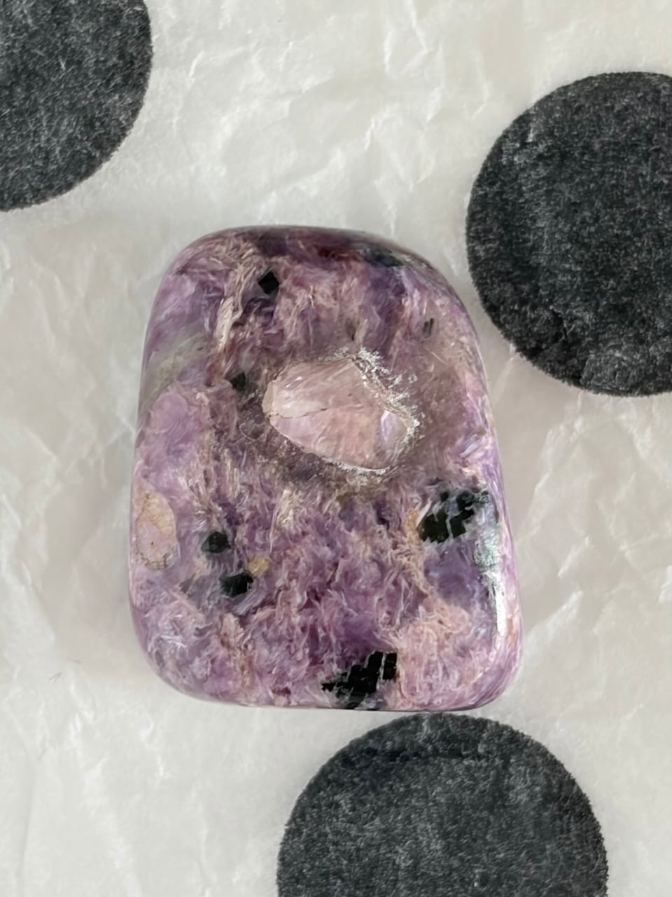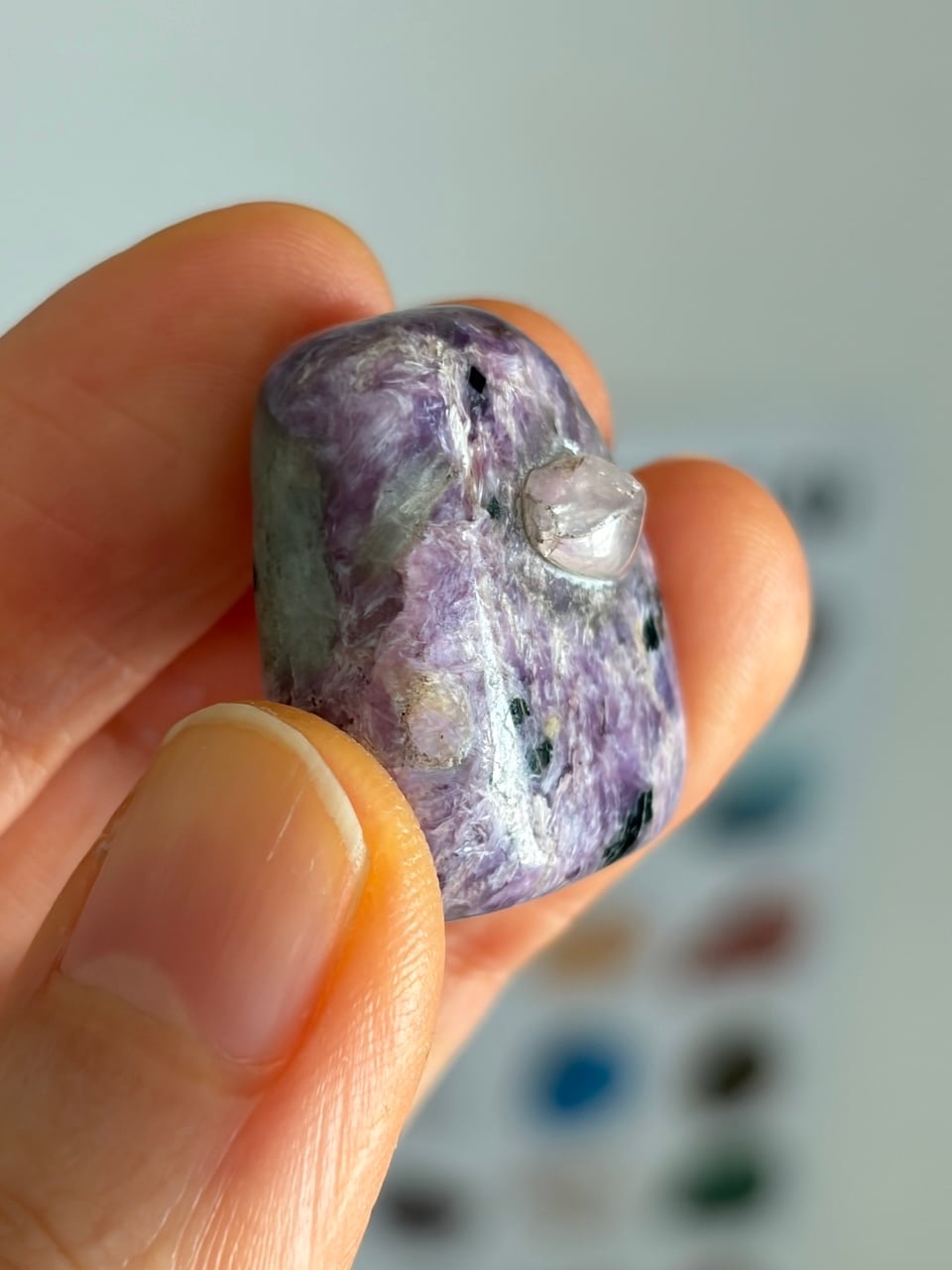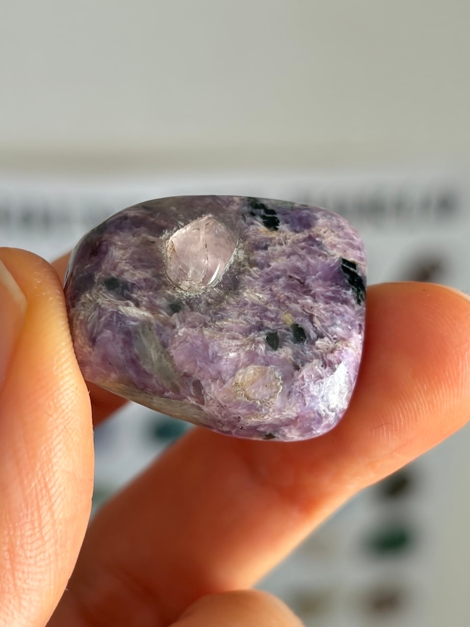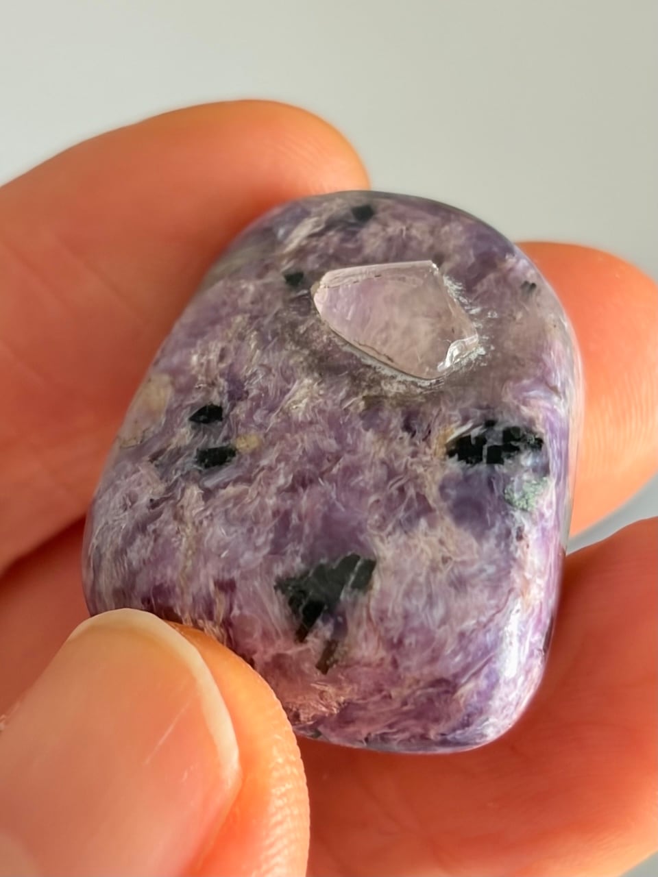 やわらかなラベンダーの渦の中に、小さな水晶の結晶がぽつんと顔をのぞかせた、愛らしいチャロアイトのタンブル。