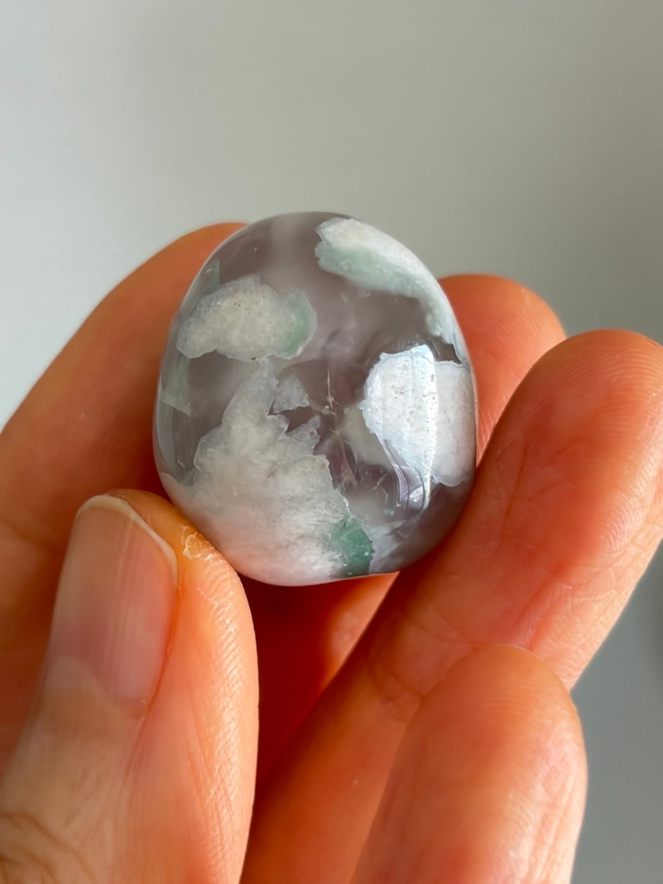 淡いミルキーホワイトの中に、やわらかなグリーンがふんわりと広がり、小さな花が咲いたような模様が浮かび上がるグリーンフラワーアゲート。