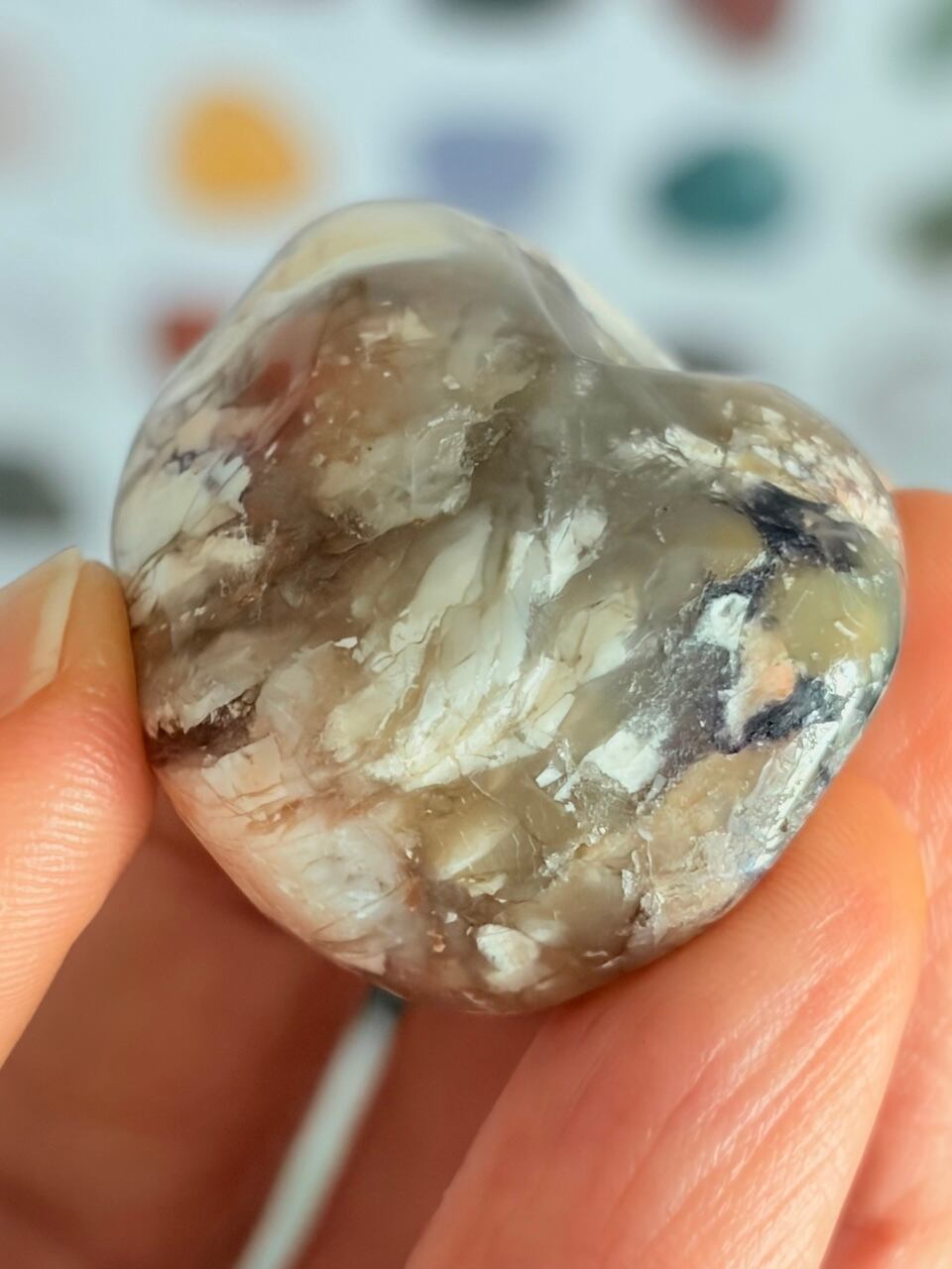 やわらかなラベンダー、スモーキーなグレー、クリーミーなホワイト、時にピンクやブラックを含んだ複雑な模様が重なり合い、それぞれがまるで小さな抽象画のような世界をつくり出しています。同じ石でありながらここまで個性が分かれるものは珍しく、どの一粒にも偶然が生んだ美しさが詰まっています。