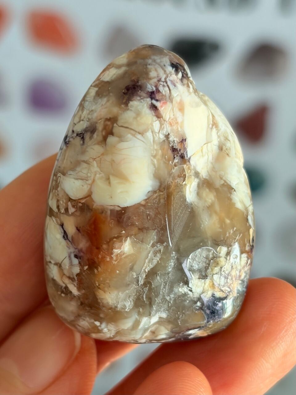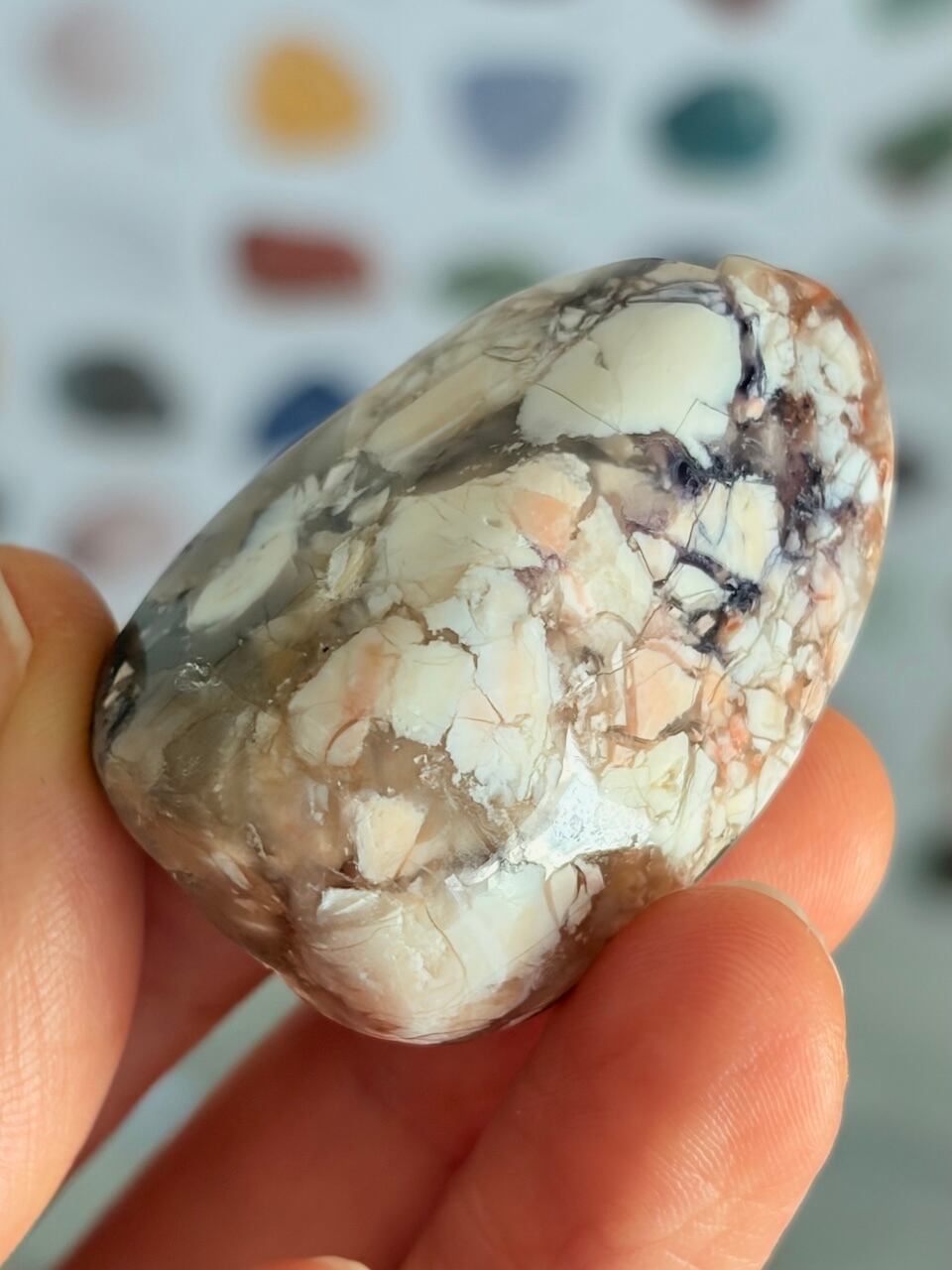 ティファニーストーンはアメリカ・ユタ州の限られた地域で産出される希少な石で、主にフローライトを含む複合鉱物として知られています。流通量自体が多くないうえに、ここまで色や模様のバリエーションが豊かなタンブルはなかなか出会えません。