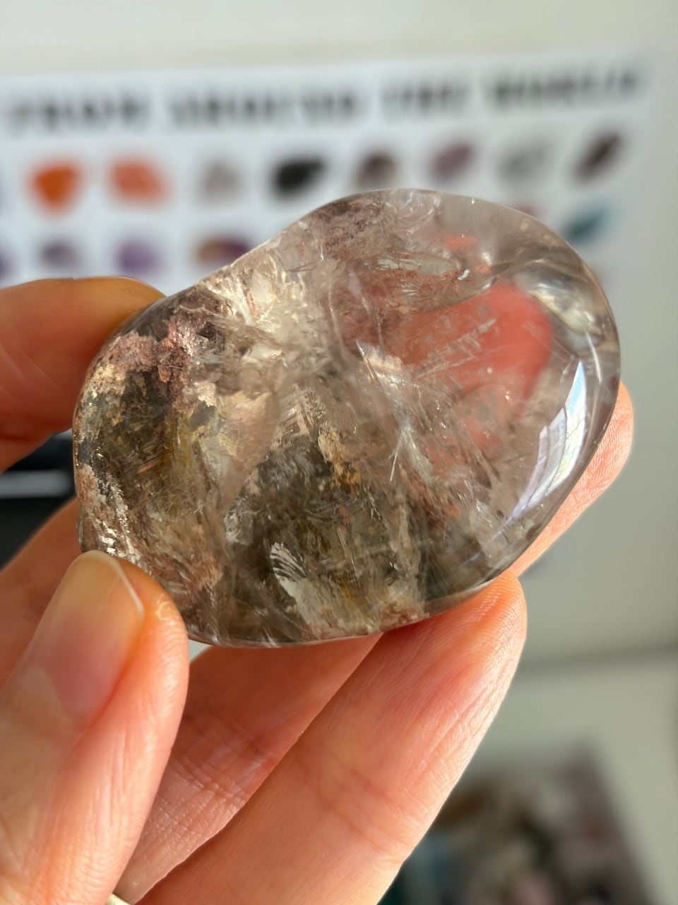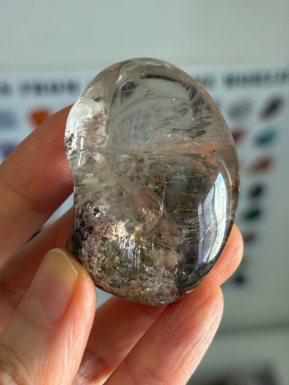 透明な水晶の中に閉じ込められているのは、静止したものではなく、かつて確かに流れていた「動き」そのもののようにも見える一粒です。光の角度によって浮かび上がる繊細な筋や揺らぎは、まるで見えない流れがそこに残り続けているかのようで、触れているだけで、意識の奥に静かな余白をつくってくれます。