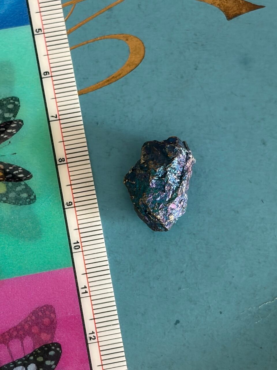 無骨な原石の表情の中に、金属的な光沢と虹色の発色が混ざり合い、鉱物そのものが内側から発光しているかのような存在感があります。ざらりとしたマットな部分と、強く反射する面が共存しているため、どの角度から見ても違う表情を見せてくれるのも魅力のひとつ。それぞれの個体で発色の出方や色のバランスが大きく異なるからこそ、自分にぴったりの一粒に出会う楽しみを与えてくれます。