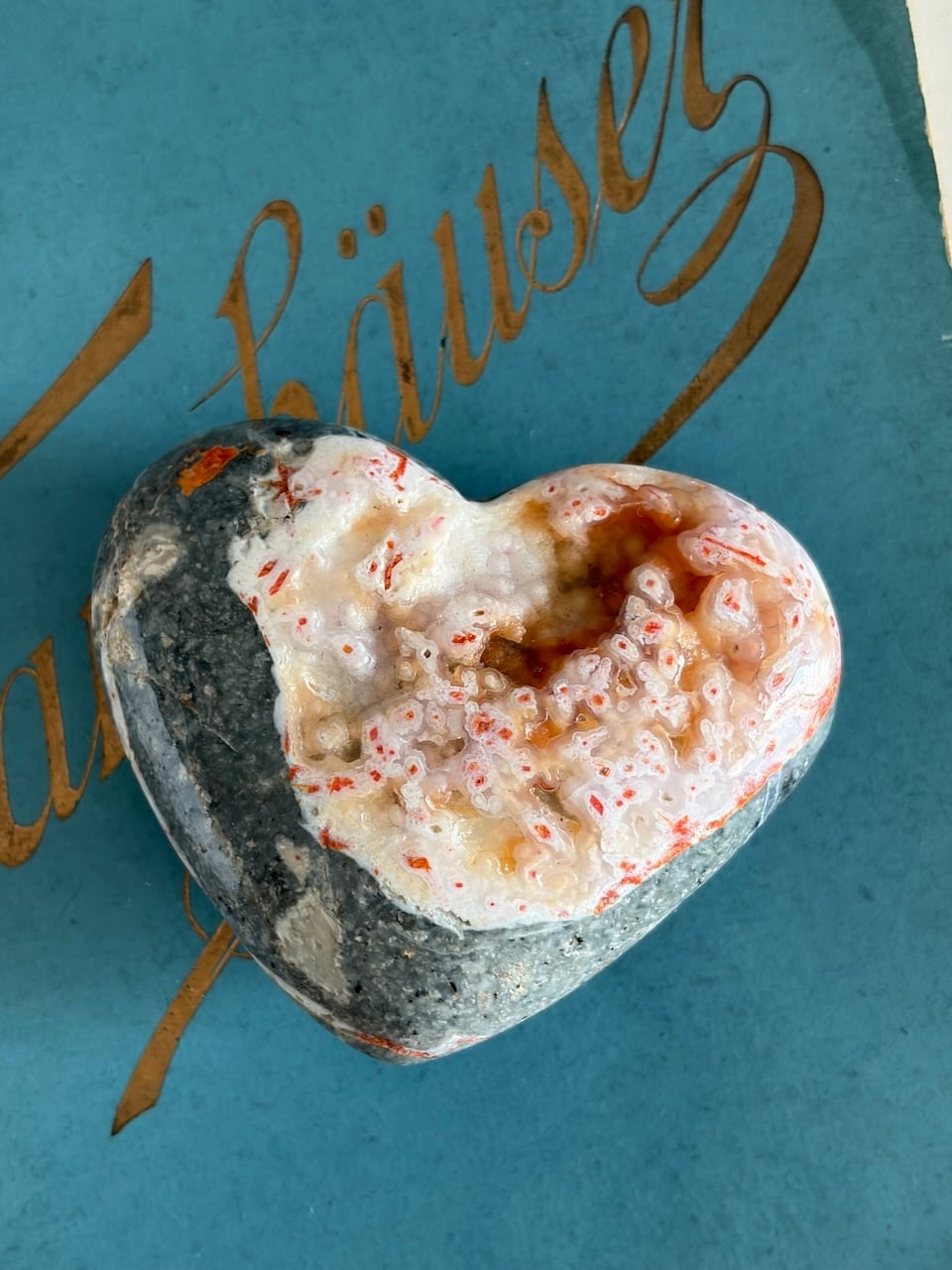 ぷくぷくとした立体的な模様や、溶岩が冷えて固まったような流動的な表情がとても個性的。それぞれが偶然の重なりによって生まれた有機的な美しさを持っています。ハートシェイプでありながら甘さに寄りすぎず、どこか原始的で力強い存在感を放つ一石です。