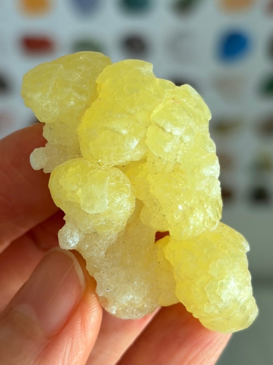 淡いイエローを基調に、ほんのりと乳白色が混ざり合い、光をやさしく受け止めるような柔らかい表情をしています。表面には細かな凹凸や丸みが連なり、自然の中でゆっくりと成長した痕跡がそのまま残されているような、愛嬌のある存在感。ひとつひとつ形もボリュームも異なり、手に取るとそのユニークさと可愛らしさに思わず目を奪われるストーンです。