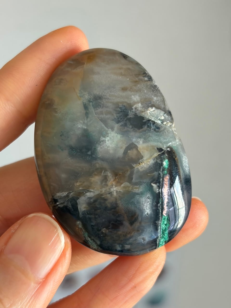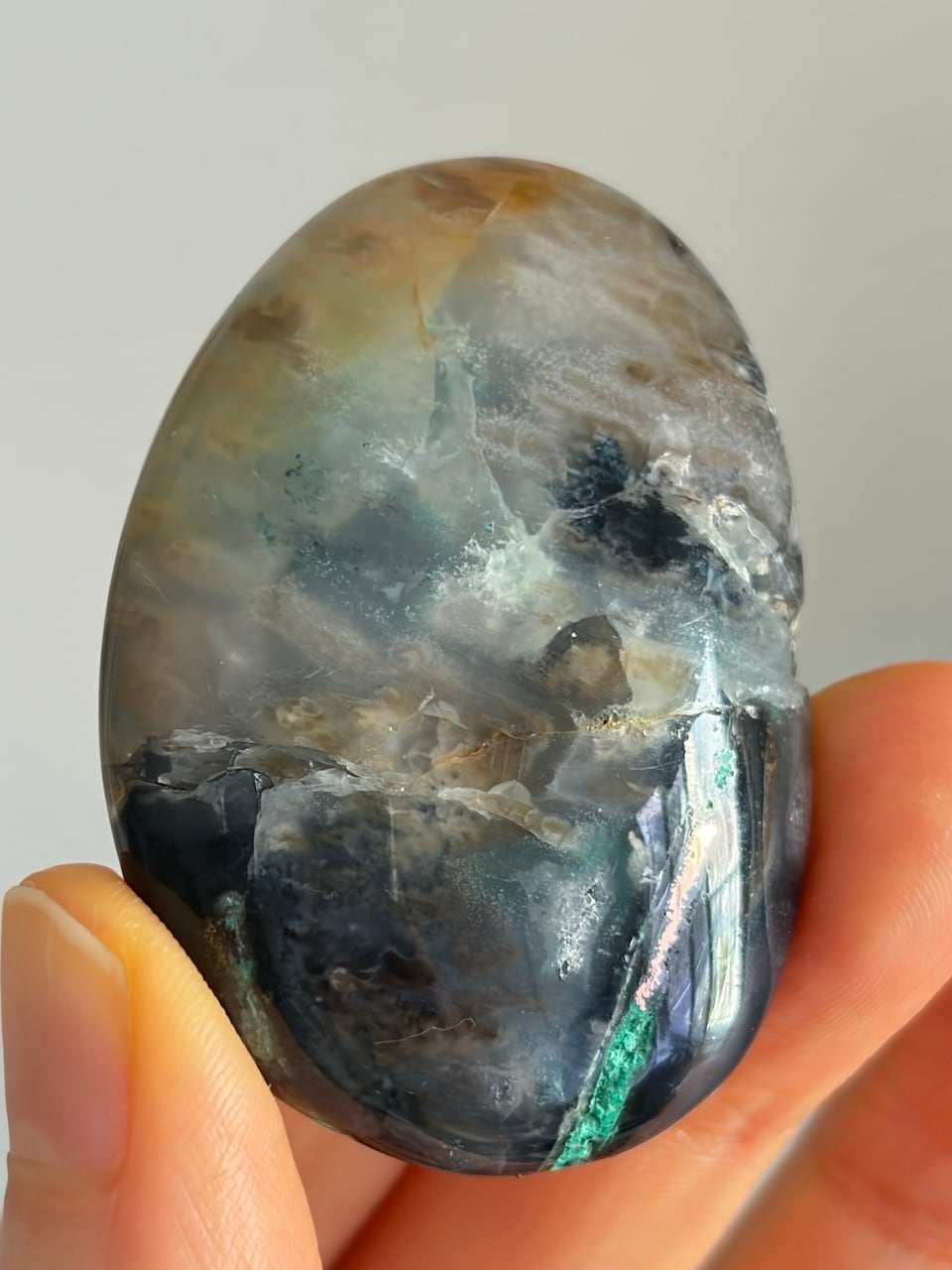 半透明の層の奥に、鉱脈や苔のようなインクルージョンが入り込み、光の角度によって異なる表情を見せてくれます。ひとつの石の中に閉じ込められたような有機的な構造が、小さな世界をそのまま切り取ったかのような魅力を持つ一石です。
