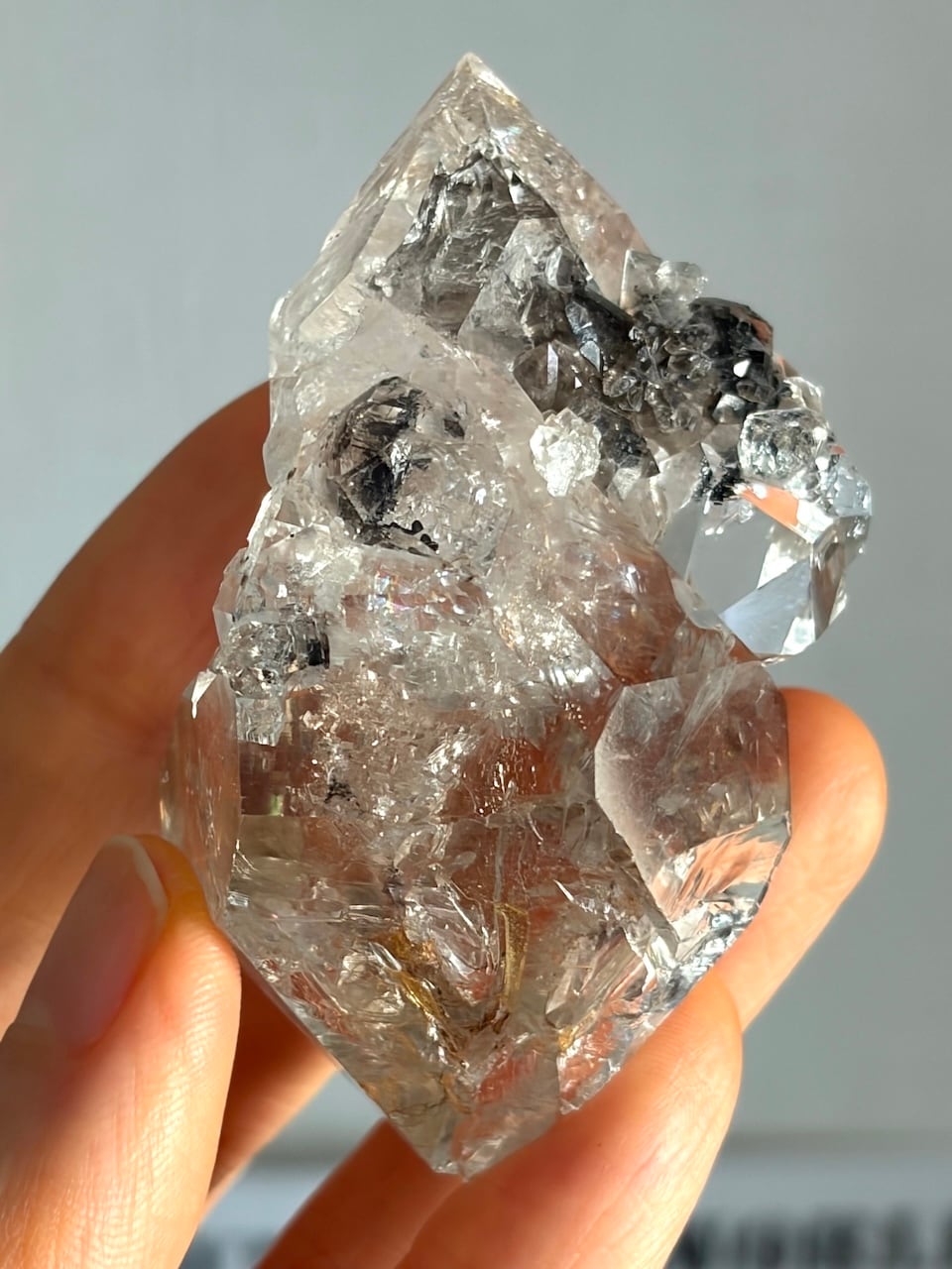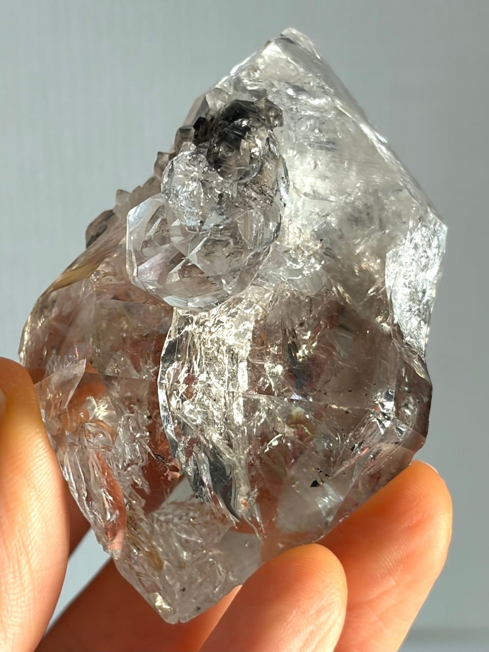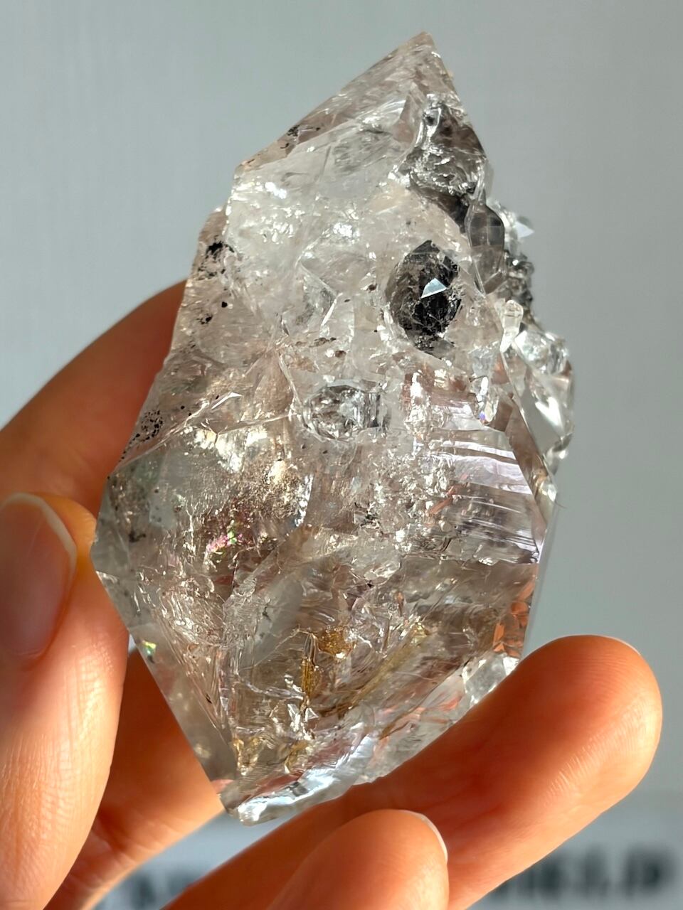 一般的にハーキマーは、意識をクリアにする、エネルギーの通り道を整える石として知られていますが、この個体はそれとは少し異なり、整った秩序ではなく、揺らぎや混ざり合いの中から生まれた“もう一つの美しさ”を持っています。異物を取り込みながらも、そのまま成立している姿は、どこか人間の在り方にも重なります。