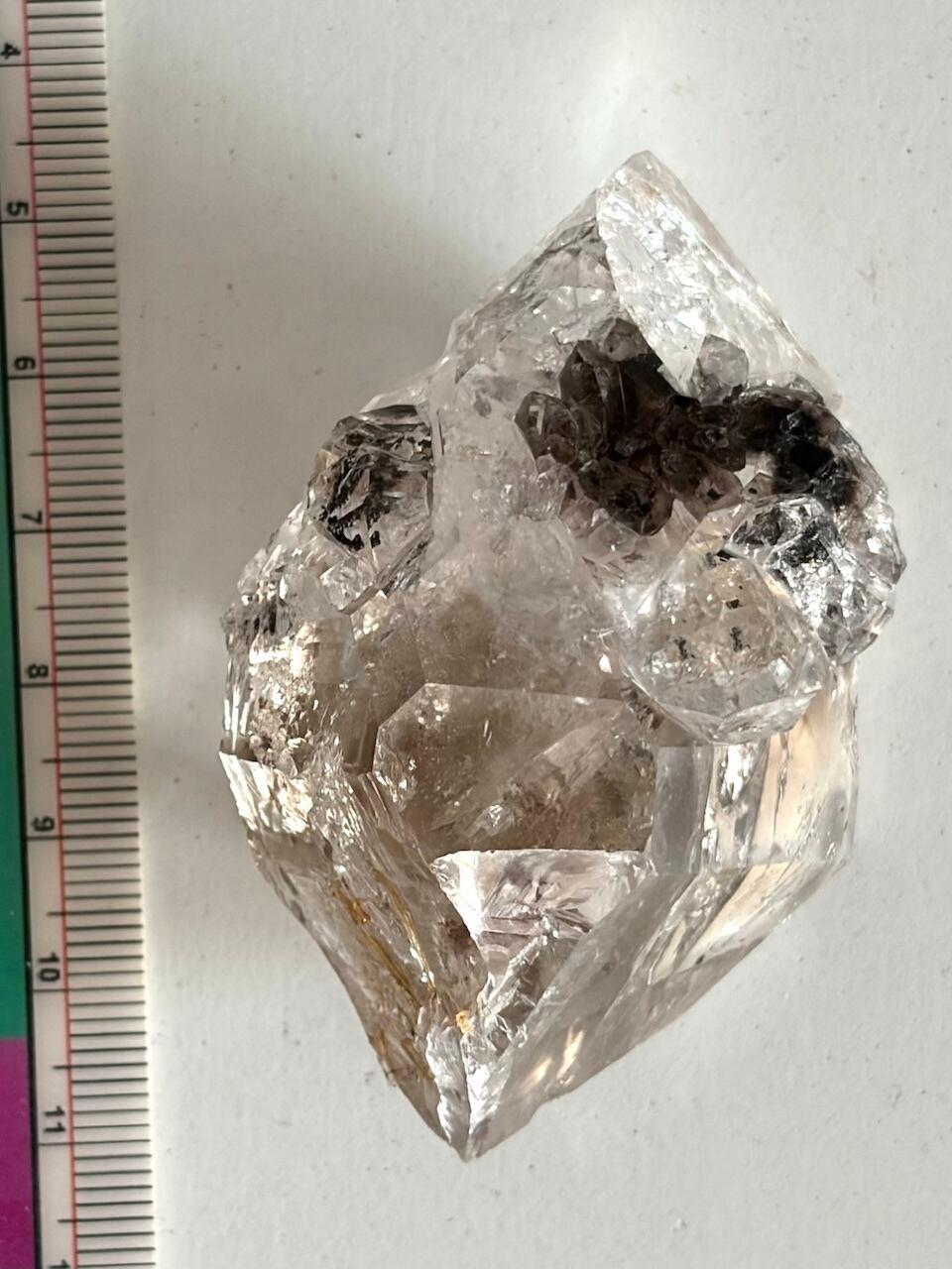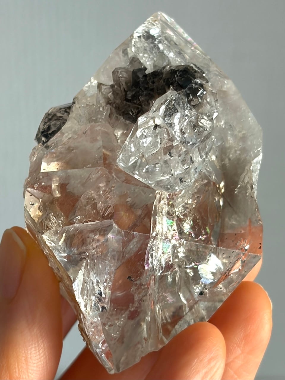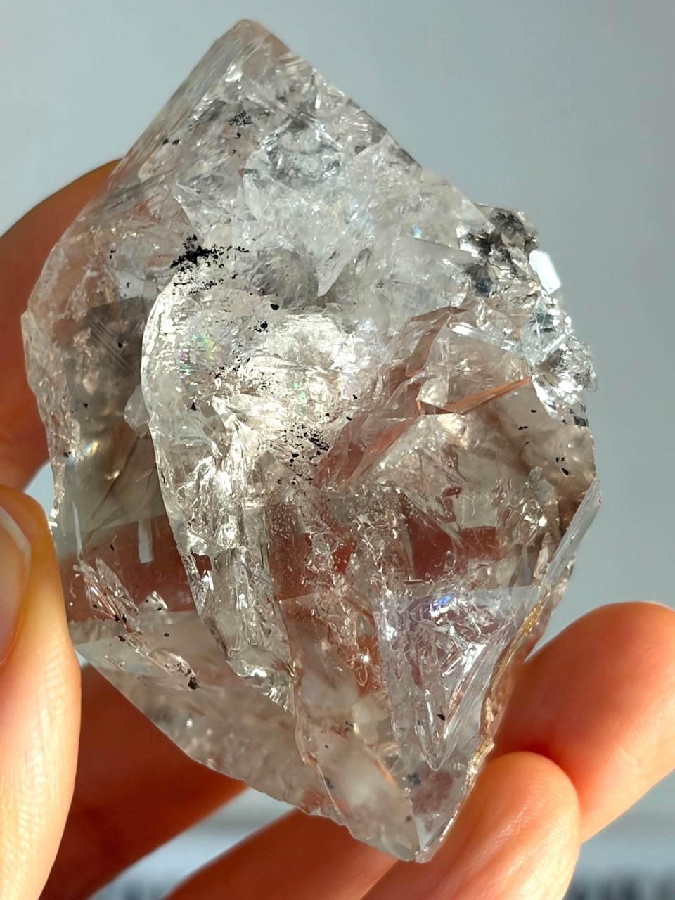 一般的にハーキマーは、意識をクリアにする、エネルギーの通り道を整える石として知られていますが、この個体はそれとは少し異なり、整った秩序ではなく、揺らぎや混ざり合いの中から生まれた“もう一つの美しさ”を持っています。異物を取り込みながらも、そのまま成立している姿は、どこか人間の在り方にも重なります。