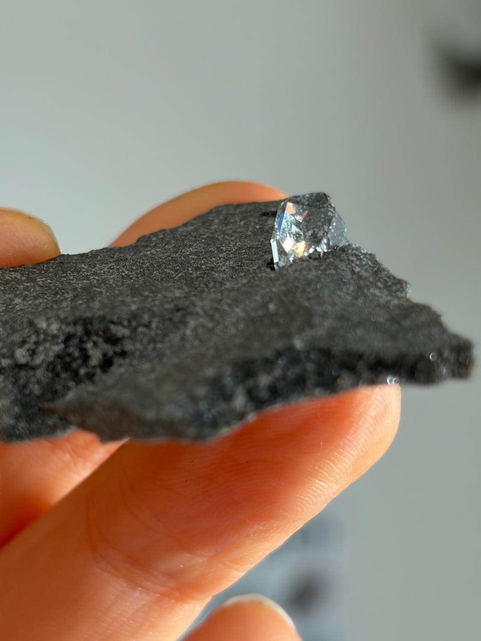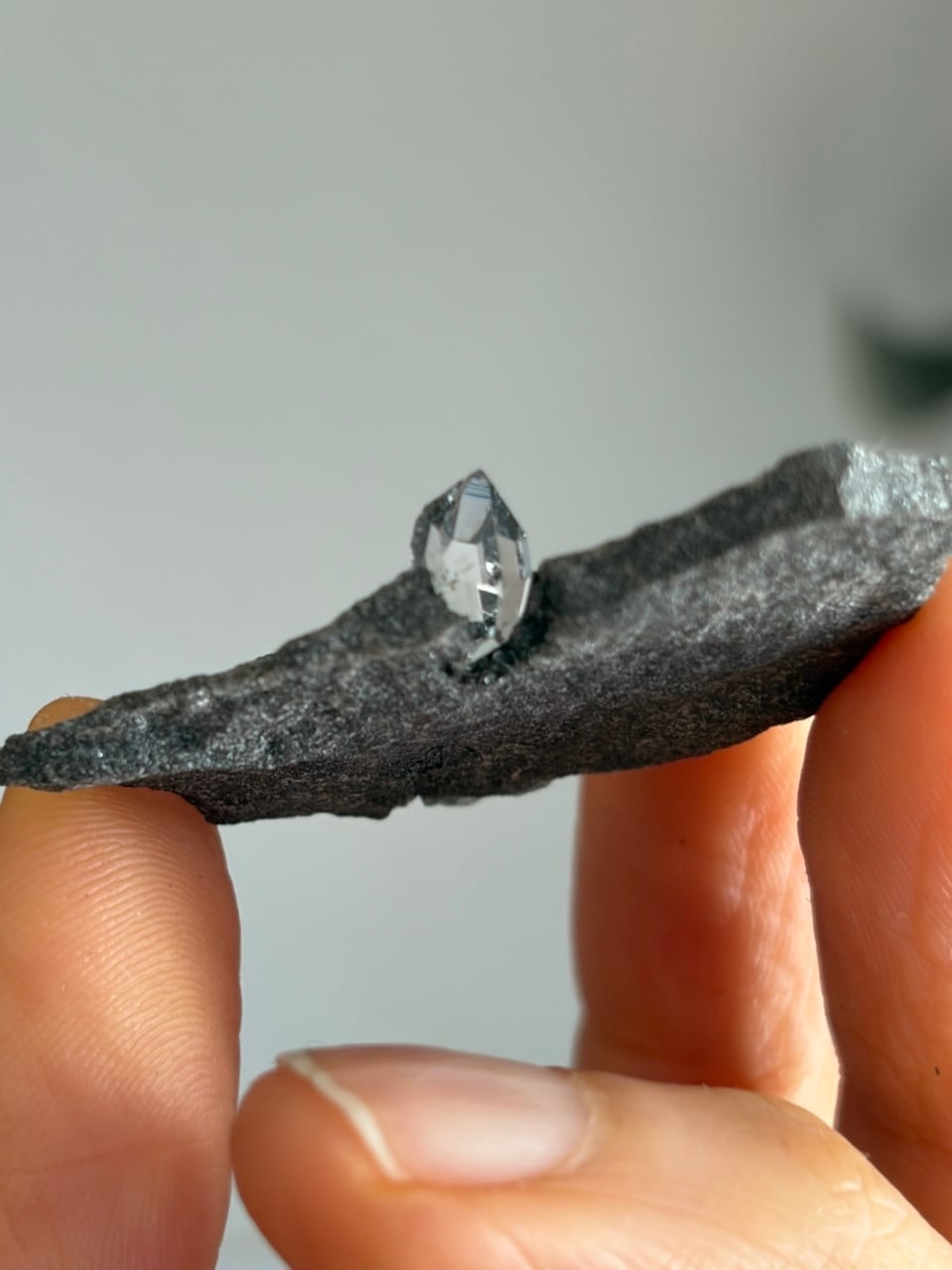 無骨な母岩の割れ目から、ひと粒の光が顔を出すハーキマーダイヤモンド。