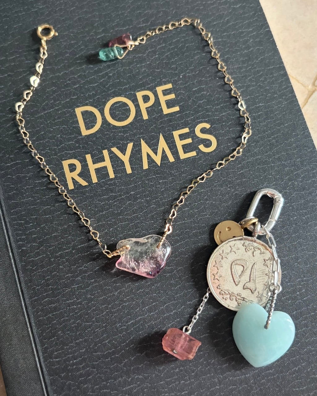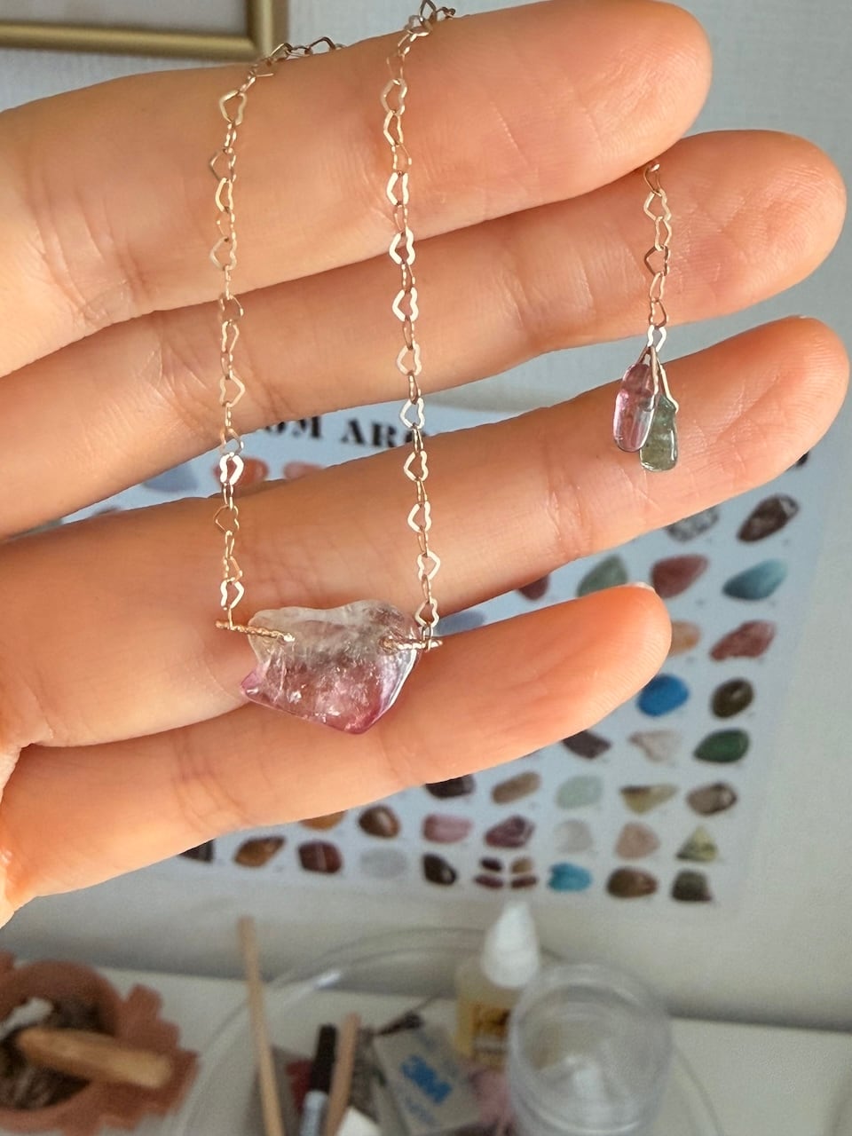 細く繊細なハートのチェーンが、甘すぎないバランスで相性抜群です。チェーンの先に小さなピンクトルマリンとグリーントルマリンを添えて、愛らしさとジュエリー感を楽しめるブレスレット。