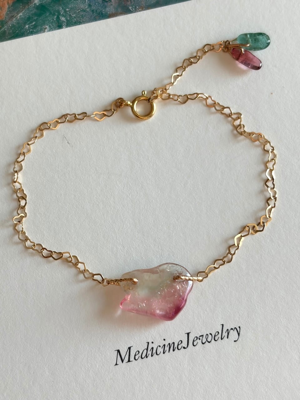 Earth Drop Bracelet ウォーターメロントルマリンとハートチェーンのブレスレット